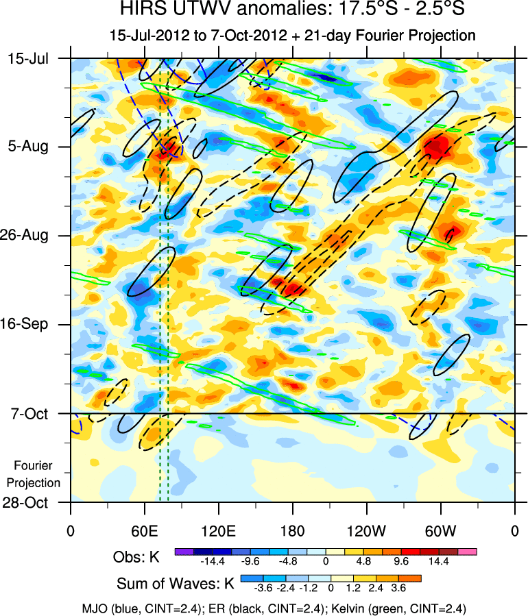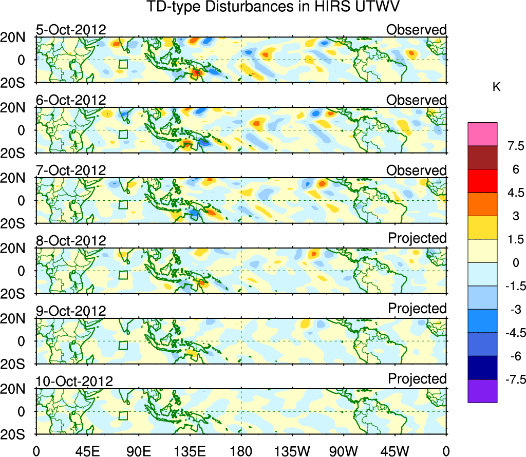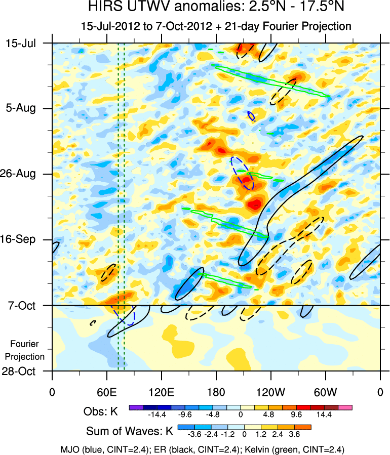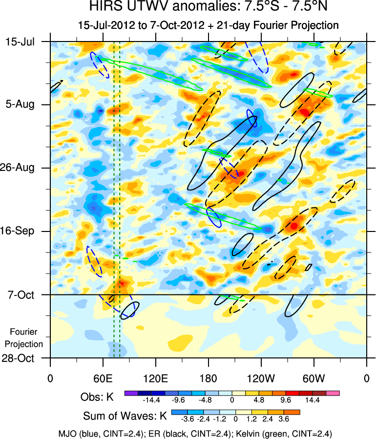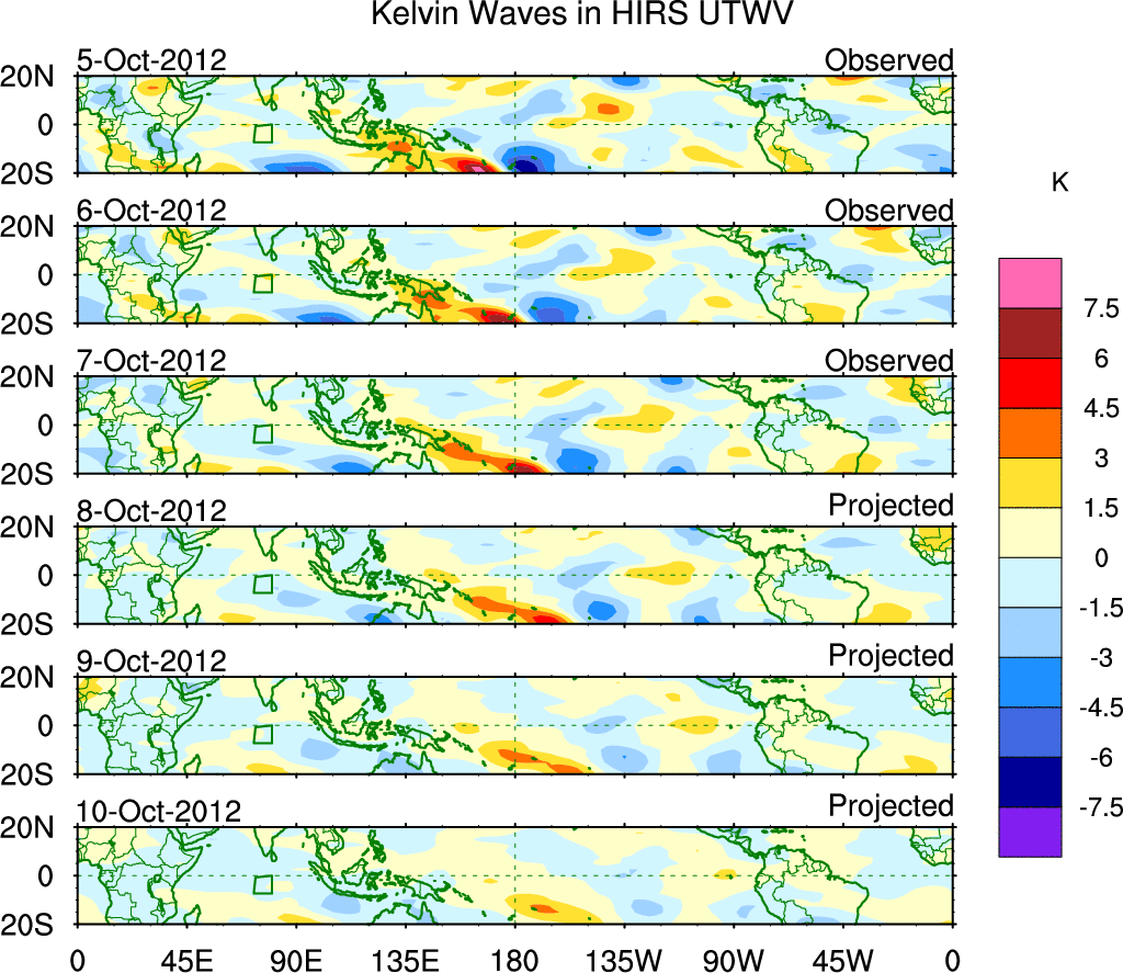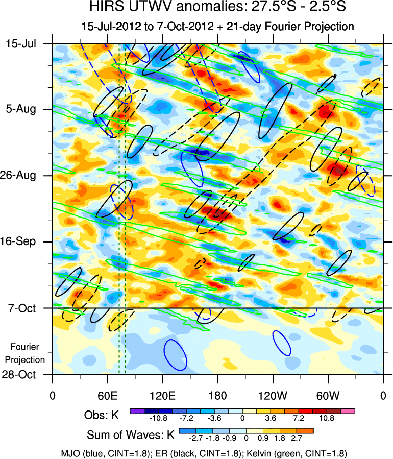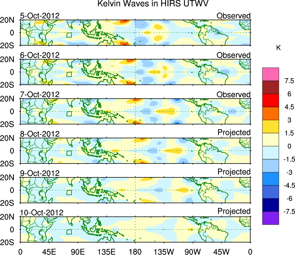 To identify tropical waves in near real-time, the OLR and UTWV data are filtered following Wheeler & Weickmann (2001 MWR). The daily anomalies are calculated using the first 3 harmonics of the seasonal cycle for 1979–2009. Missing values are then filled using linear interpolation in space and time. The most recent 365 days of anomalies are padded with 659 days of zeroes, and the result is filtered for each wave type.