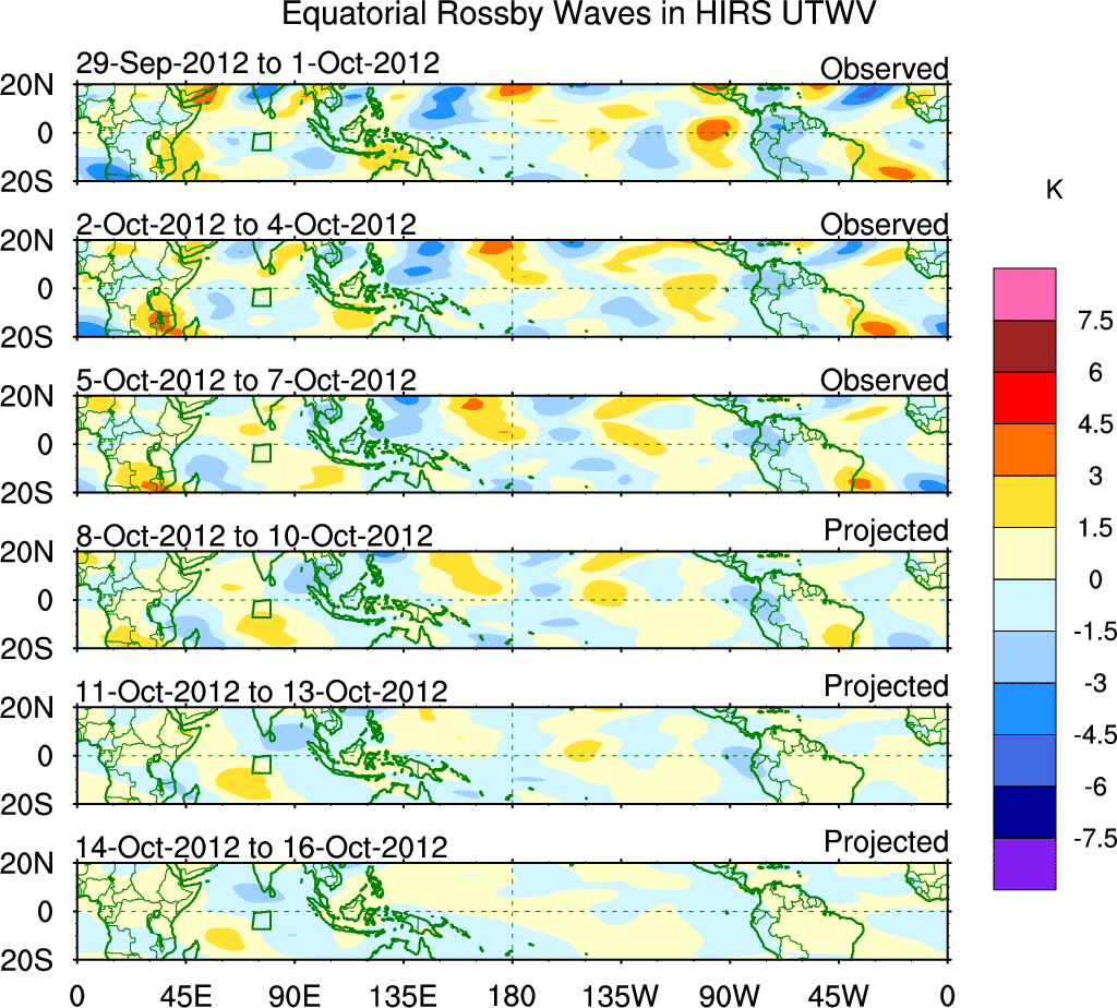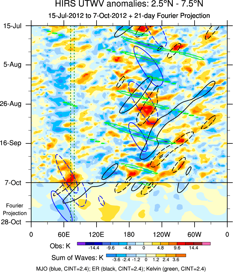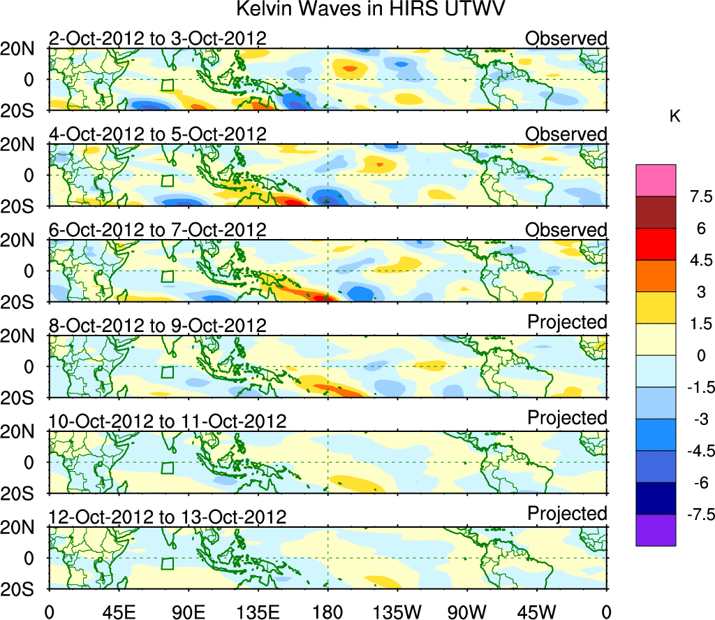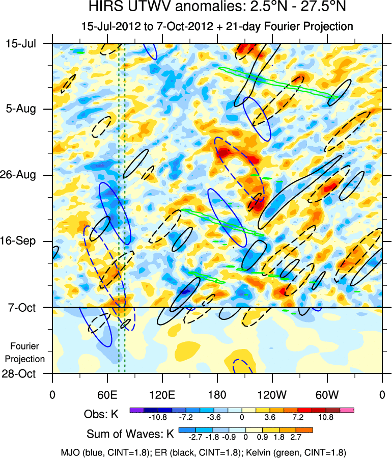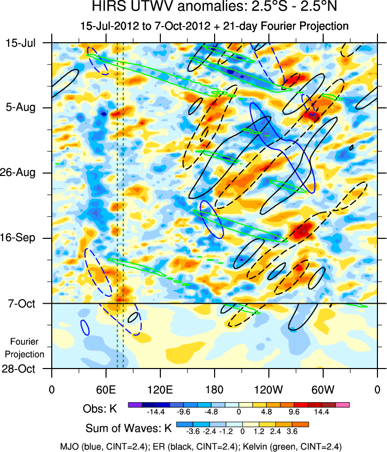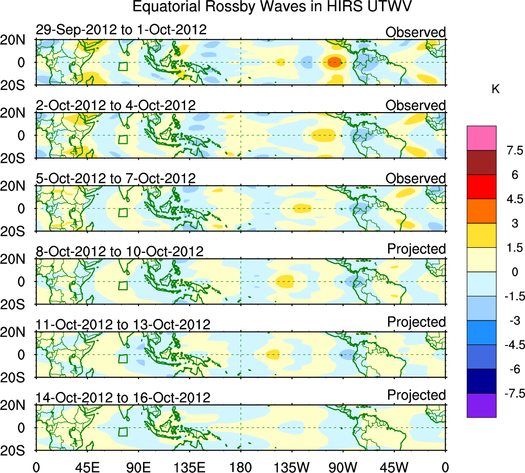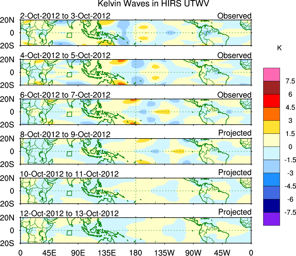 To identify tropical waves in near real-time, the OLR and UTWV data are filtered following Wheeler & Weickmann (2001 MWR). The daily anomalies are calculated using the first 3 harmonics of the seasonal cycle for 1979–2009. Missing values are then filled using linear interpolation in space and time. The most recent 365 days of anomalies are padded with 659 days of zeroes, and the result is filtered for each wave type.