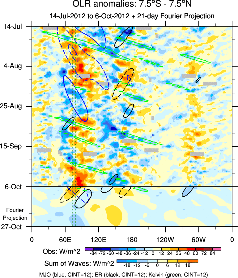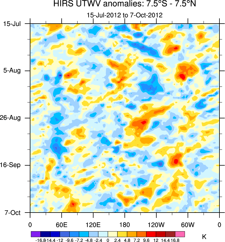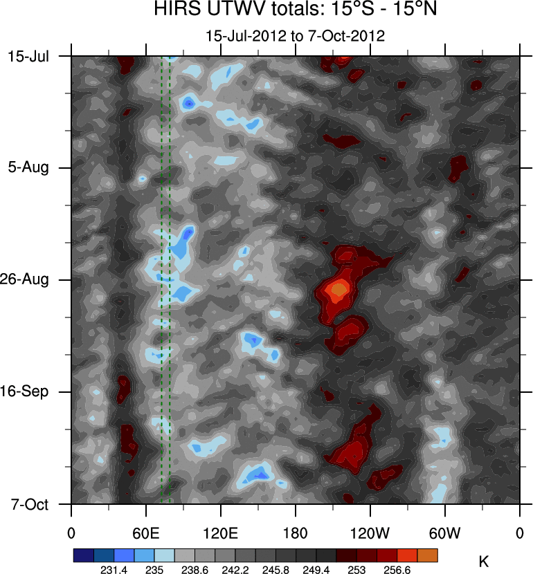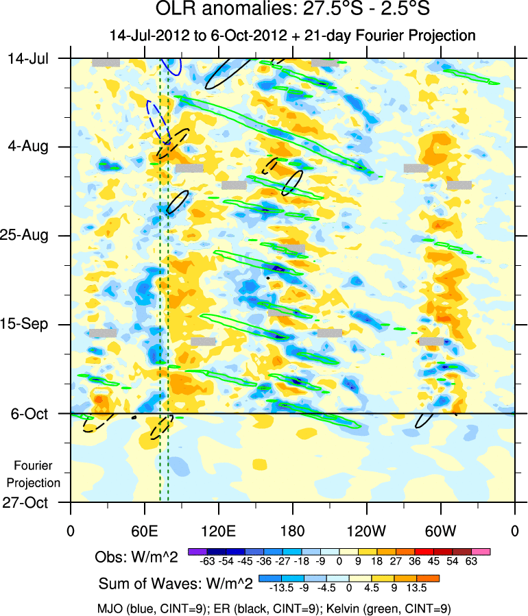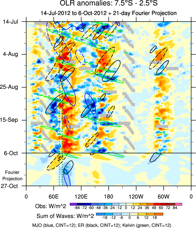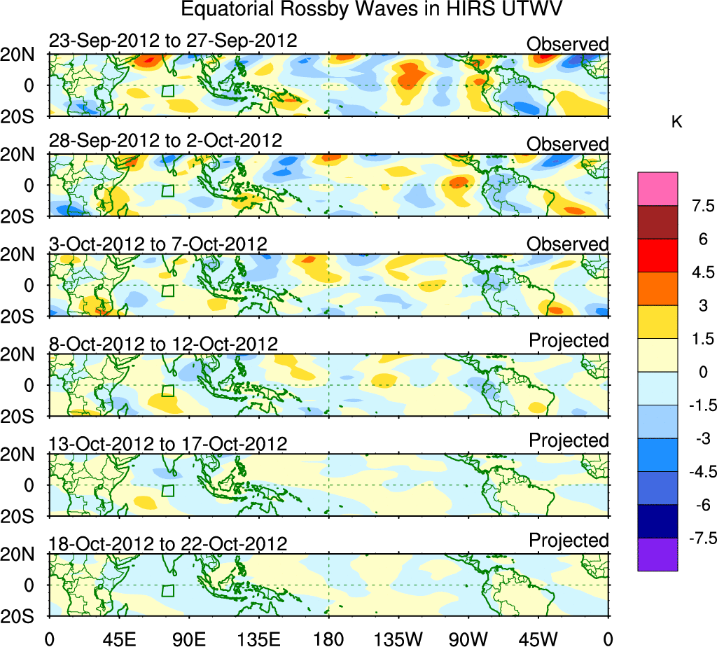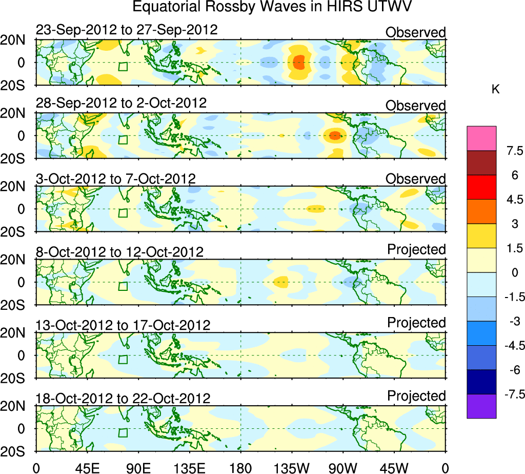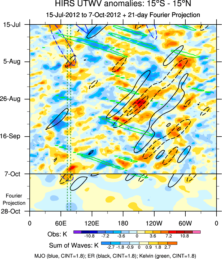 To identify tropical waves in near real-time, the OLR and UTWV data are filtered following Wheeler & Weickmann (2001 MWR). The daily anomalies are calculated using the first 3 harmonics of the seasonal cycle for 1979–2009. Missing values are then filled using linear interpolation in space and time. The most recent 365 days of anomalies are padded with 659 days of zeroes, and the result is filtered for each wave type.