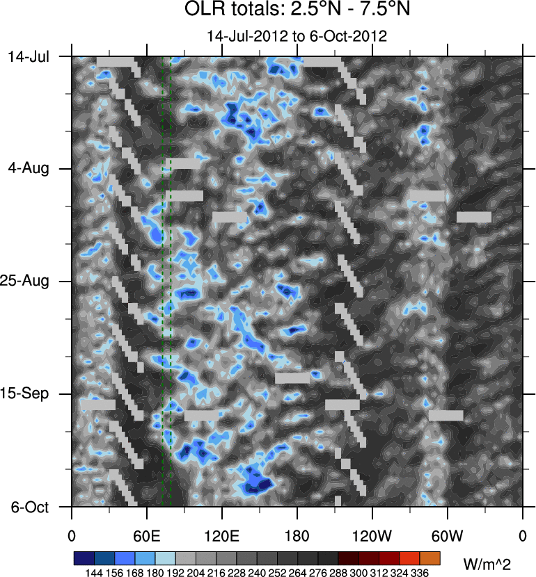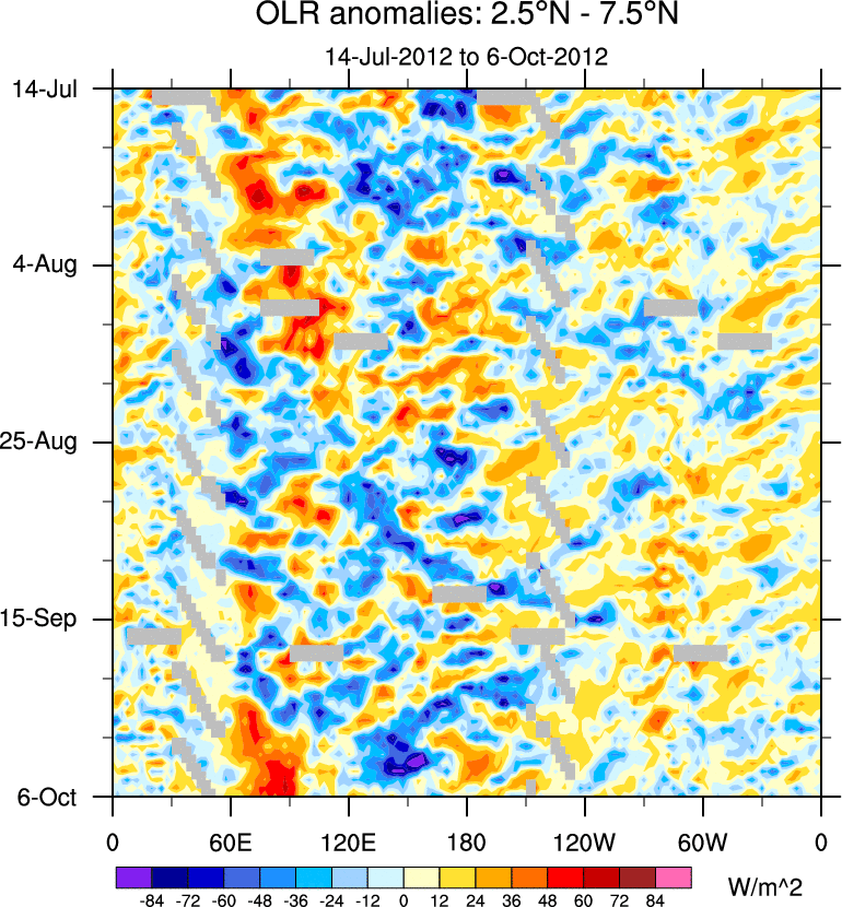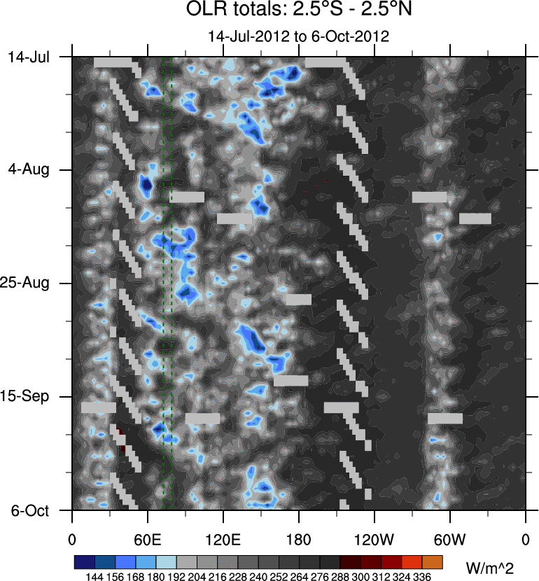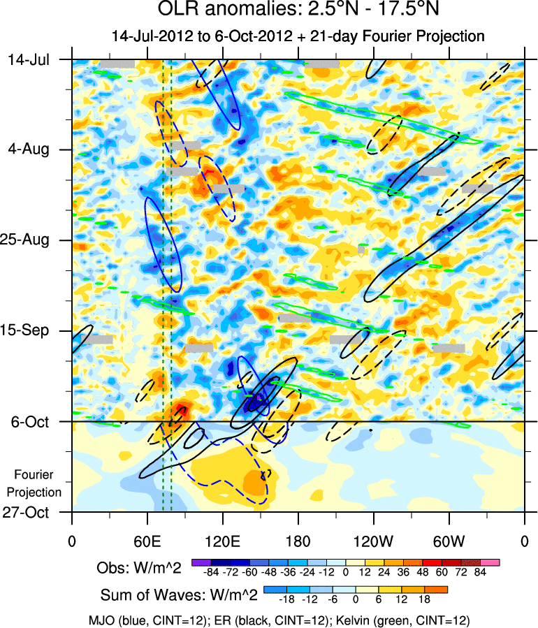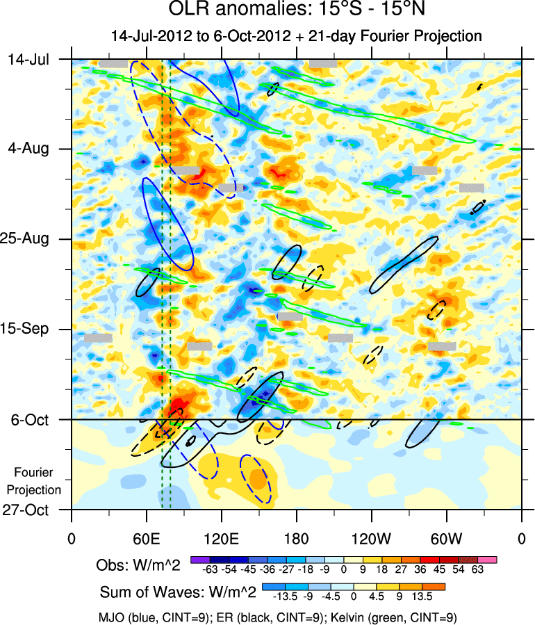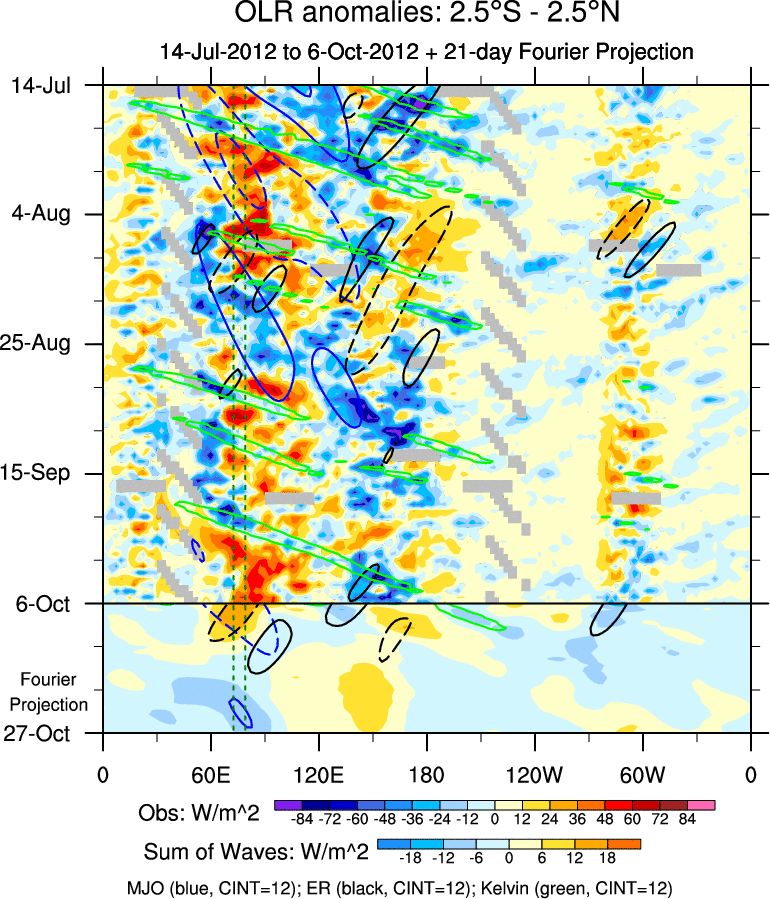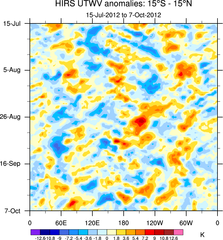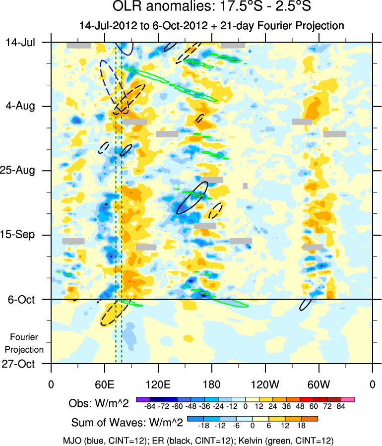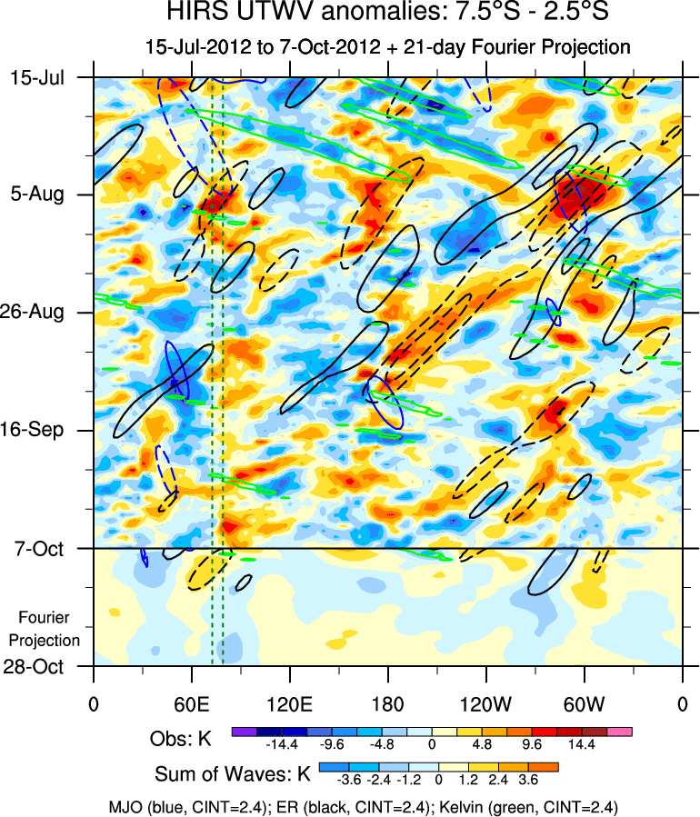 To identify tropical waves in near real-time, the OLR and UTWV data are filtered following Wheeler & Weickmann (2001 MWR). The daily anomalies are calculated using the first 3 harmonics of the seasonal cycle for 1979–2009. Missing values are then filled using linear interpolation in space and time. The most recent 365 days of anomalies are padded with 659 days of zeroes, and the result is filtered for each wave type.