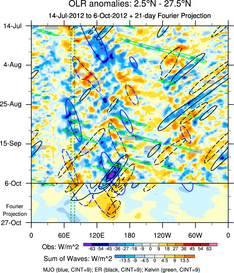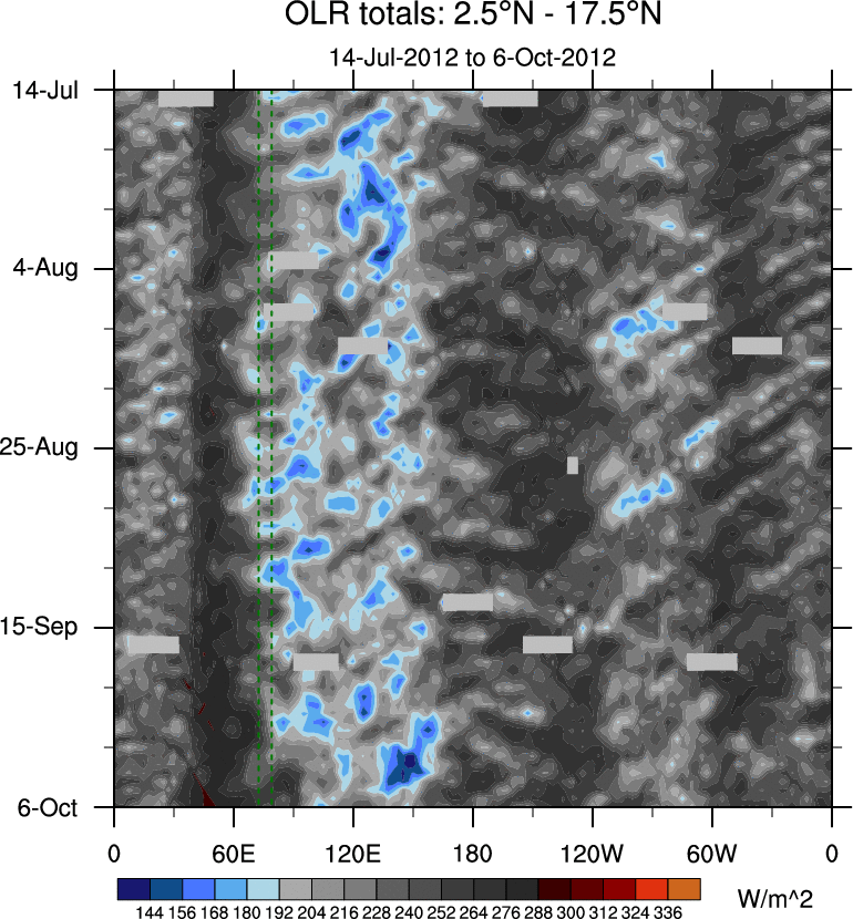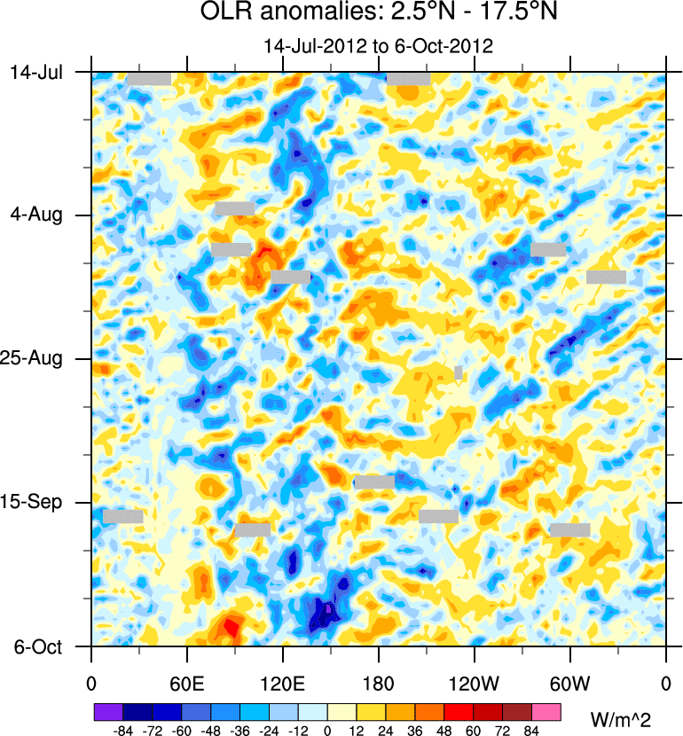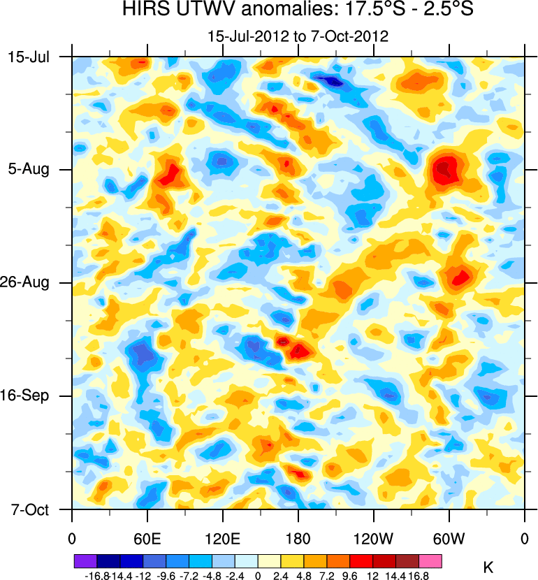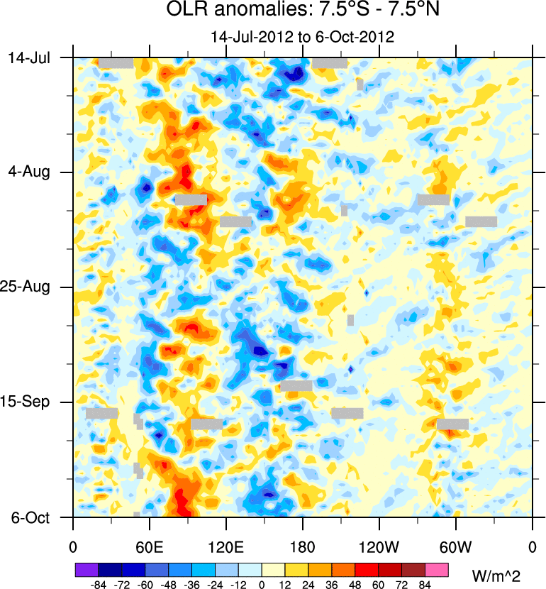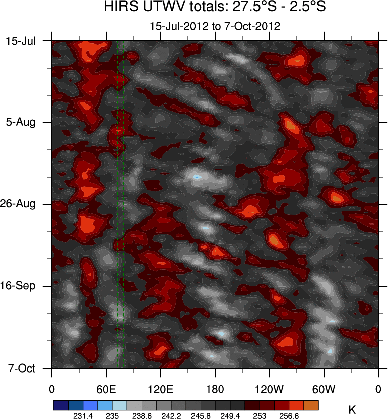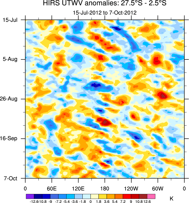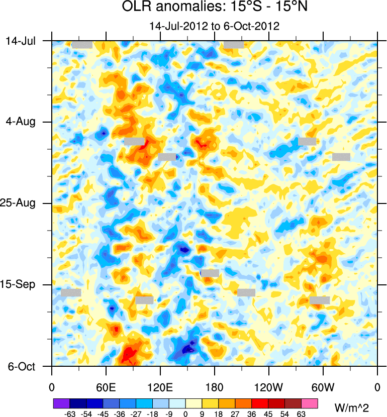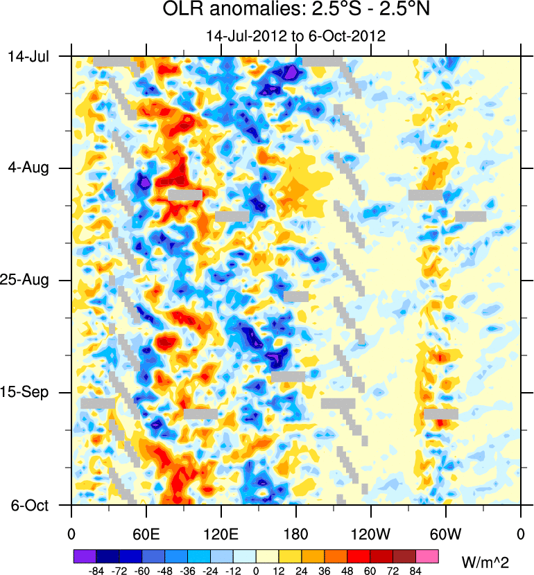 To identify tropical waves in near real-time, the OLR and UTWV data are filtered following Wheeler & Weickmann (2001 MWR). The daily anomalies are calculated using the first 3 harmonics of the seasonal cycle for 1979–2009. Missing values are then filled using linear interpolation in space and time. The most recent 365 days of anomalies are padded with 659 days of zeroes, and the result is filtered for each wave type.