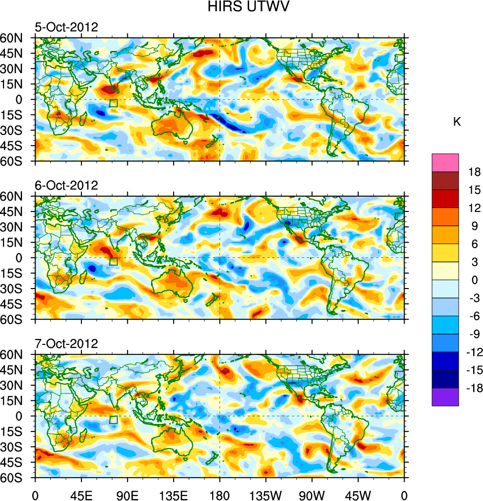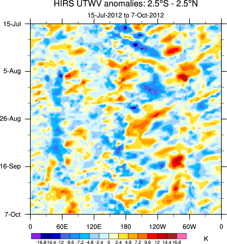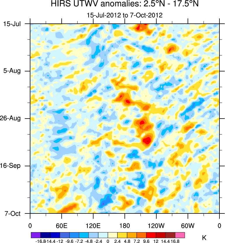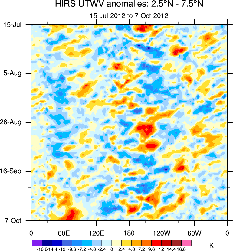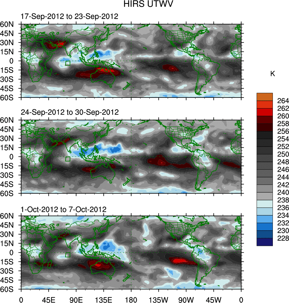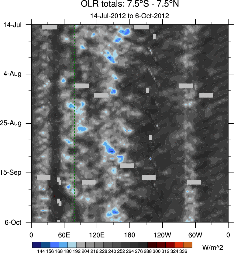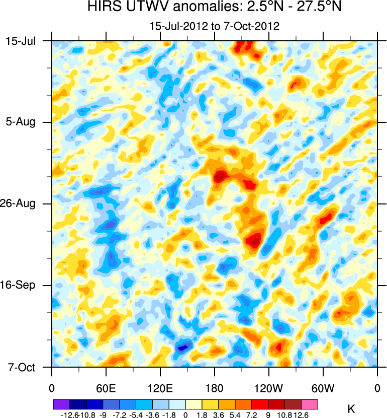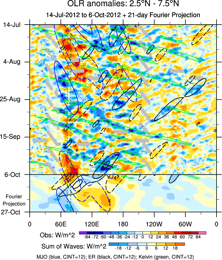To identify tropical waves in near real-time, the OLR and UTWV data are filtered following Wheeler & Weickmann (2001 MWR). The daily anomalies are calculated using the first 3 harmonics of the seasonal cycle for 1979–2009. Missing values are then filled using linear interpolation in space and time. The most recent 365 days of anomalies are padded with 659 days of zeroes, and the result is filtered for each wave type.