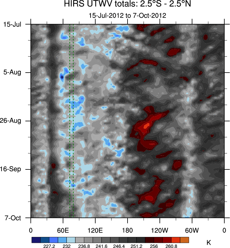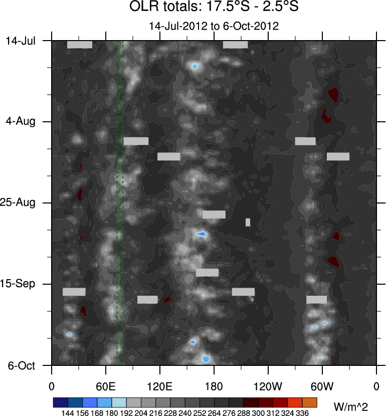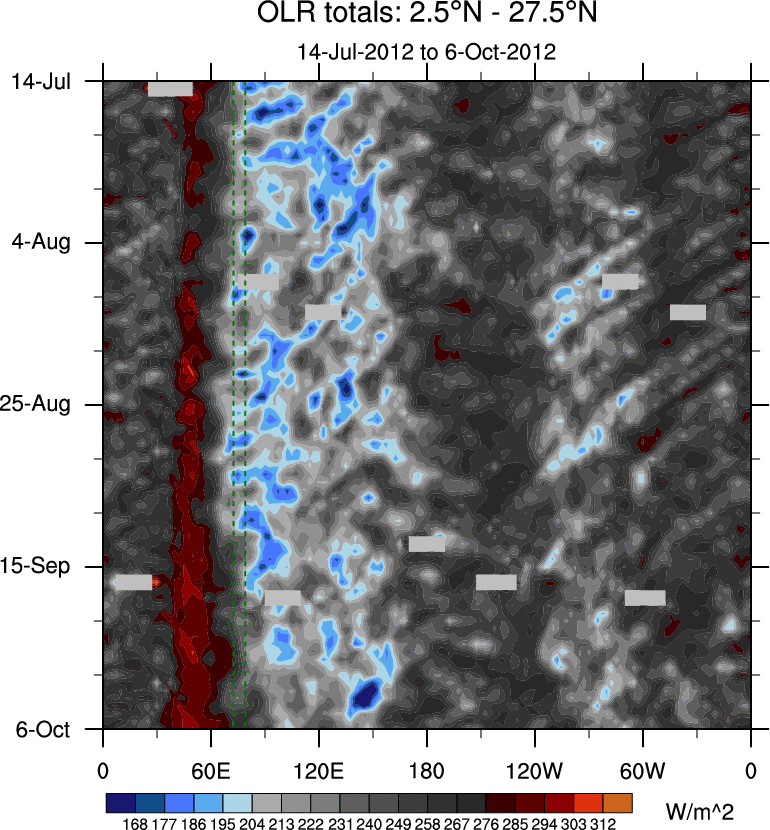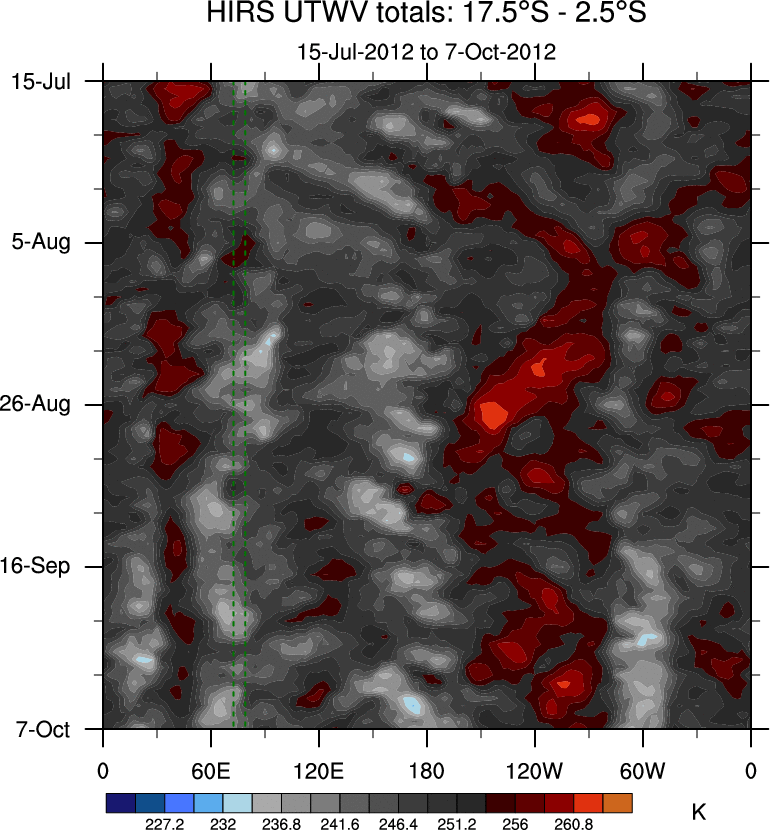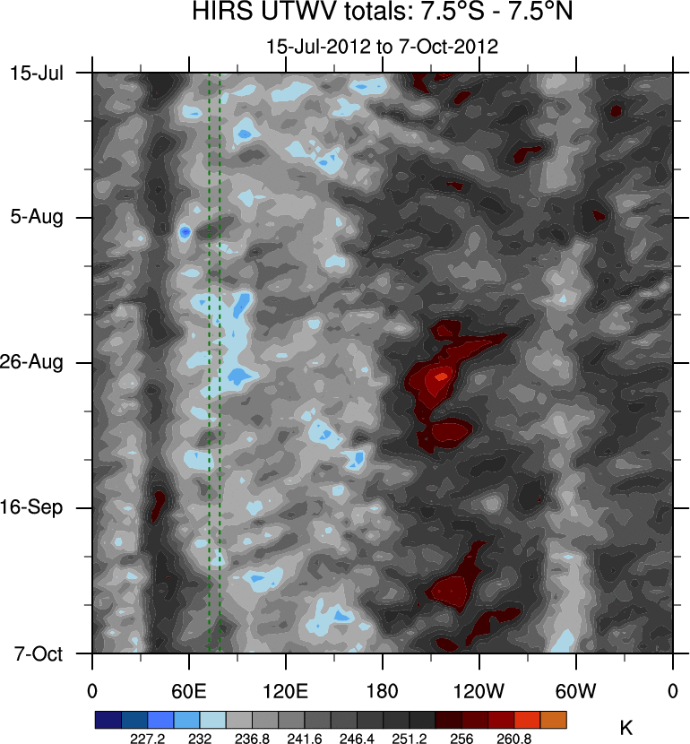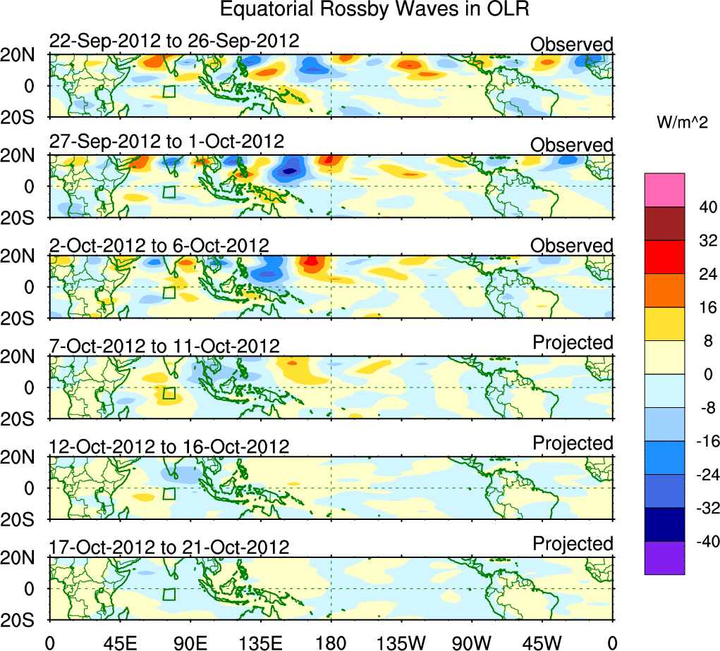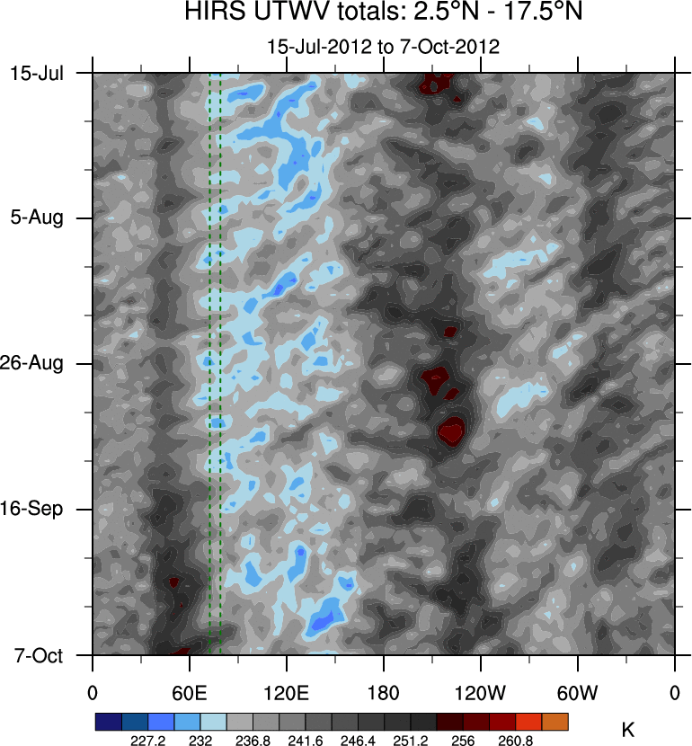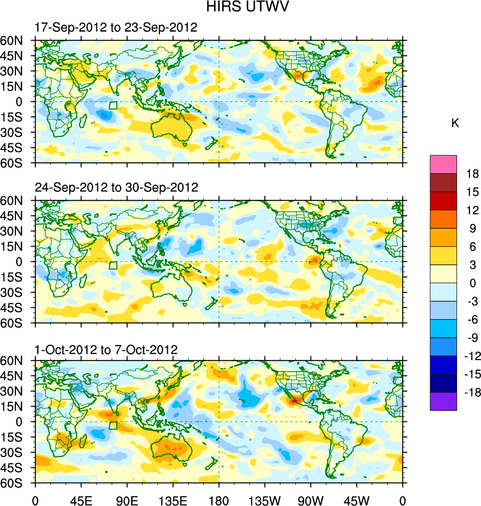 To identify tropical waves in near real-time, the OLR and UTWV data are filtered following Wheeler & Weickmann (2001 MWR). The daily anomalies are calculated using the first 3 harmonics of the seasonal cycle for 1979–2009. Missing values are then filled using linear interpolation in space and time. The most recent 365 days of anomalies are padded with 659 days of zeroes, and the result is filtered for each wave type.