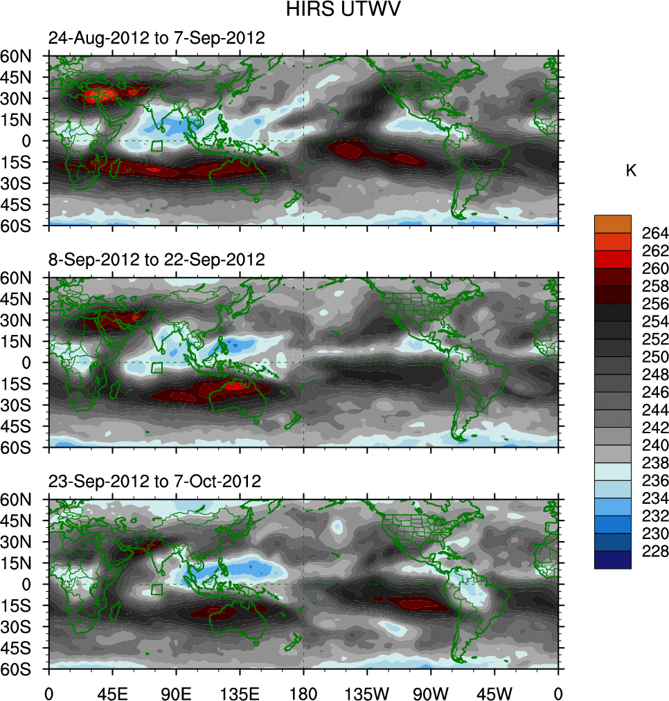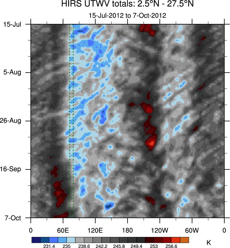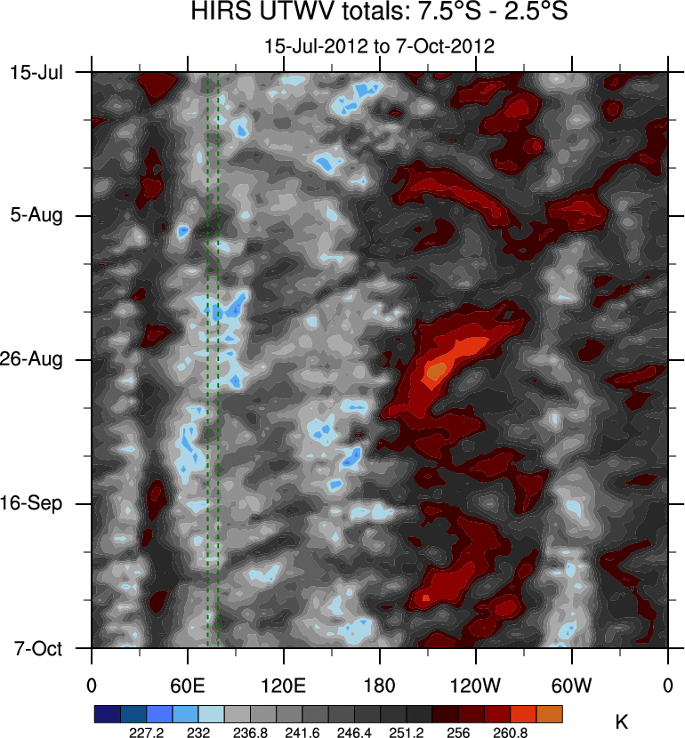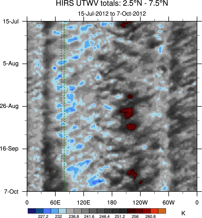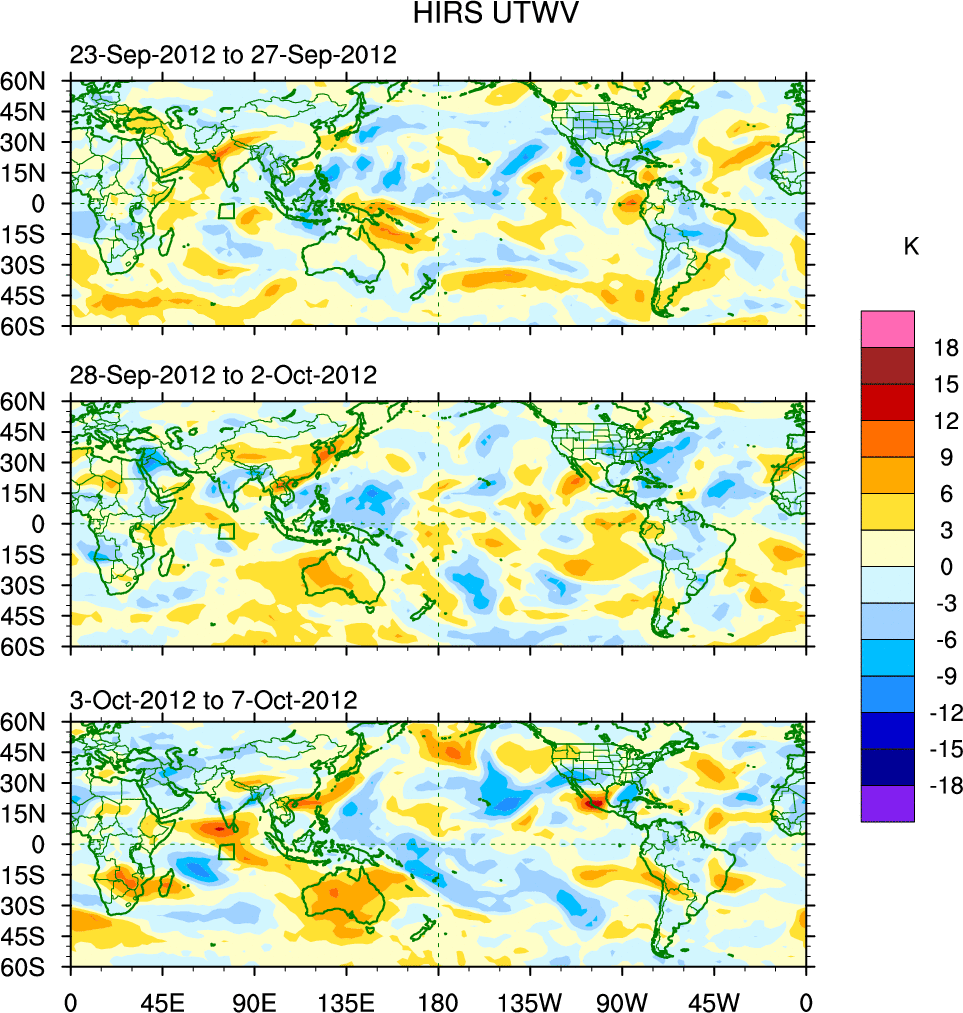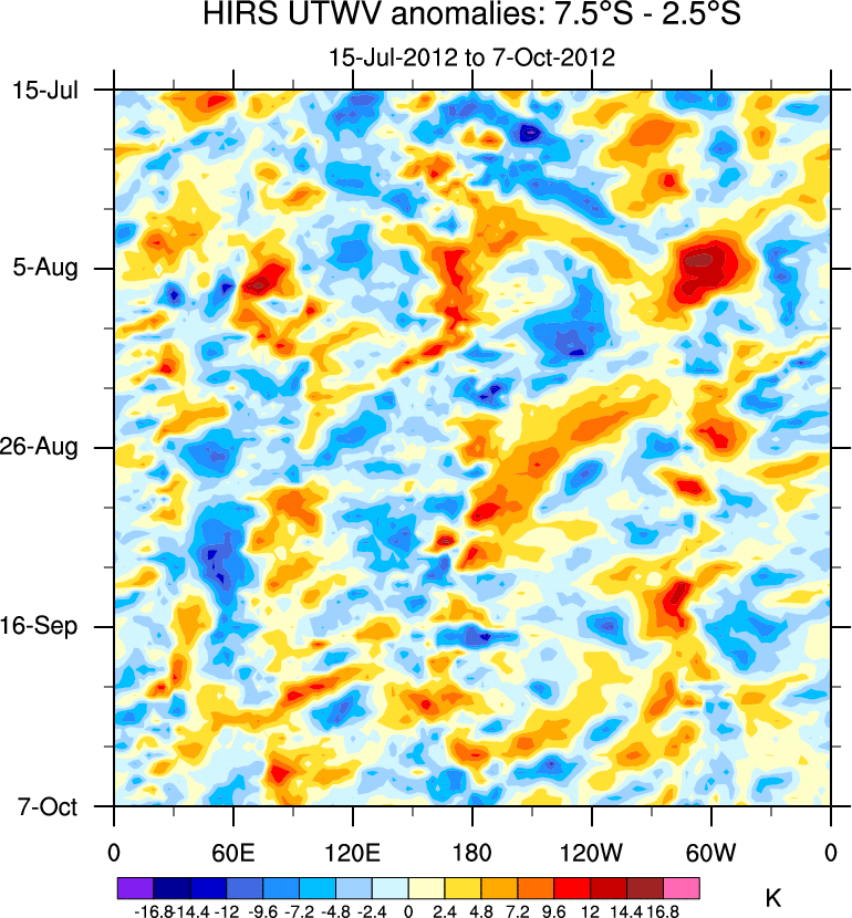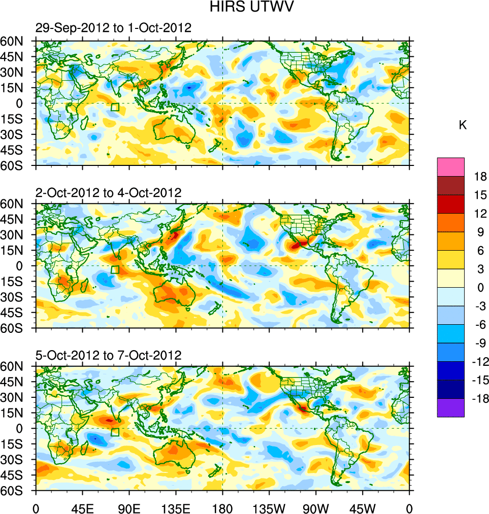 To identify tropical waves in near real-time, the OLR and UTWV data are filtered following Wheeler & Weickmann (2001 MWR). The daily anomalies are calculated using the first 3 harmonics of the seasonal cycle for 1979–2009. Missing values are then filled using linear interpolation in space and time. The most recent 365 days of anomalies are padded with 659 days of zeroes, and the result is filtered for each wave type.