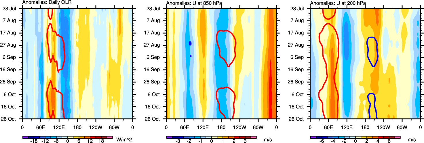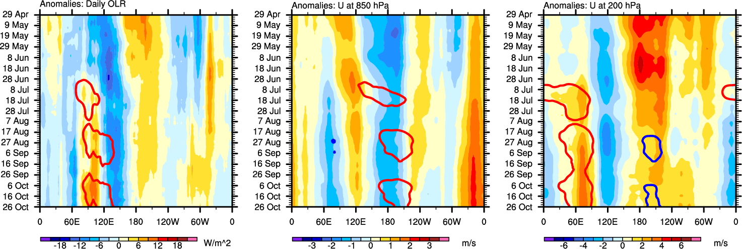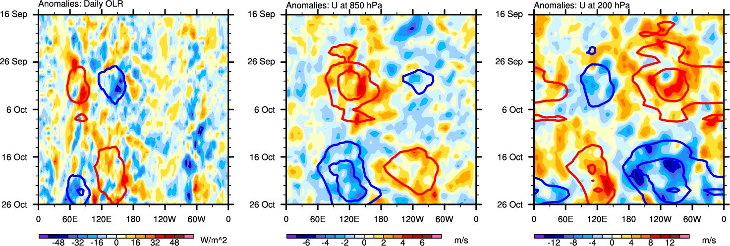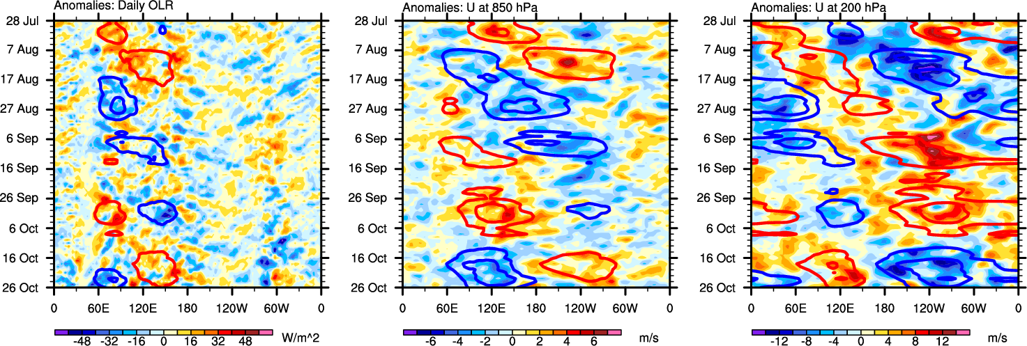 The Hovmollers show longitude-time plots for OLR, U-850, and U-200. The shading indicates the observed anomalies, while the contours are the projection of those anomalies onto the RMM EOFs.
