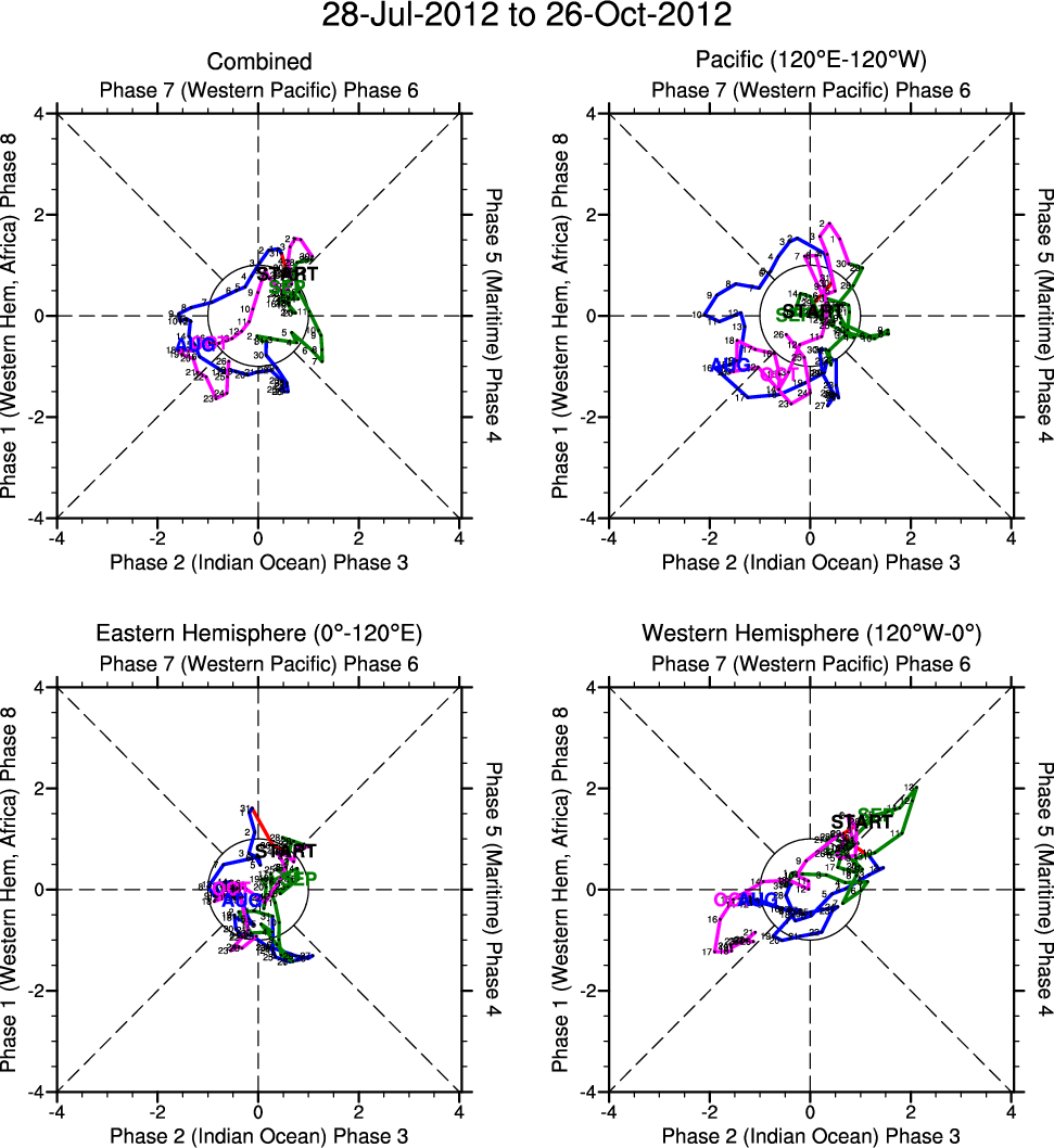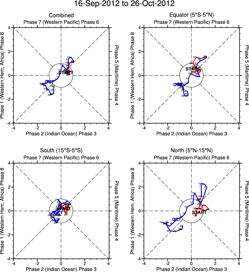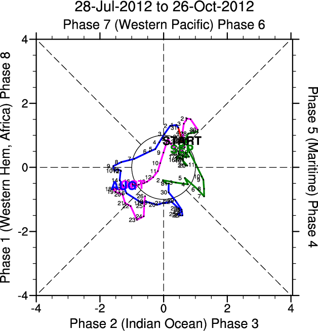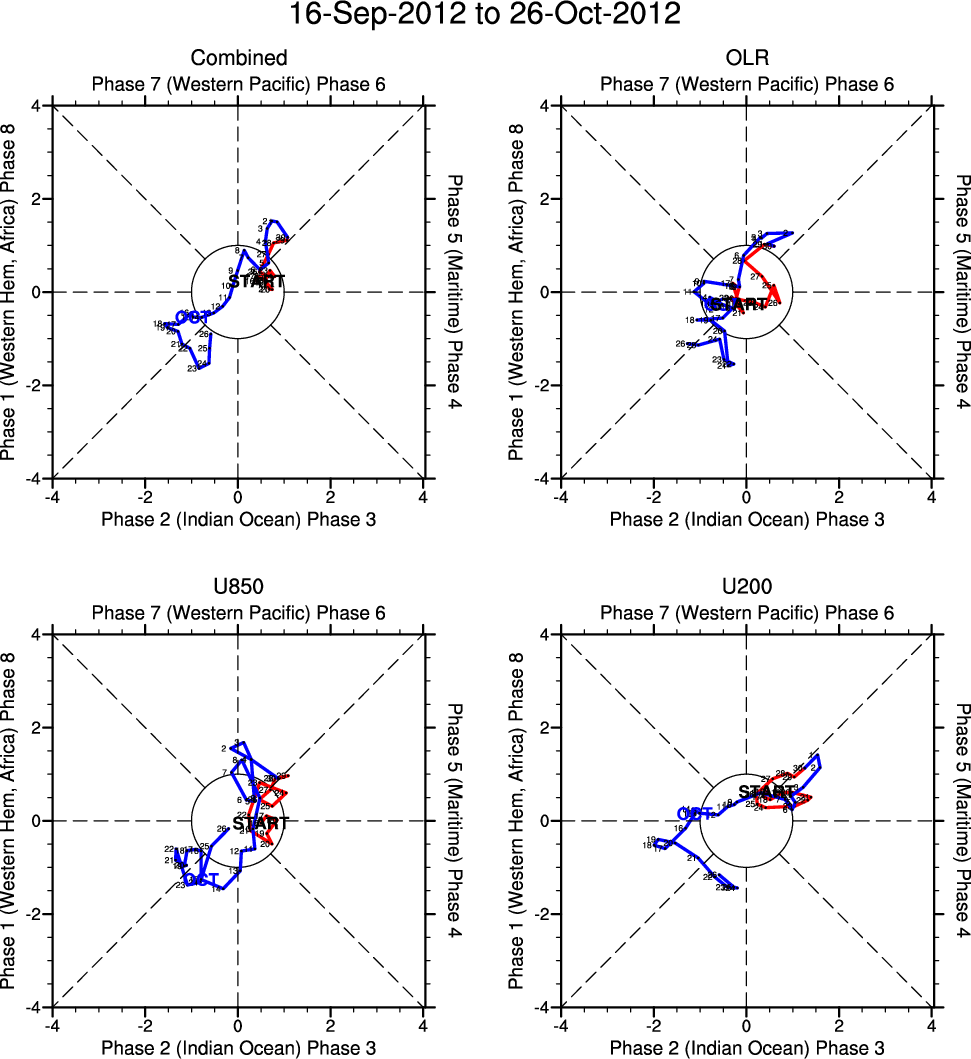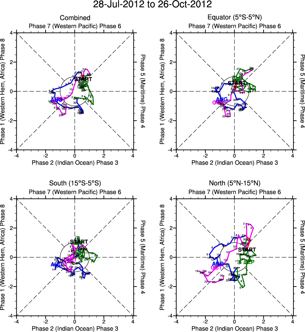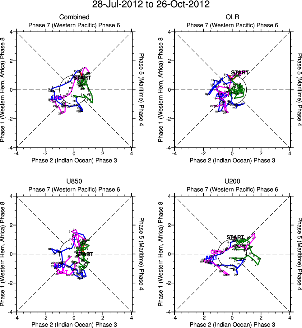 Wheeler and Hendon (2004) constructed the RMM index for monitoring the MJO. This index consists of the first two principal components (PCs) of OLR, 850-hPa zonal wind, and 200-hPa zonal wind averaged 15S-15N.