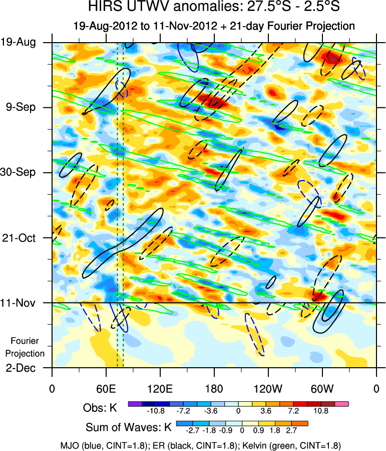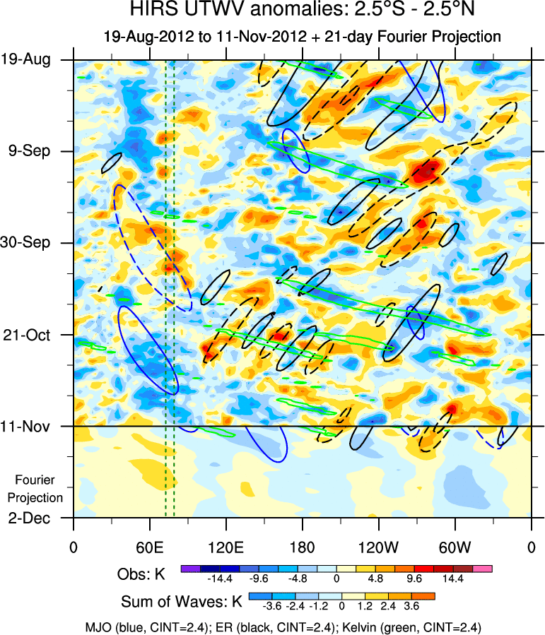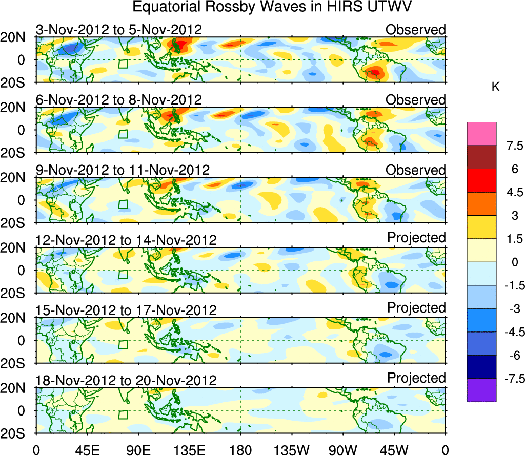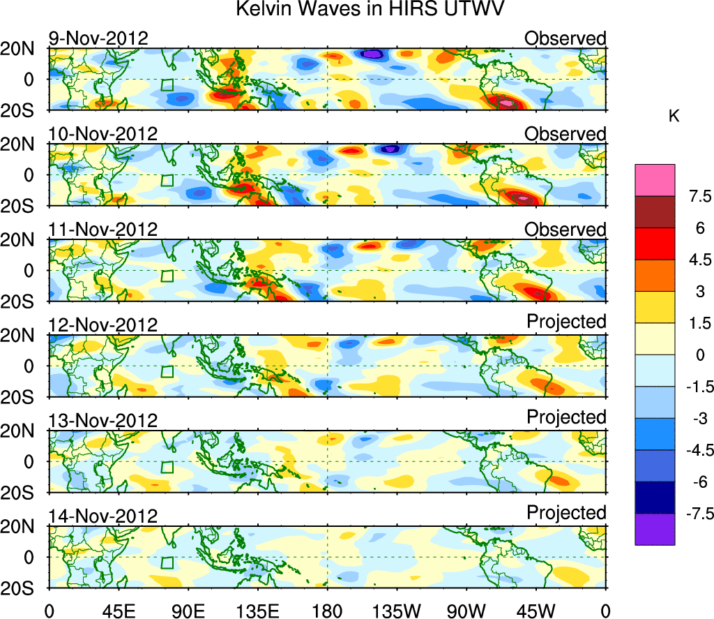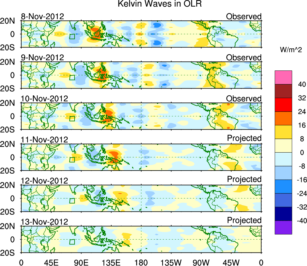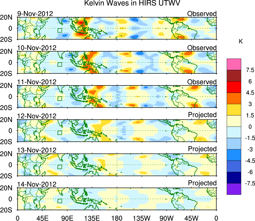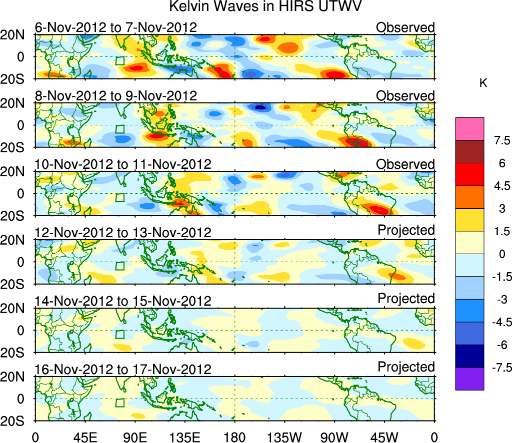 To identify tropical waves in near real-time, the OLR and UTWV data are filtered following Wheeler & Weickmann (2001 MWR). The daily anomalies are calculated using the first 3 harmonics of the seasonal cycle for 1979–2009. Missing values are then filled using linear interpolation in space and time. The most recent 365 days of anomalies are padded with 659 days of zeroes, and the result is filtered for each wave type.