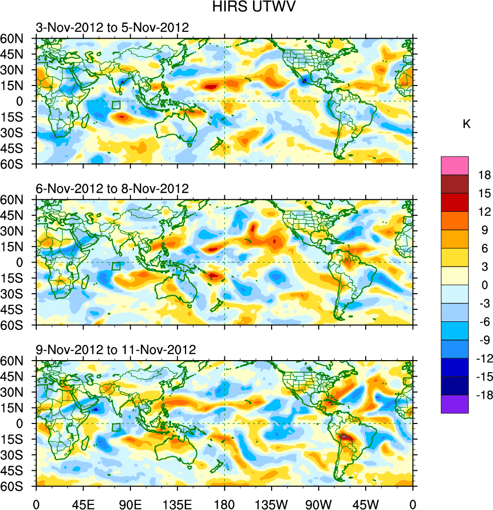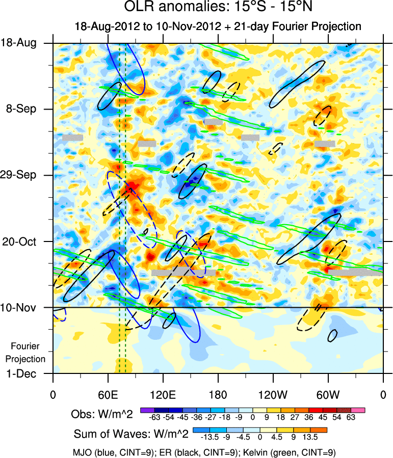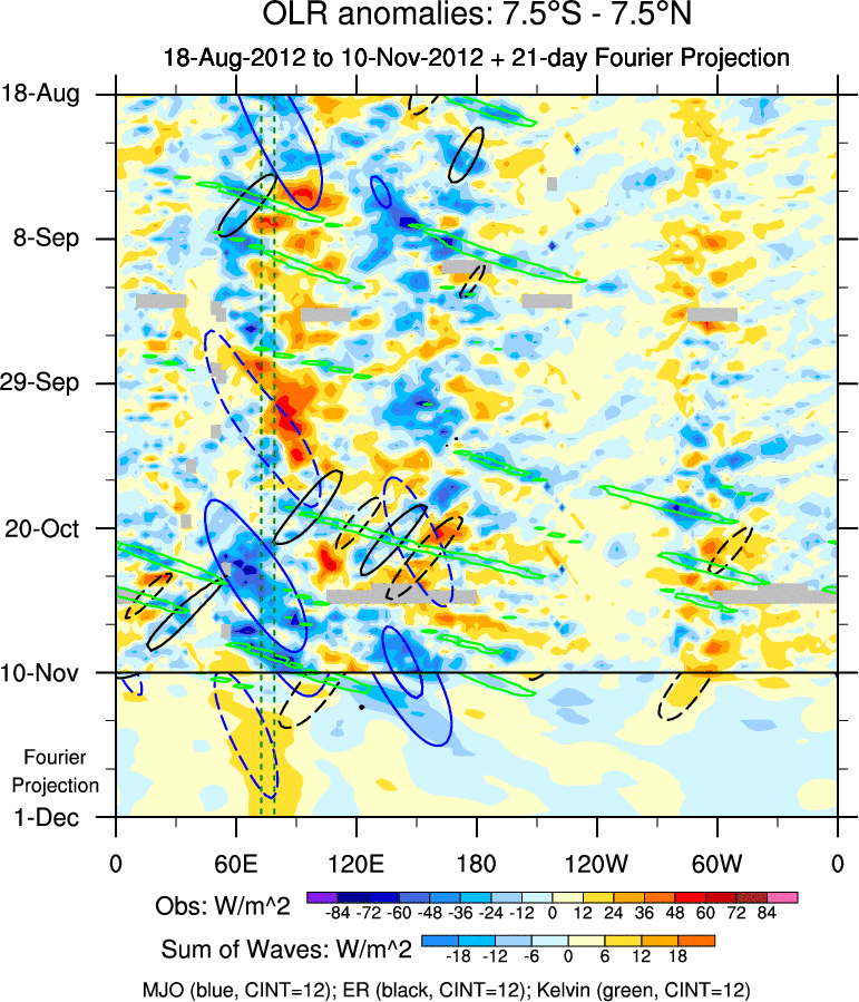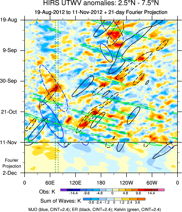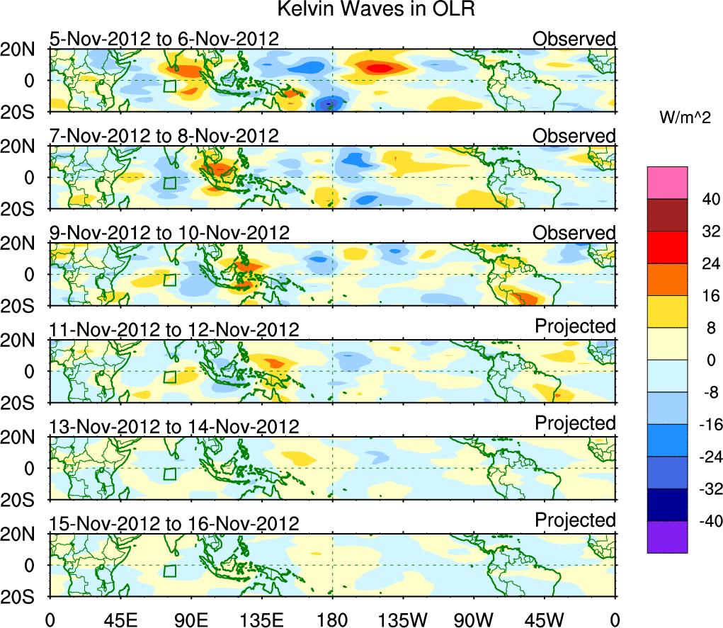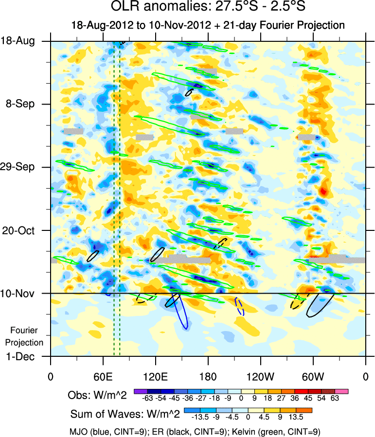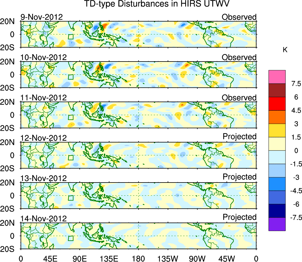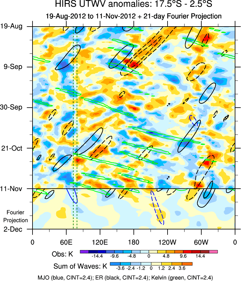 To identify tropical waves in near real-time, the OLR and UTWV data are filtered following Wheeler & Weickmann (2001 MWR). The daily anomalies are calculated using the first 3 harmonics of the seasonal cycle for 1979–2009. Missing values are then filled using linear interpolation in space and time. The most recent 365 days of anomalies are padded with 659 days of zeroes, and the result is filtered for each wave type.