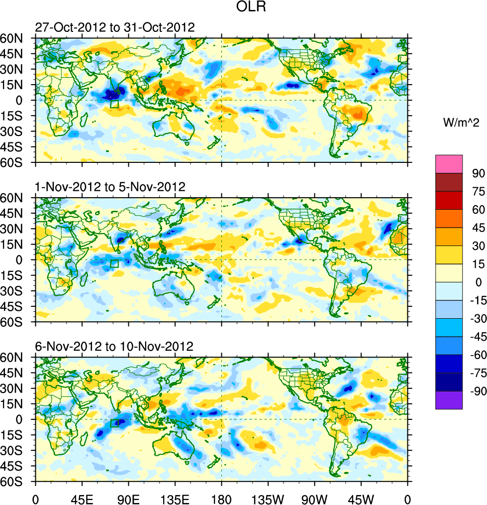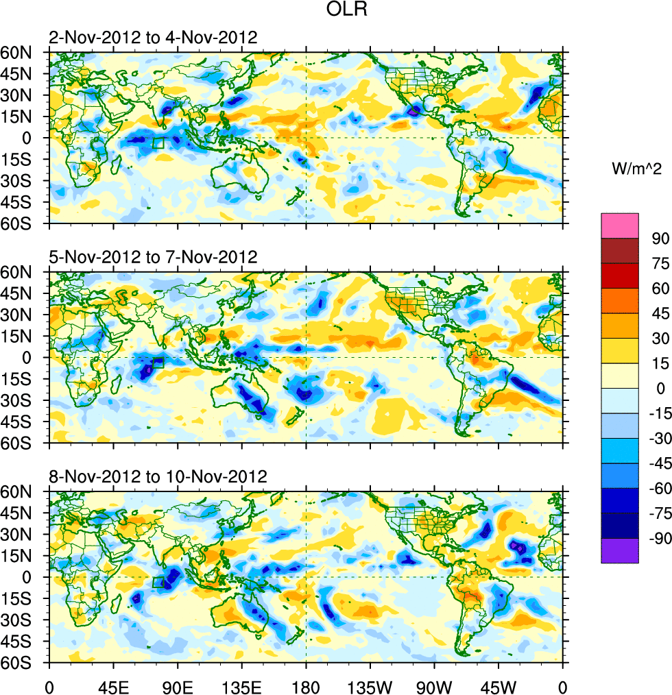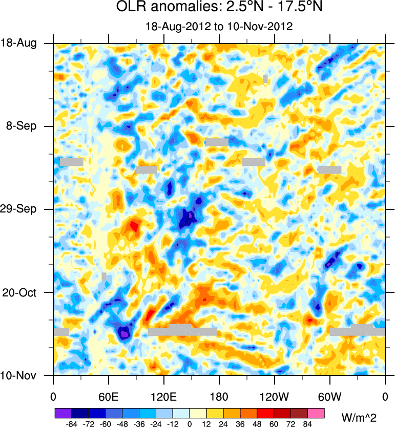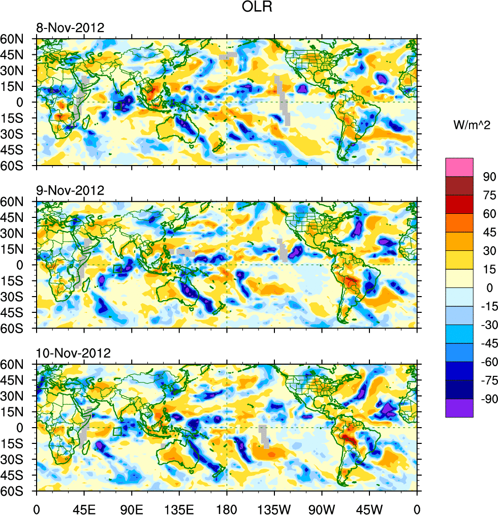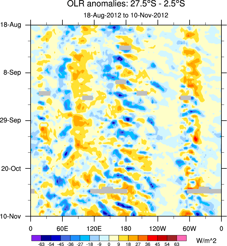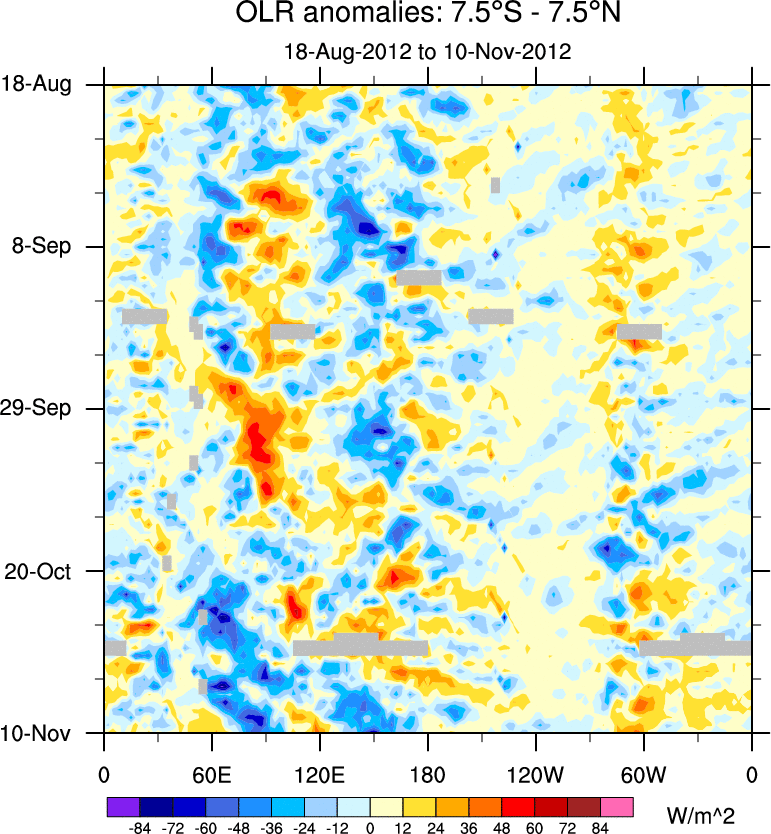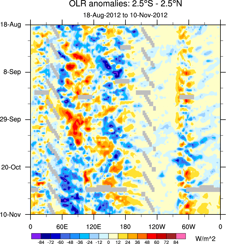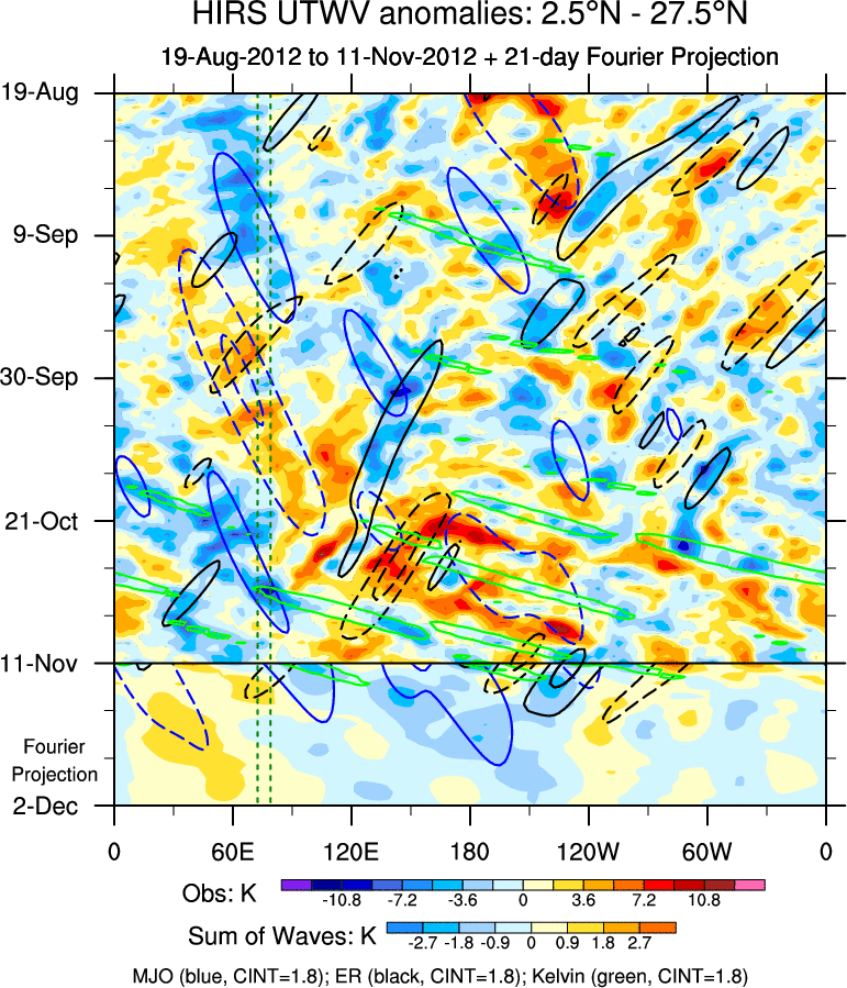 To identify tropical waves in near real-time, the OLR and UTWV data are filtered following Wheeler & Weickmann (2001 MWR). The daily anomalies are calculated using the first 3 harmonics of the seasonal cycle for 1979–2009. Missing values are then filled using linear interpolation in space and time. The most recent 365 days of anomalies are padded with 659 days of zeroes, and the result is filtered for each wave type.