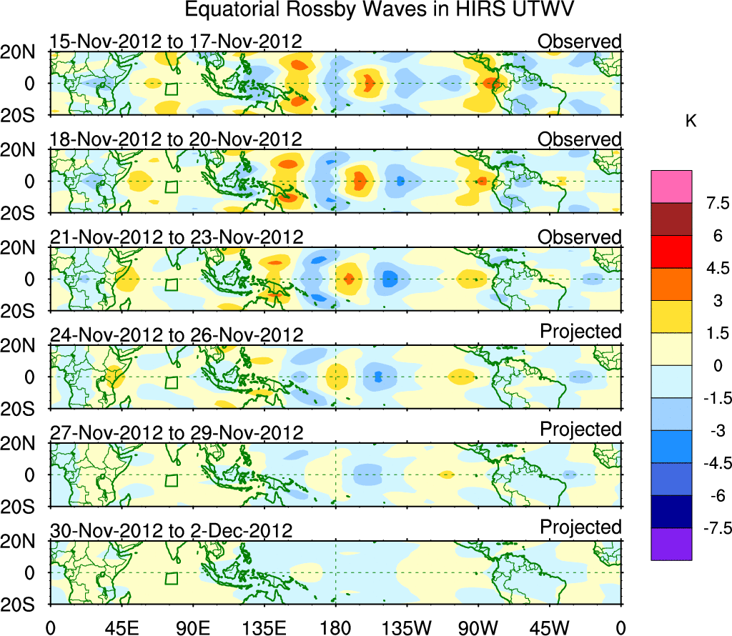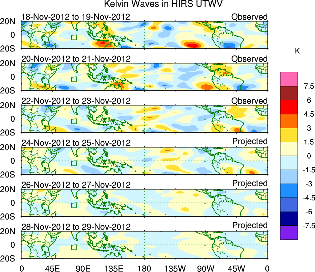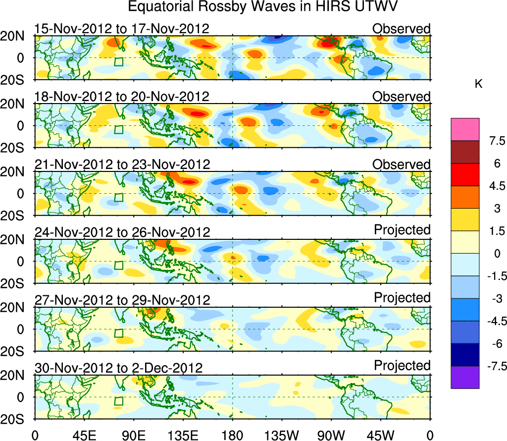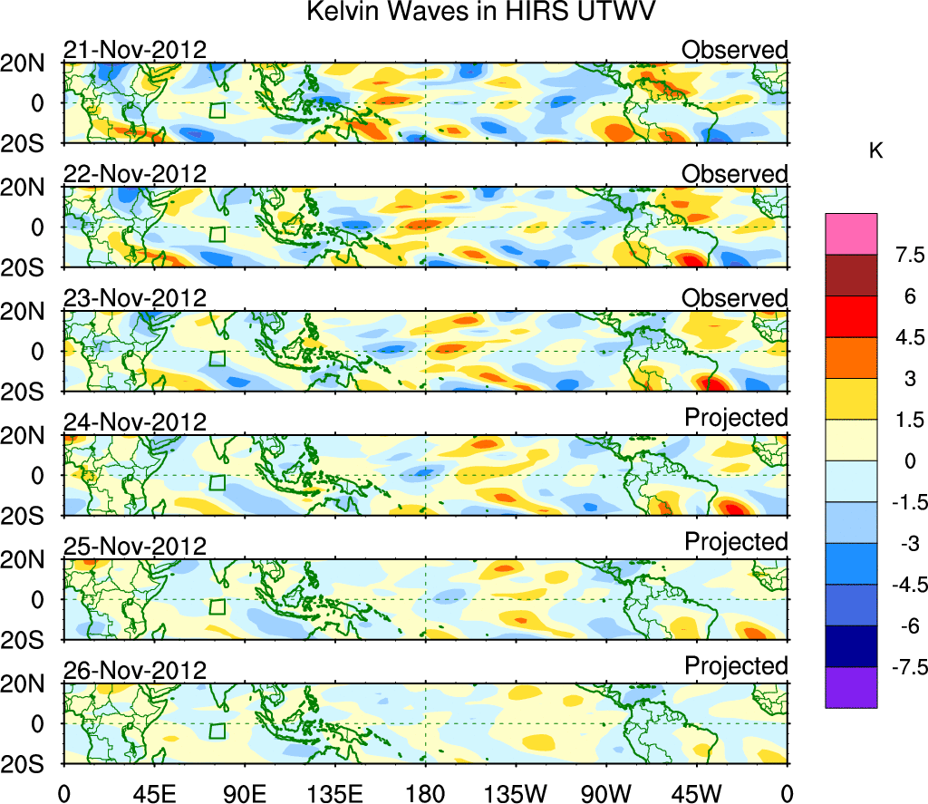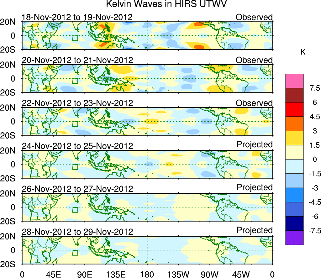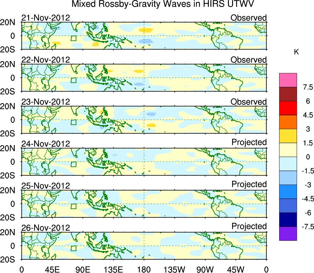 To identify tropical waves in near real-time, the OLR and UTWV data are filtered following Wheeler & Weickmann (2001 MWR). The daily anomalies are calculated using the first 3 harmonics of the seasonal cycle for 1979–2009. Missing values are then filled using linear interpolation in space and time. The most recent 365 days of anomalies are padded with 659 days of zeroes, and the result is filtered for each wave type.