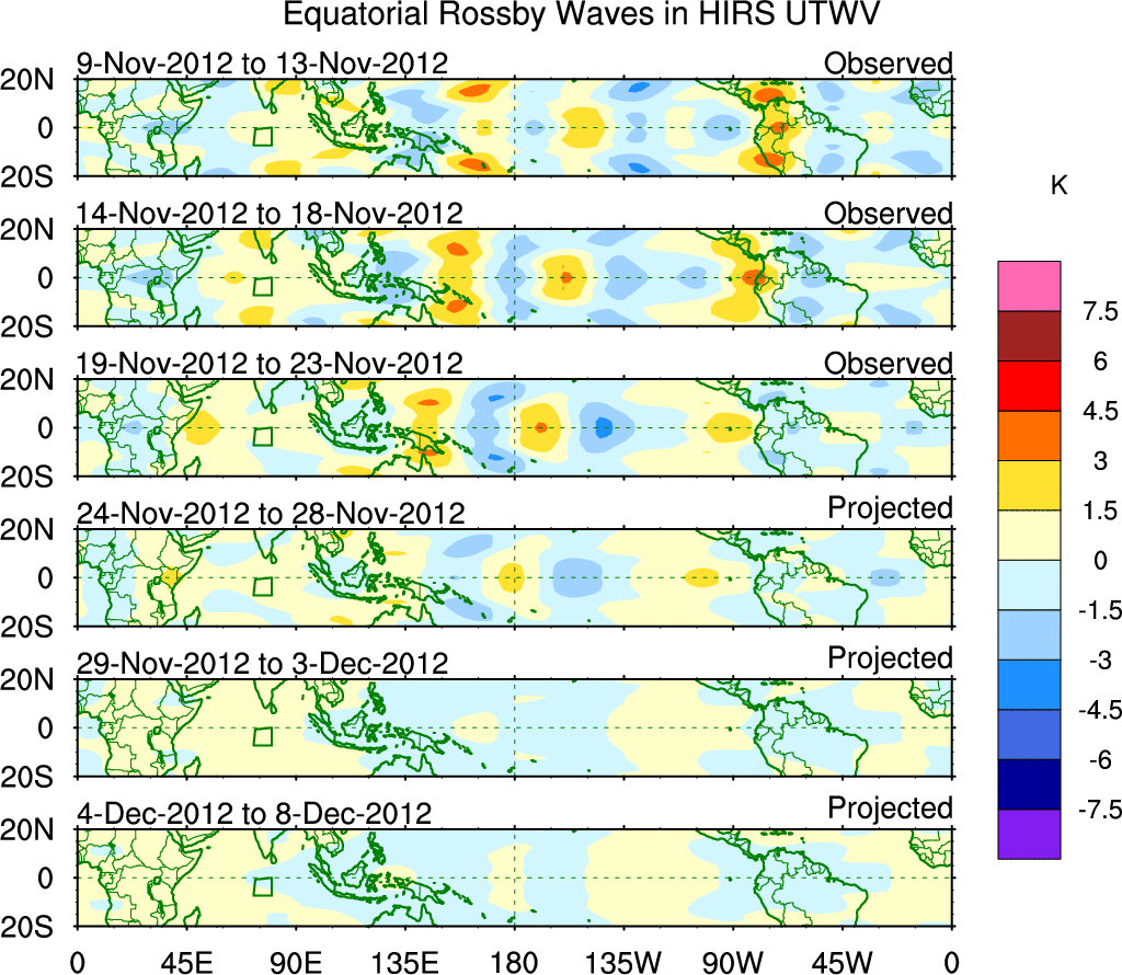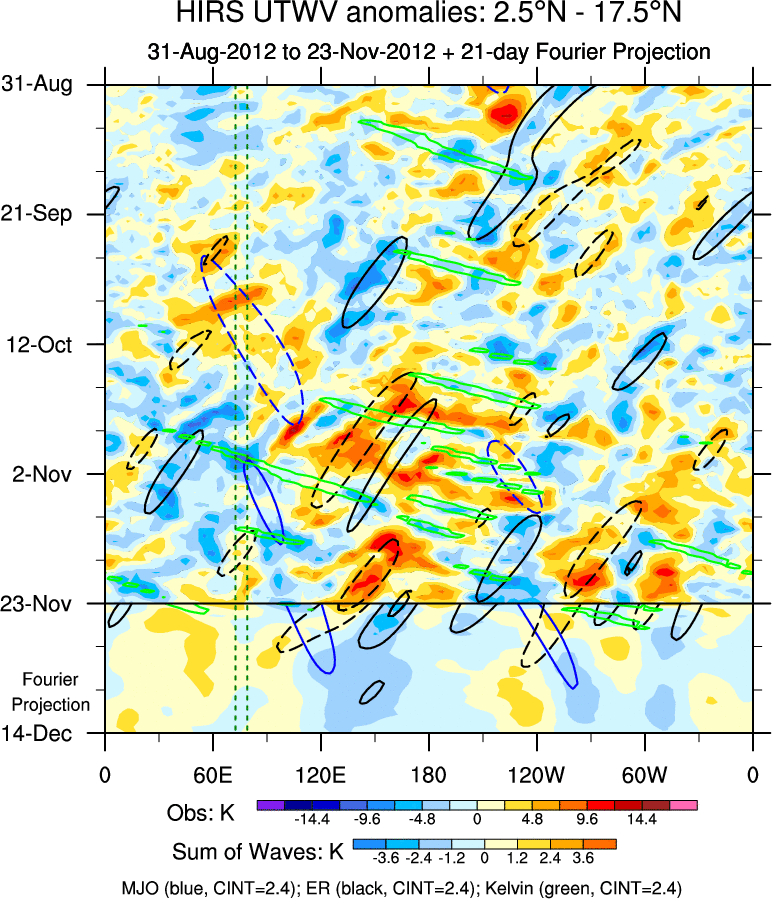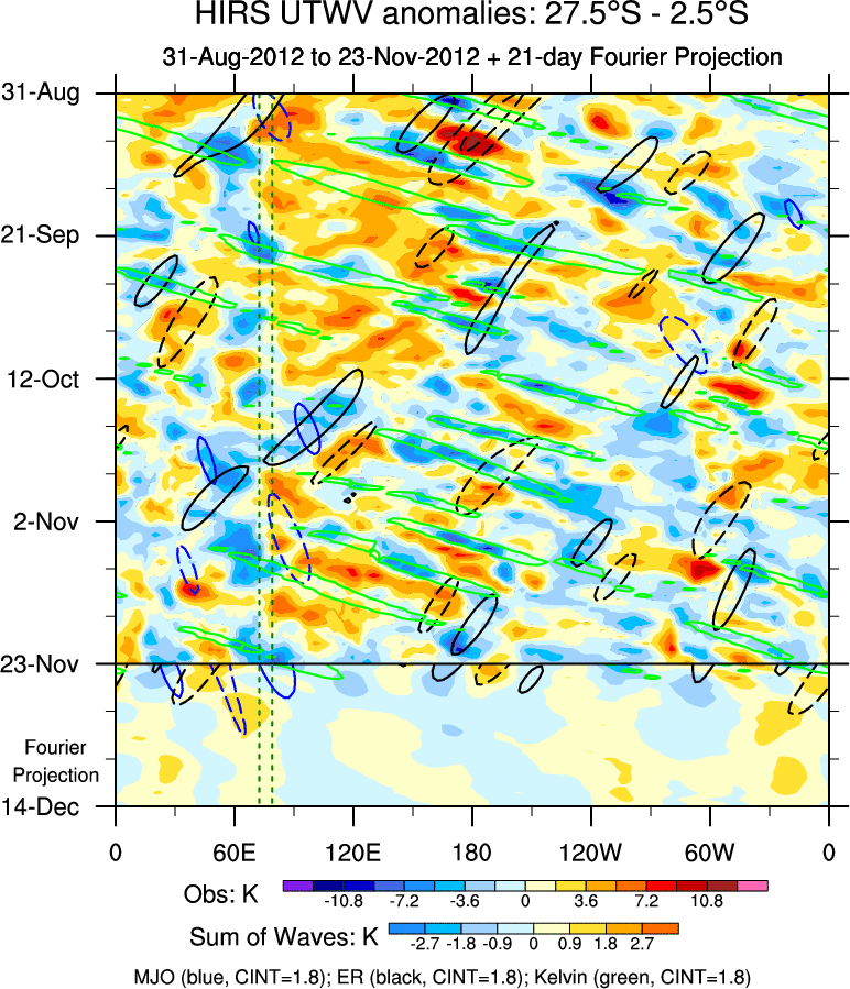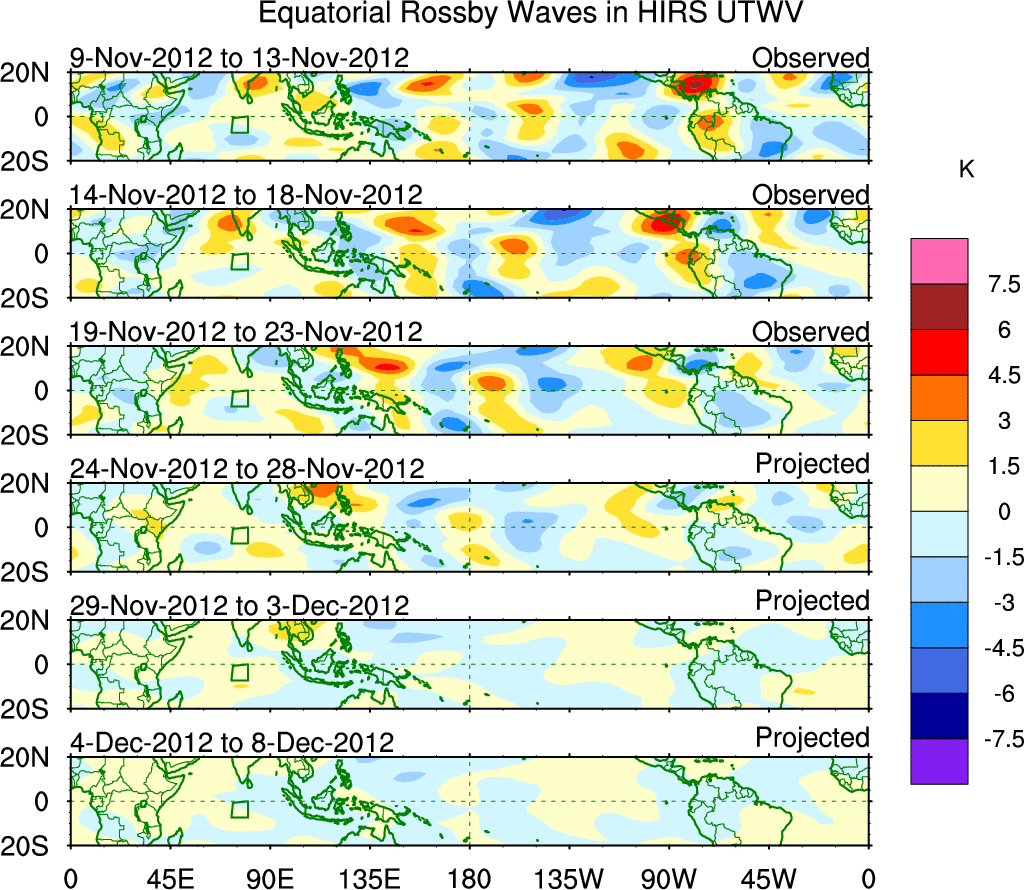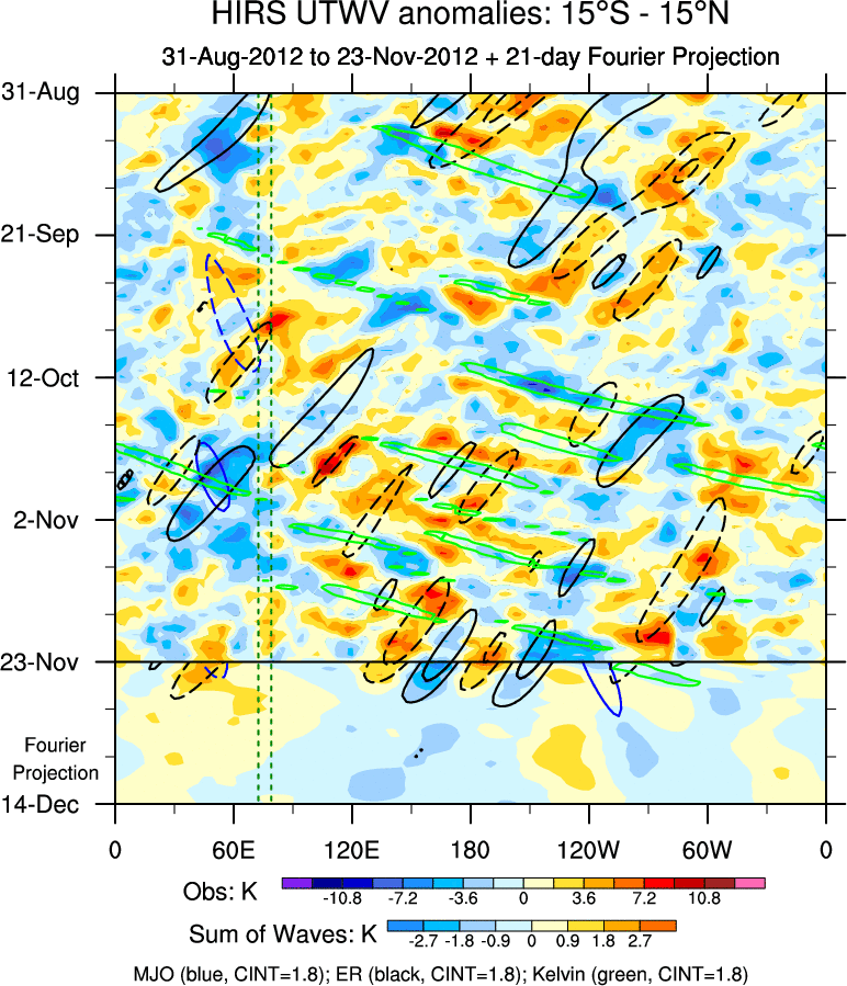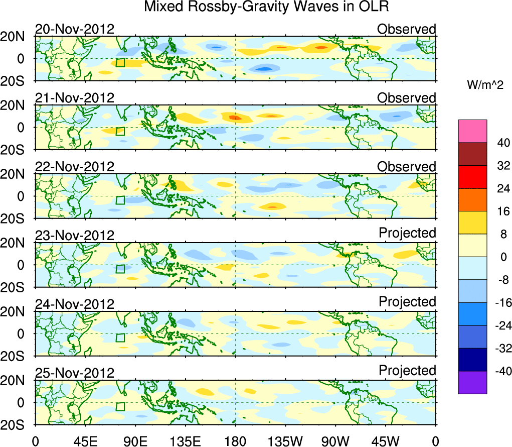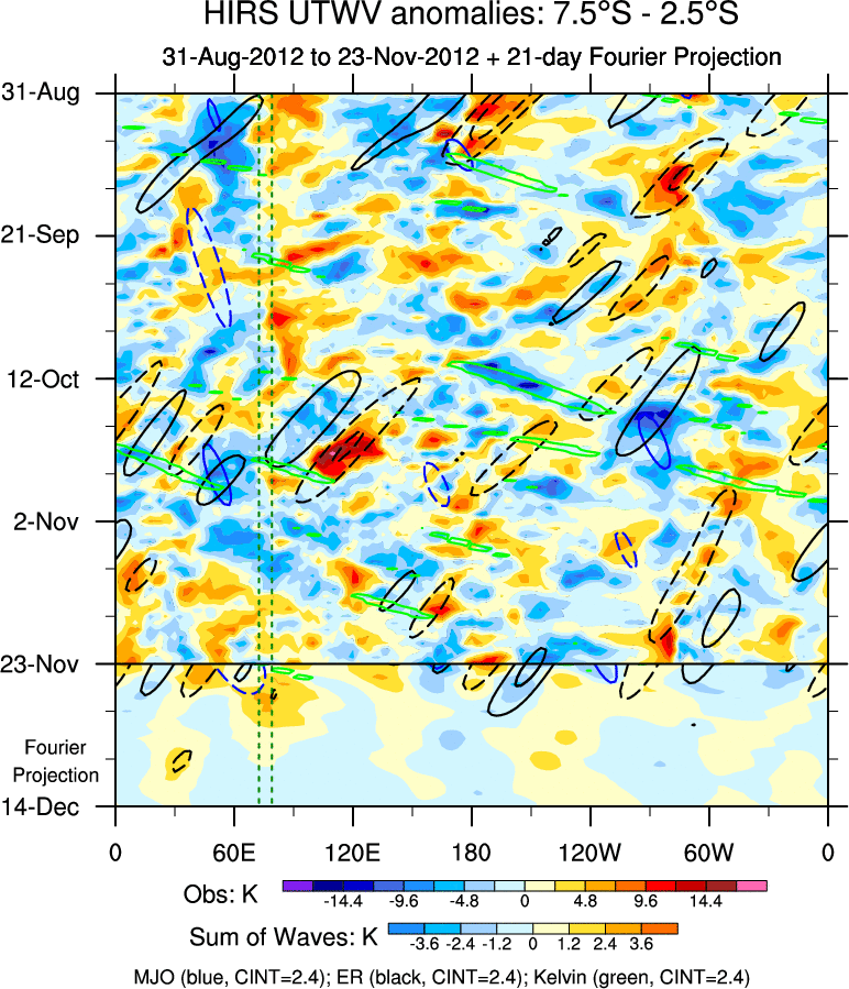 To identify tropical waves in near real-time, the OLR and UTWV data are filtered following Wheeler & Weickmann (2001 MWR). The daily anomalies are calculated using the first 3 harmonics of the seasonal cycle for 1979–2009. Missing values are then filled using linear interpolation in space and time. The most recent 365 days of anomalies are padded with 659 days of zeroes, and the result is filtered for each wave type.
