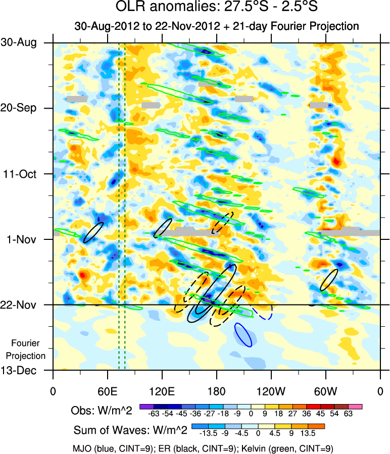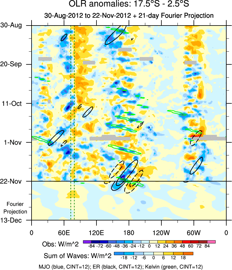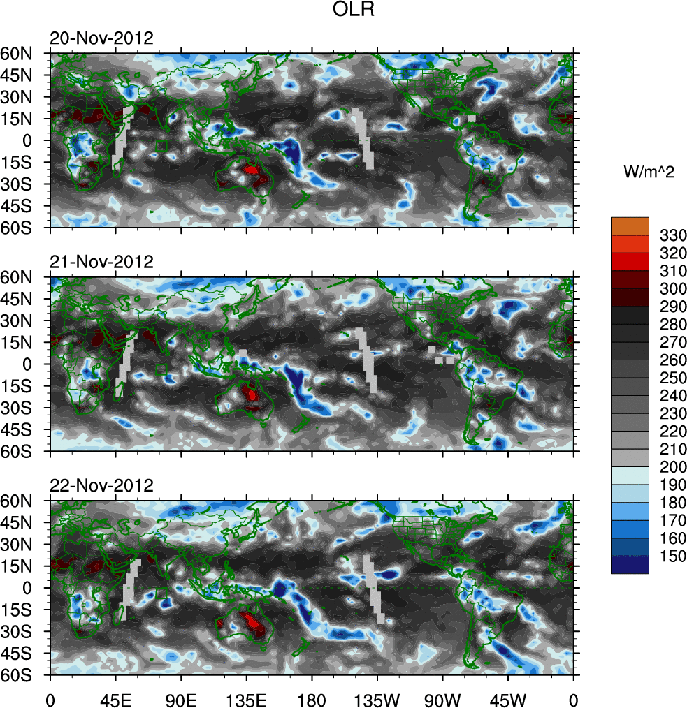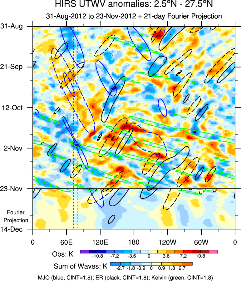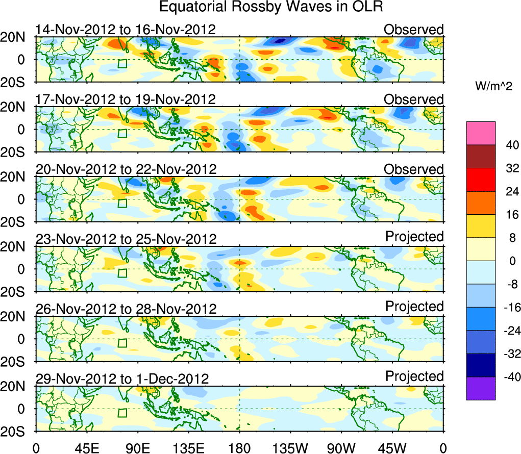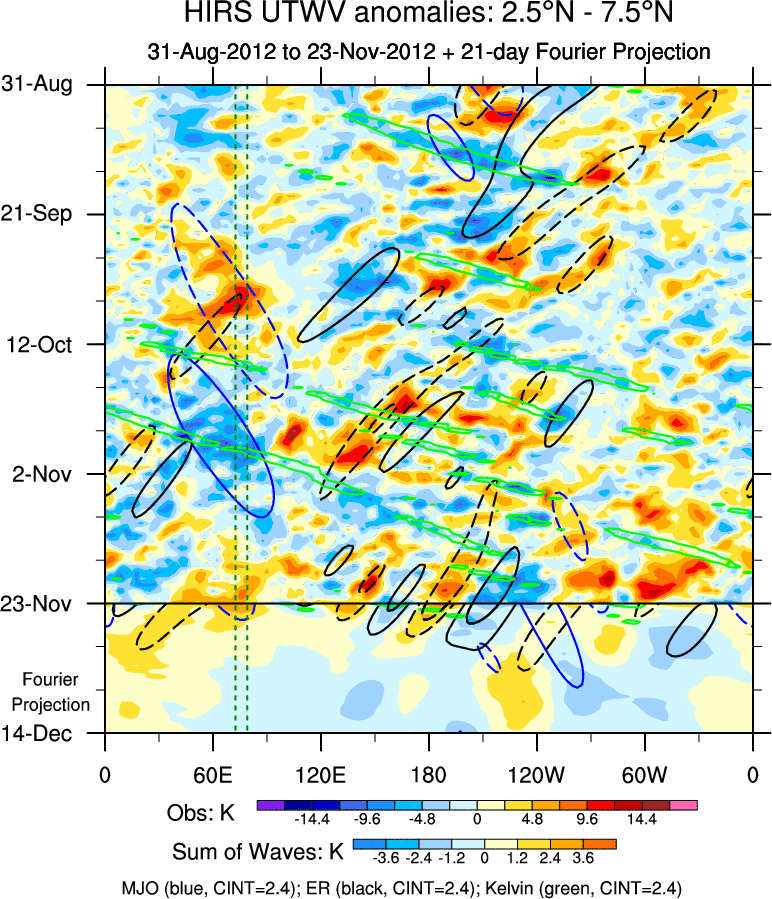 To identify tropical waves in near real-time, the OLR and UTWV data are filtered following Wheeler & Weickmann (2001 MWR). The daily anomalies are calculated using the first 3 harmonics of the seasonal cycle for 1979–2009. Missing values are then filled using linear interpolation in space and time. The most recent 365 days of anomalies are padded with 659 days of zeroes, and the result is filtered for each wave type.