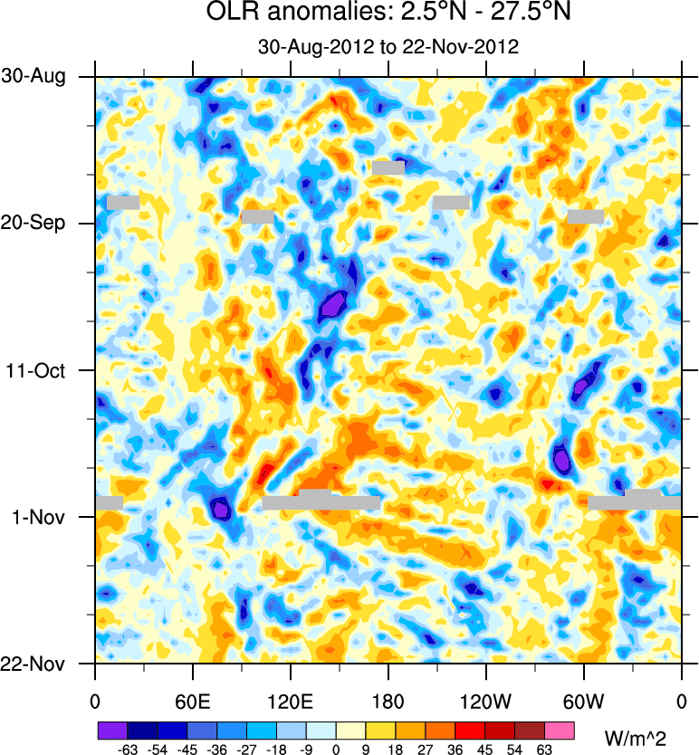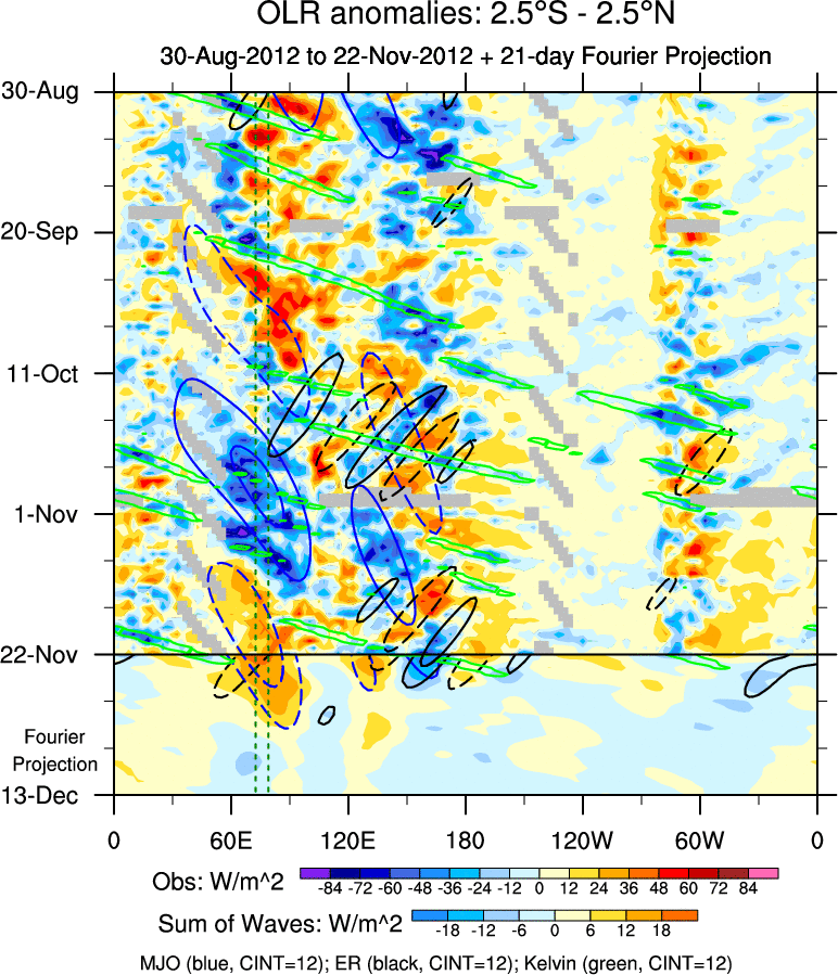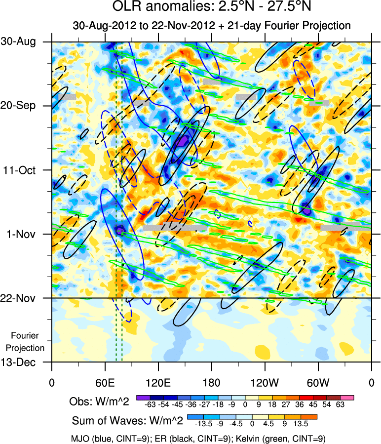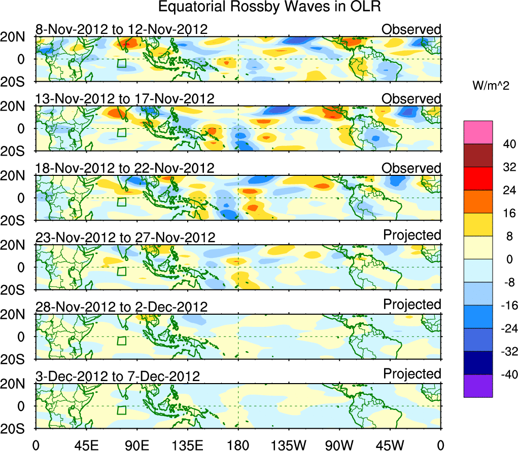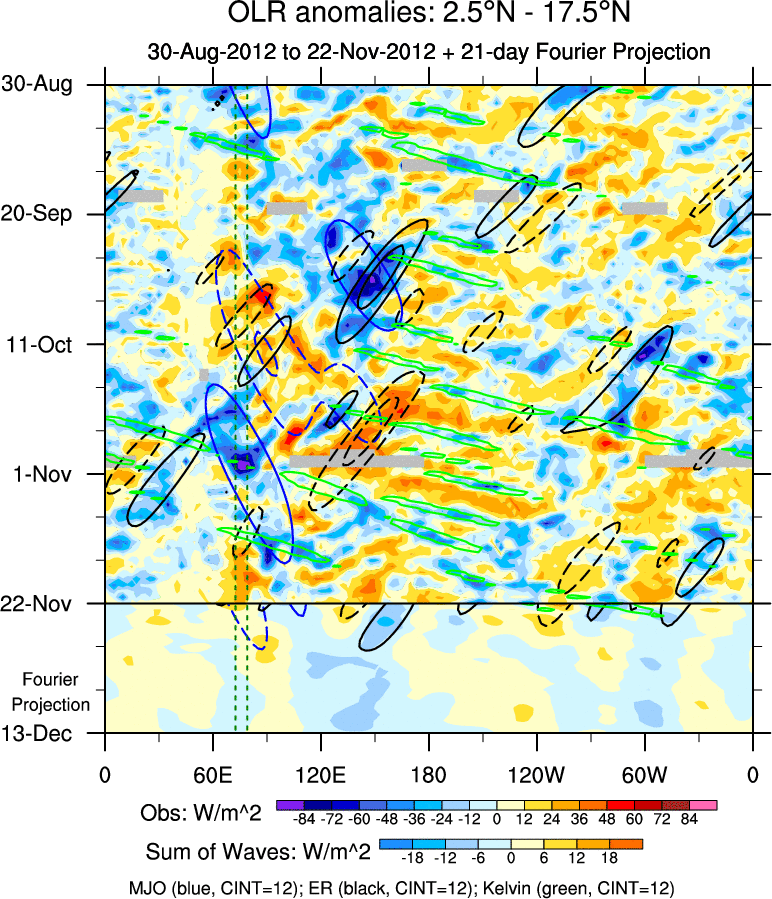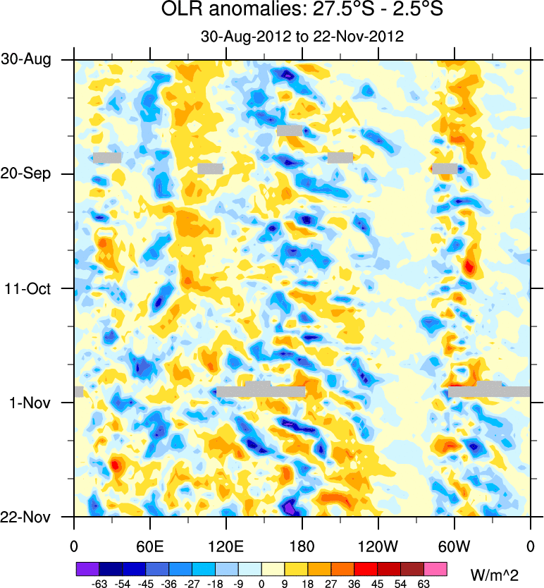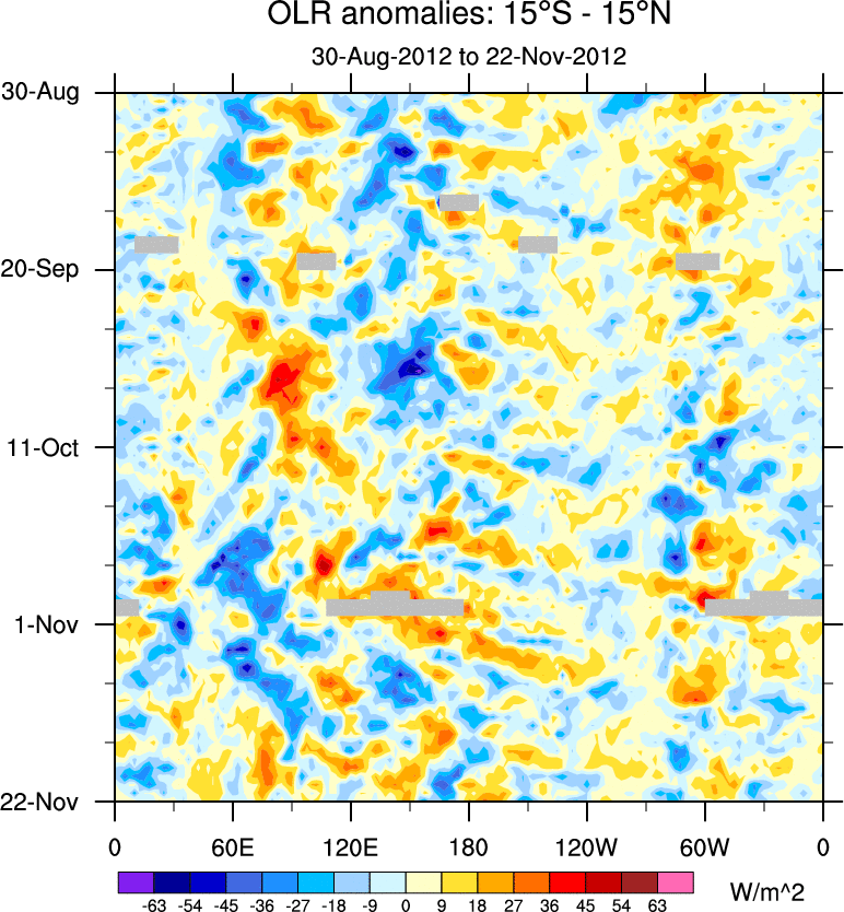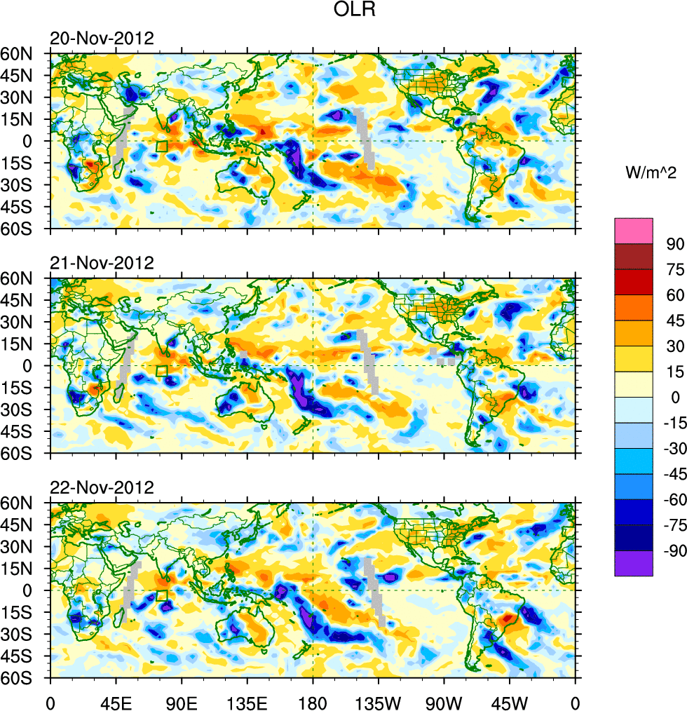 To identify tropical waves in near real-time, the OLR and UTWV data are filtered following Wheeler & Weickmann (2001 MWR). The daily anomalies are calculated using the first 3 harmonics of the seasonal cycle for 1979–2009. Missing values are then filled using linear interpolation in space and time. The most recent 365 days of anomalies are padded with 659 days of zeroes, and the result is filtered for each wave type.