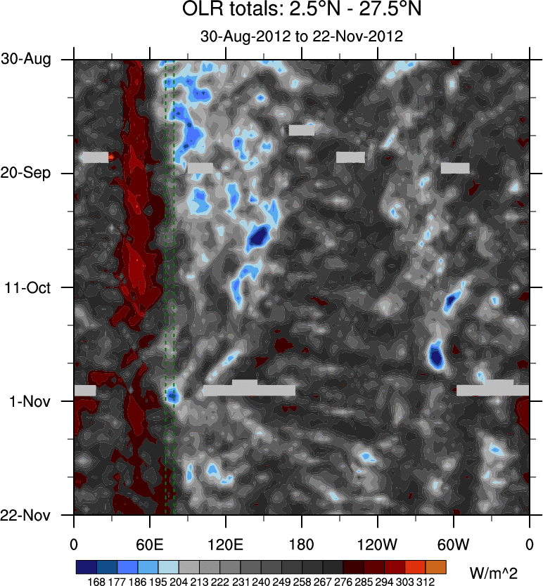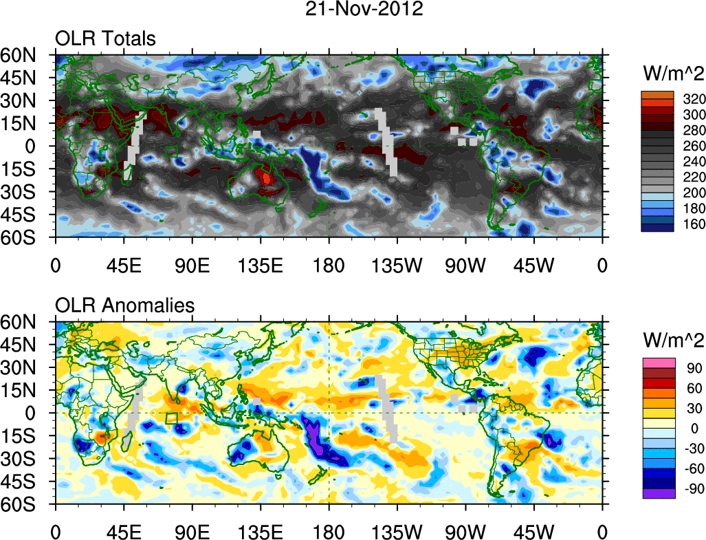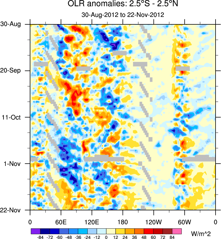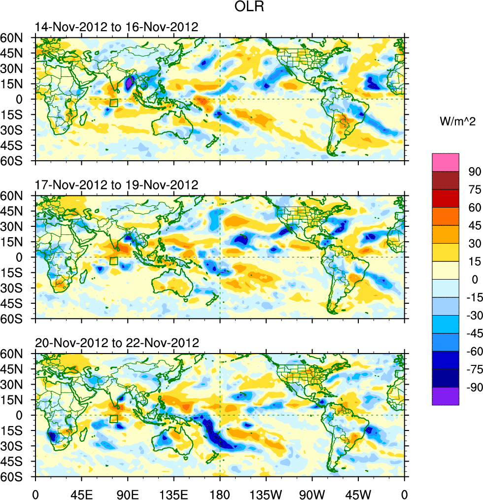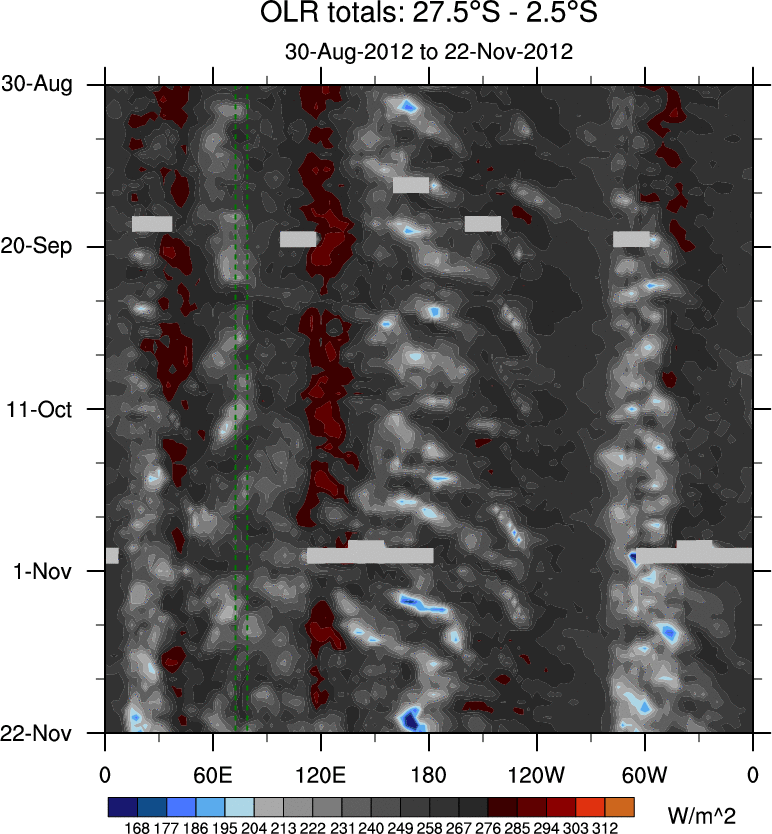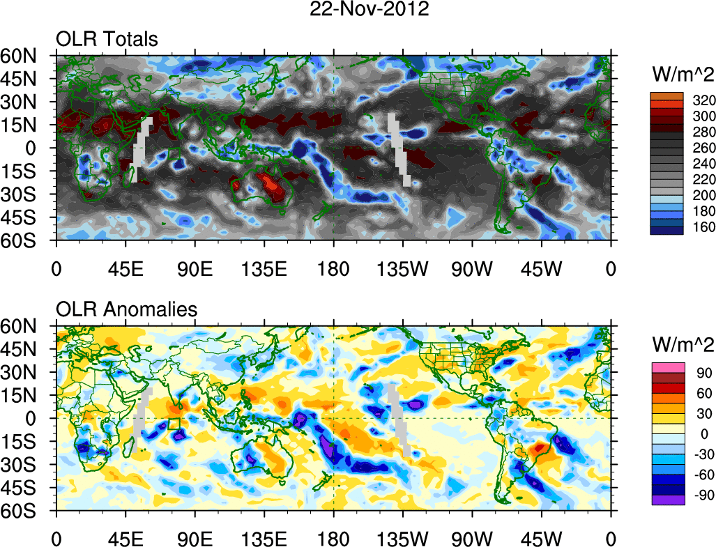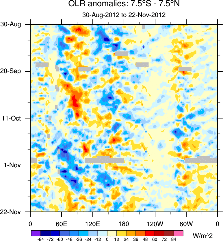 To identify tropical waves in near real-time, the OLR and UTWV data are filtered following Wheeler & Weickmann (2001 MWR). The daily anomalies are calculated using the first 3 harmonics of the seasonal cycle for 1979–2009. Missing values are then filled using linear interpolation in space and time. The most recent 365 days of anomalies are padded with 659 days of zeroes, and the result is filtered for each wave type.