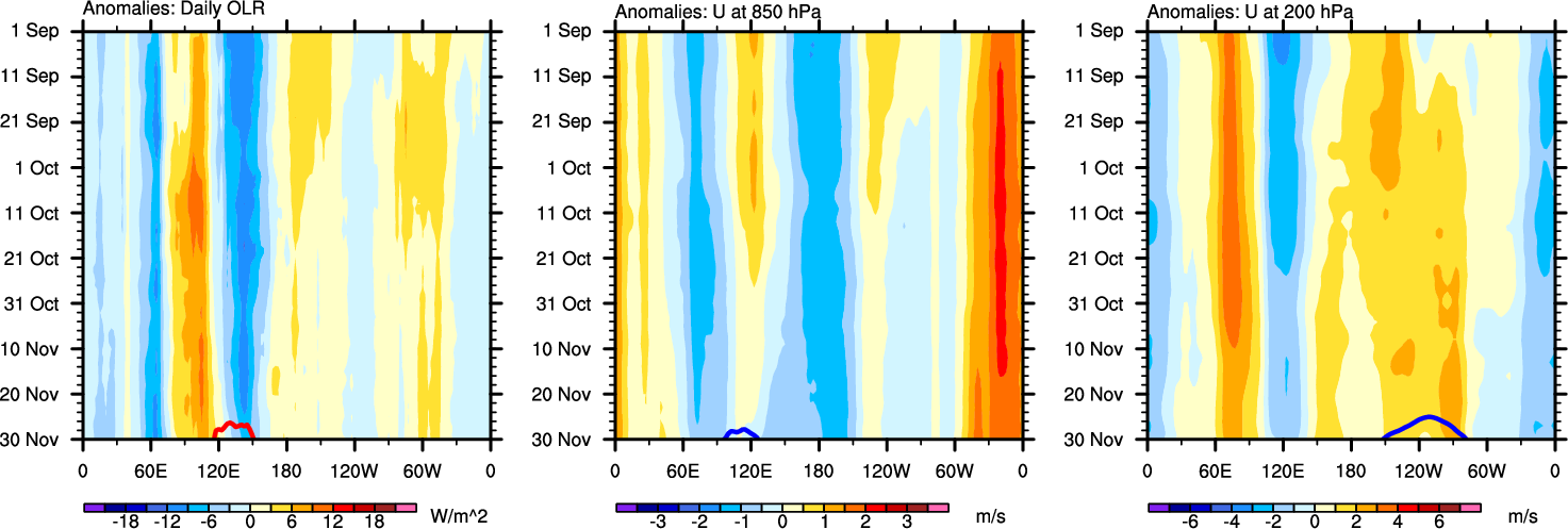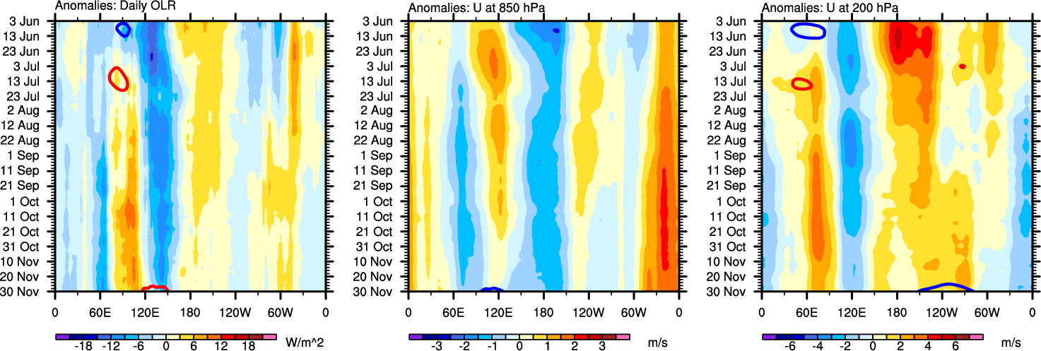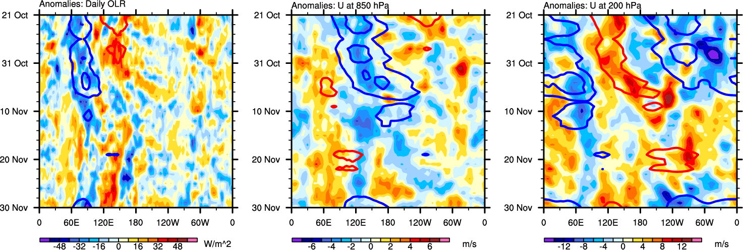 The Hovmollers show longitude-time plots for OLR, U-850, and U-200. The shading indicates the observed anomalies, while the contours are the projection of those anomalies onto the RMM EOFs.