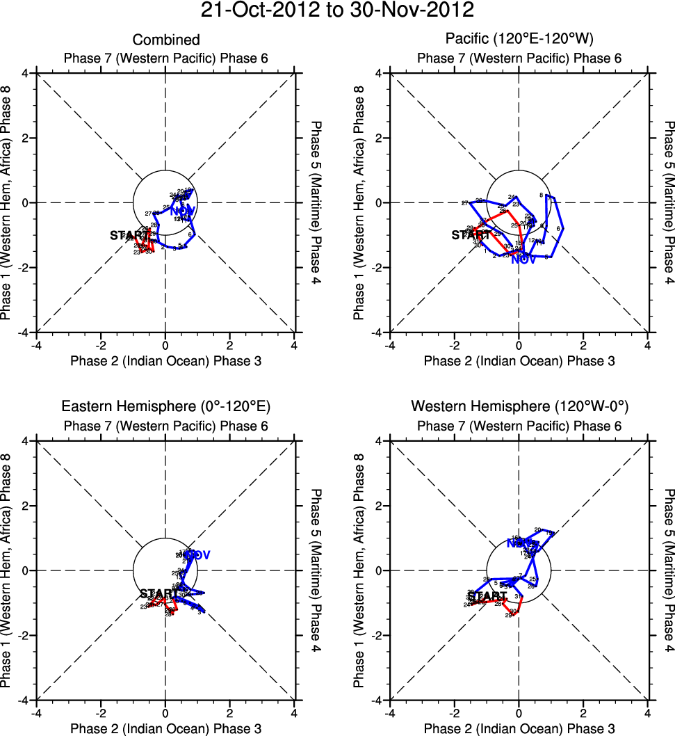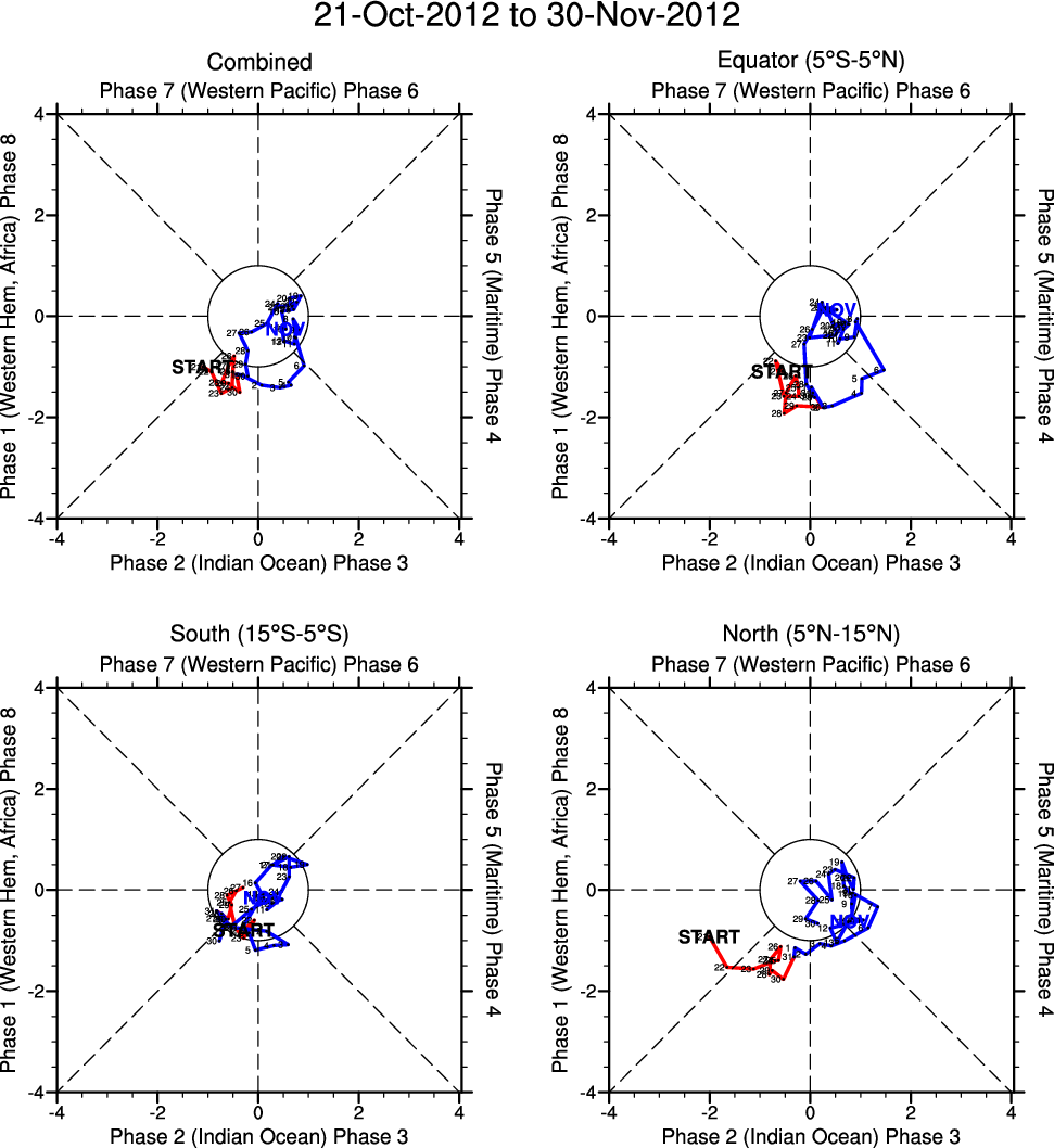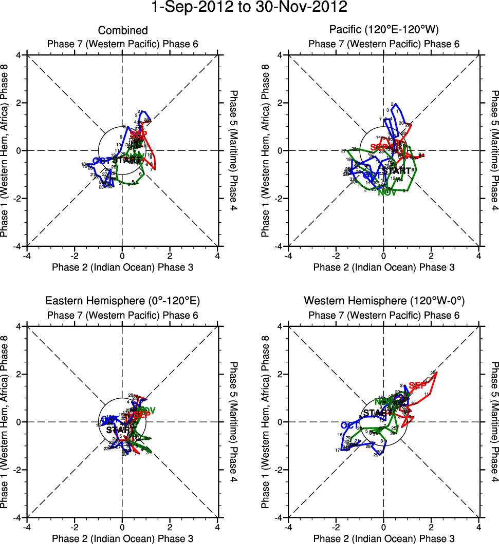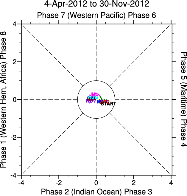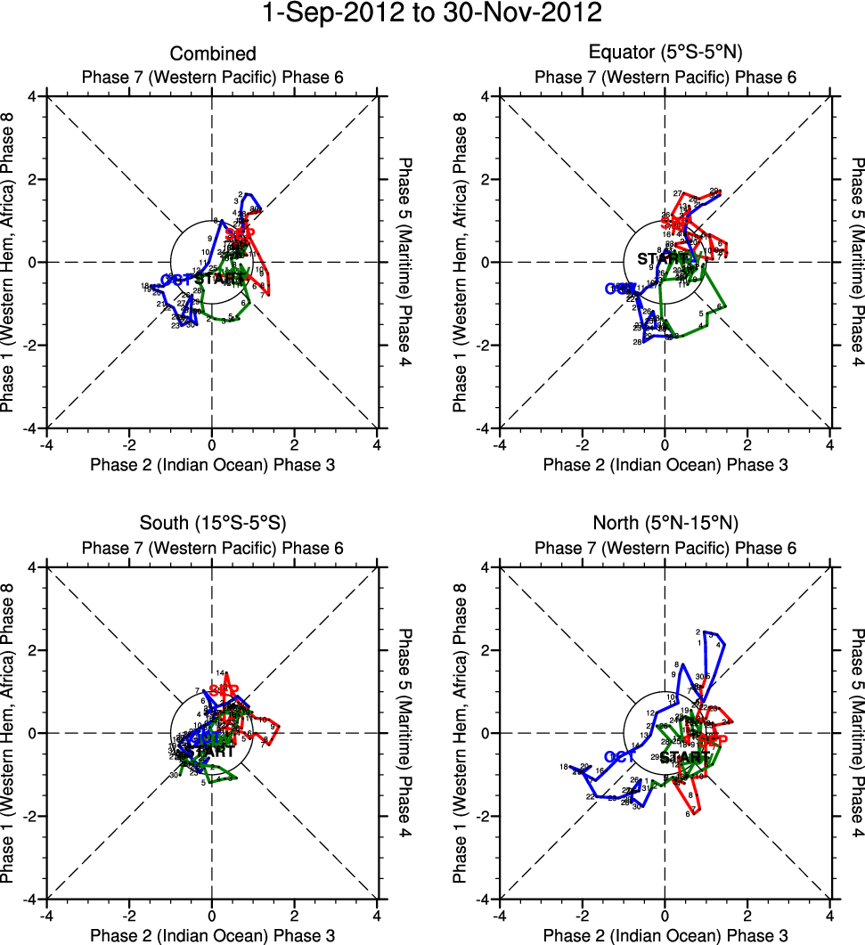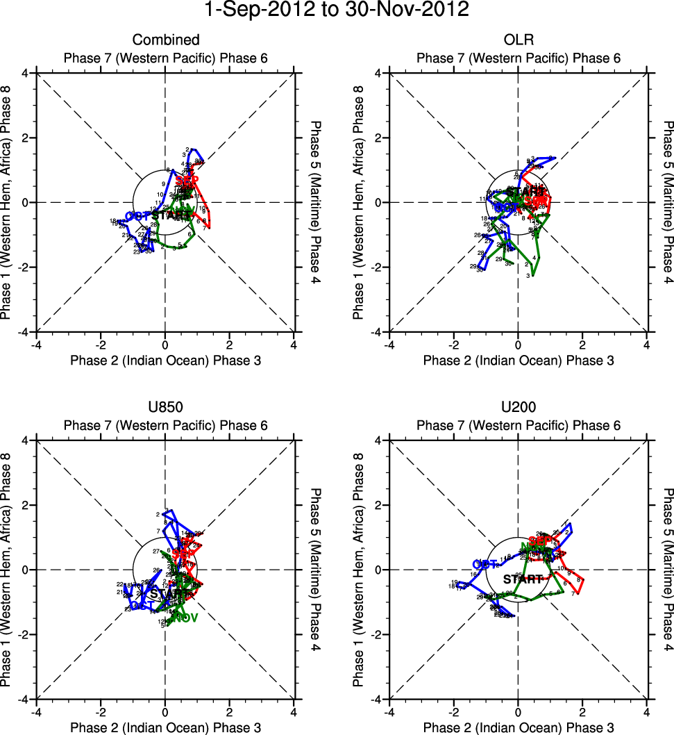 Wheeler and Hendon (2004) constructed the RMM index for monitoring the MJO. This index consists of the first two principal components (PCs) of OLR, 850-hPa zonal wind, and 200-hPa zonal wind averaged 15S-15N.