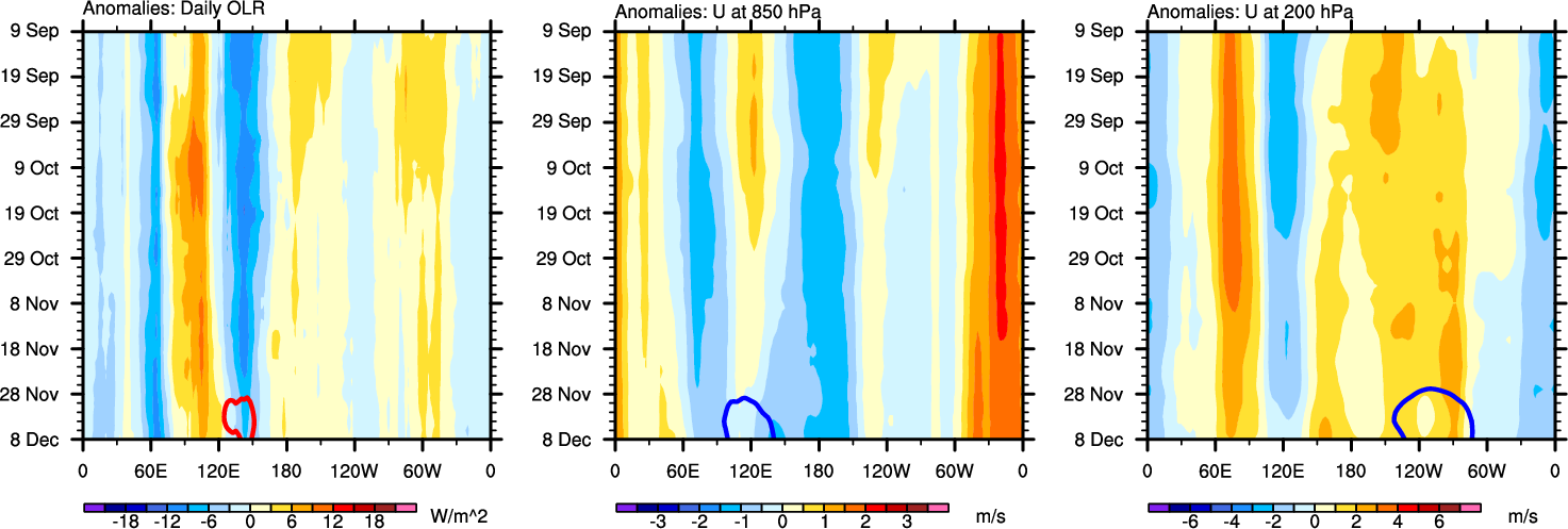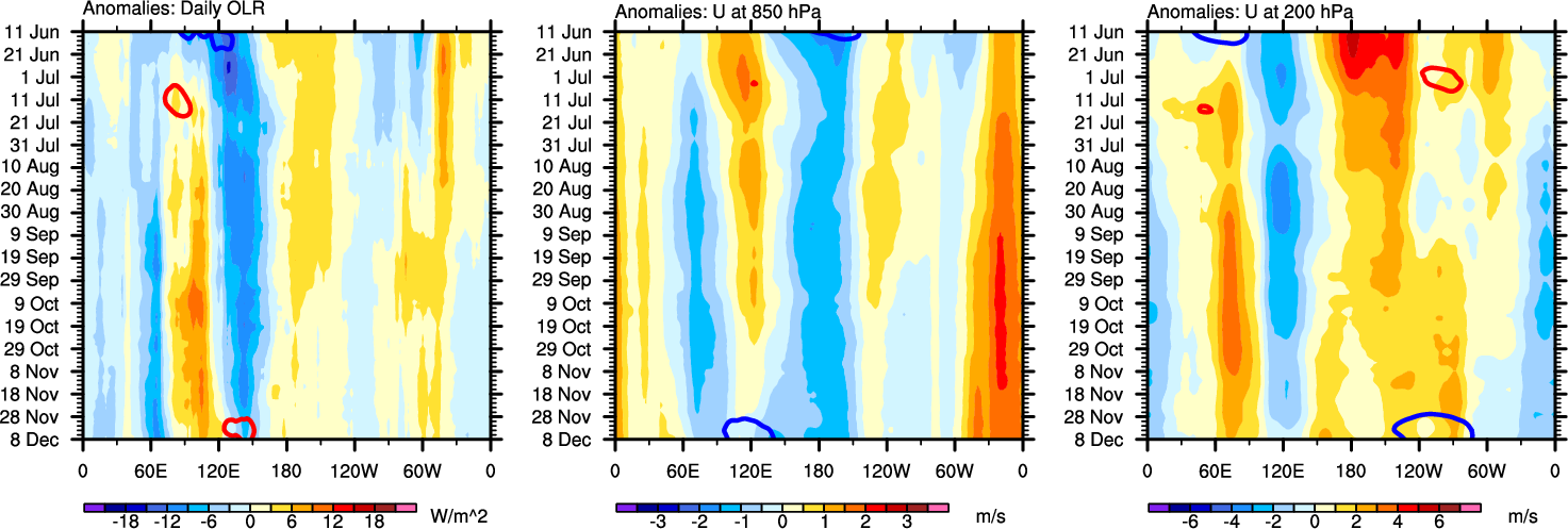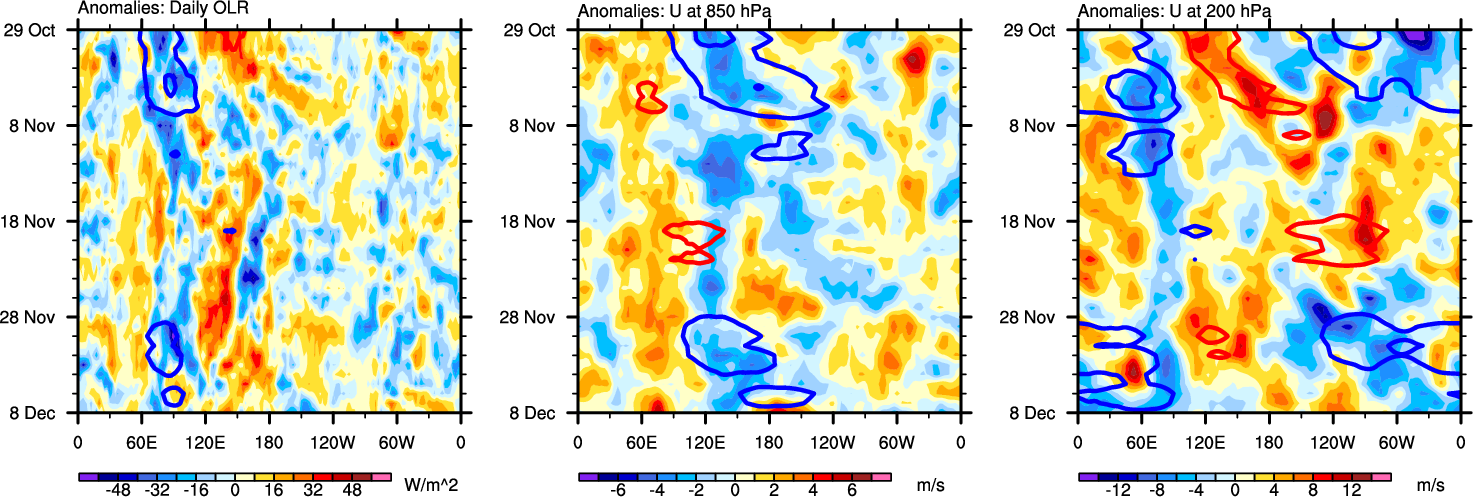 The Hovmollers show longitude-time plots for OLR, U-850, and U-200. The shading indicates the observed anomalies, while the contours are the projection of those anomalies onto the RMM EOFs.
