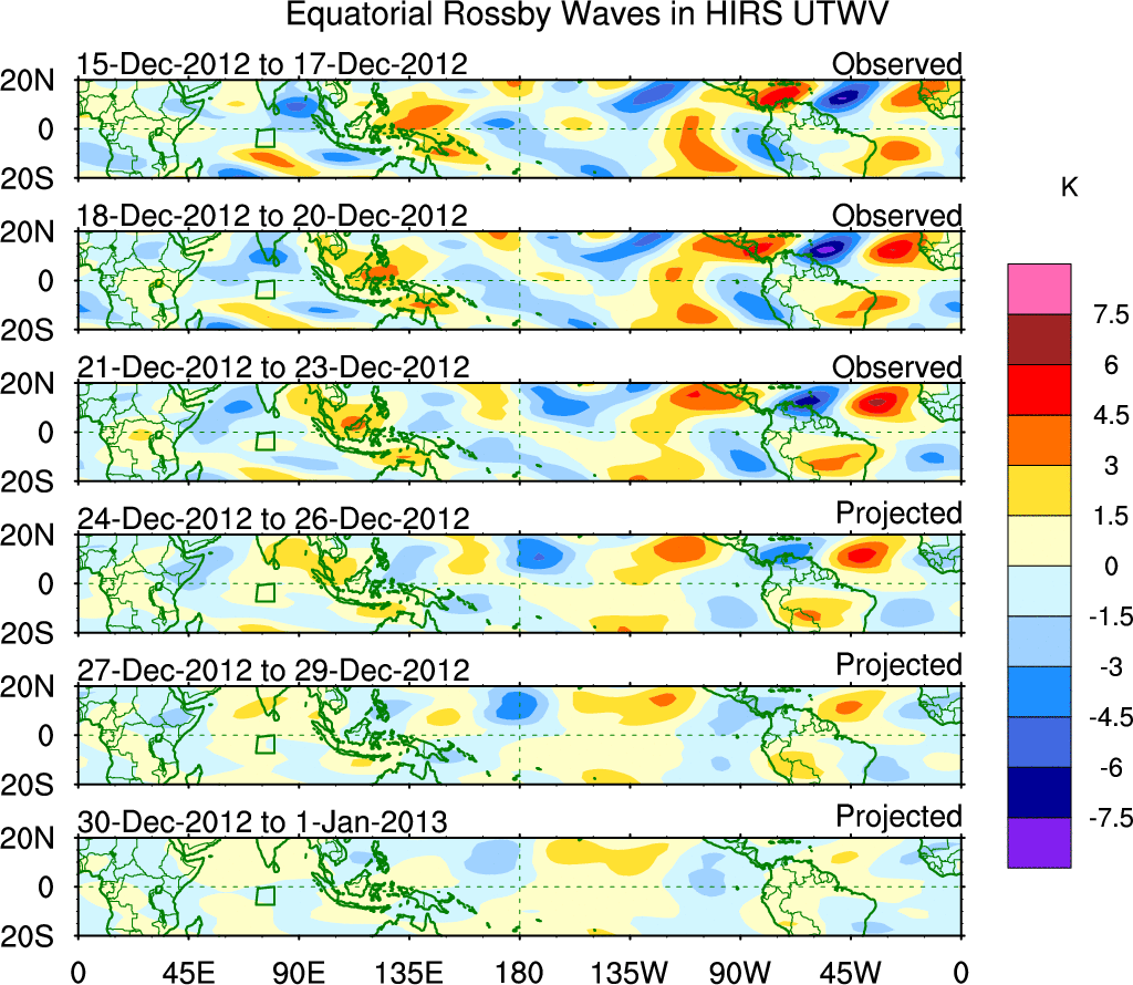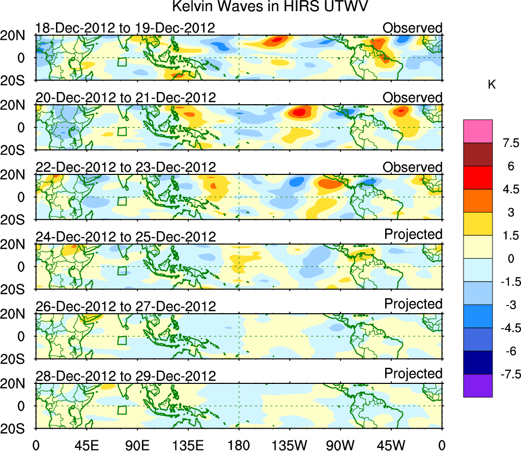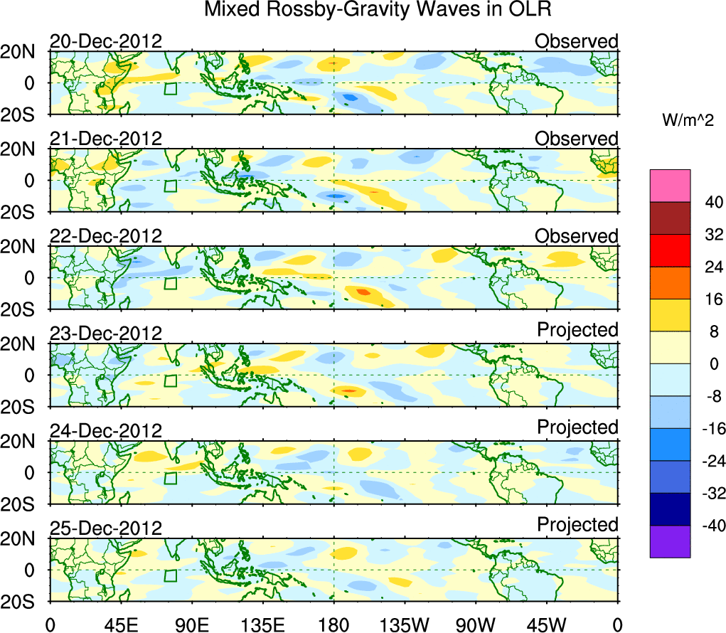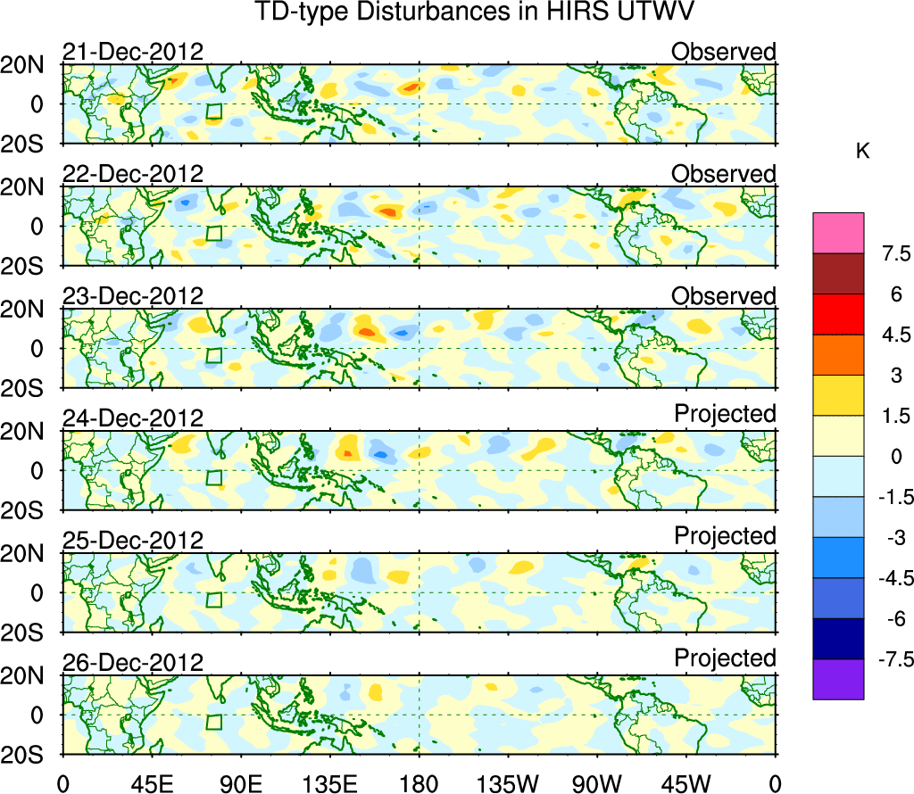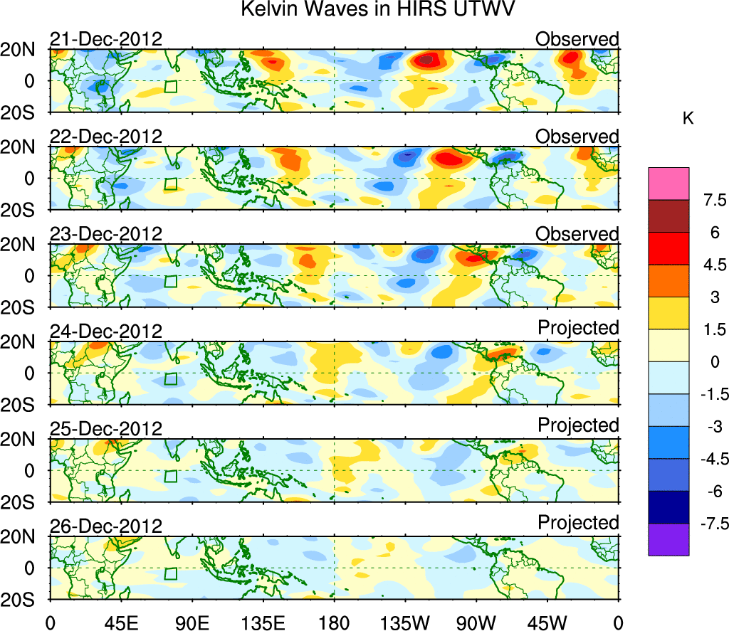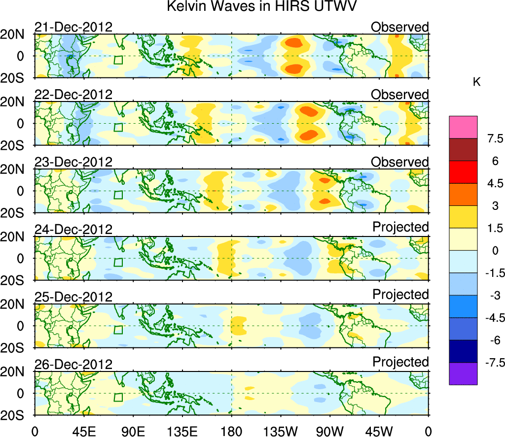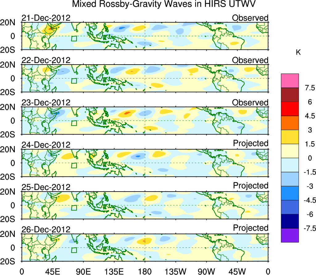To identify tropical waves in near real-time, the OLR and UTWV data are filtered following Wheeler & Weickmann (2001 MWR). The daily anomalies are calculated using the first 3 harmonics of the seasonal cycle for 1979–2009. Missing values are then filled using linear interpolation in space and time. The most recent 365 days of anomalies are padded with 659 days of zeroes, and the result is filtered for each wave type.