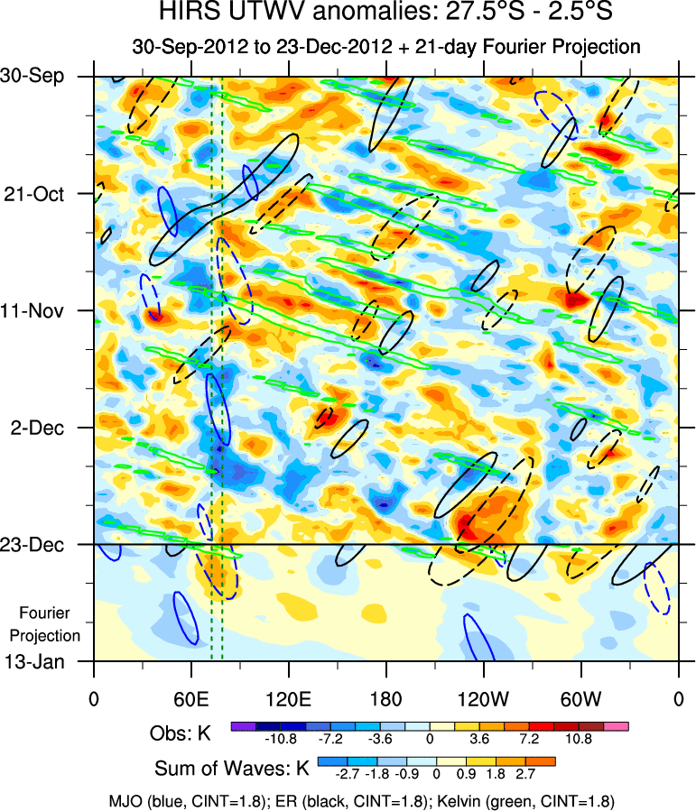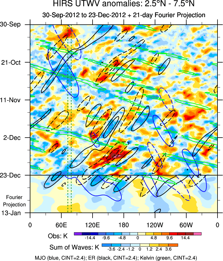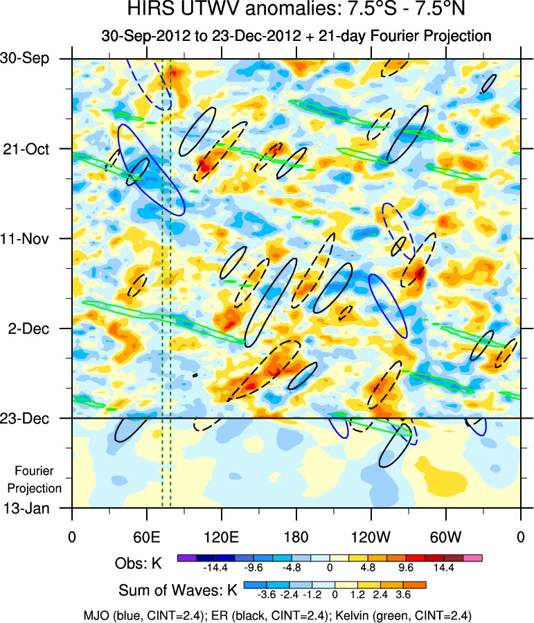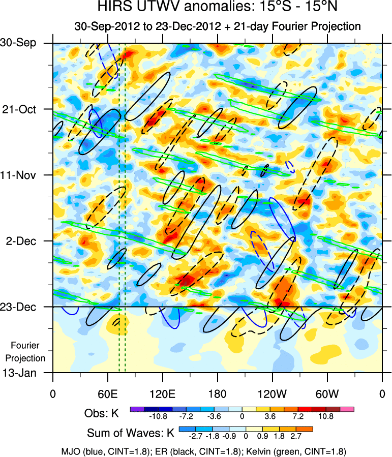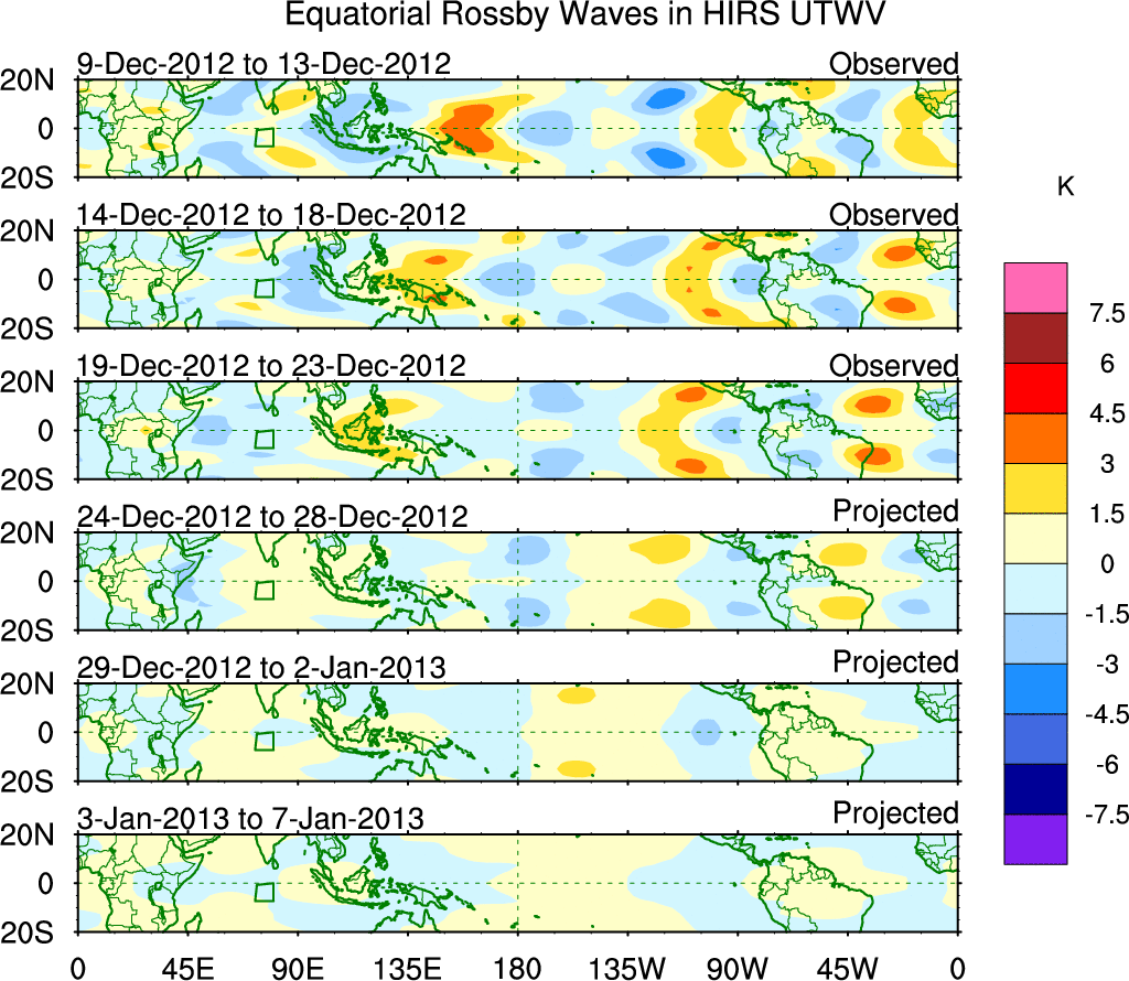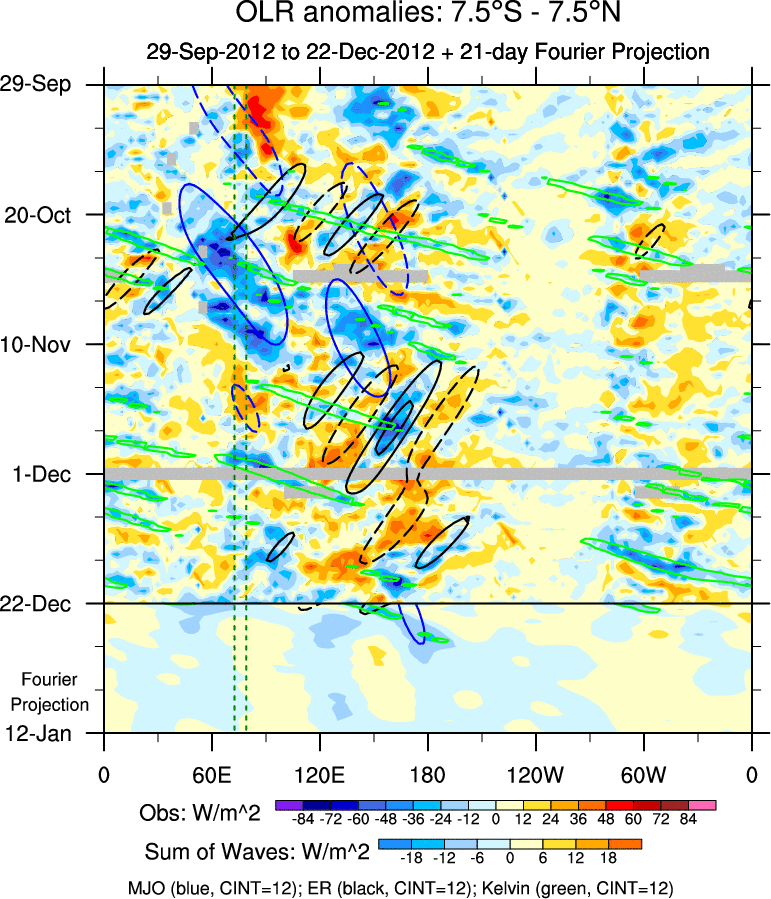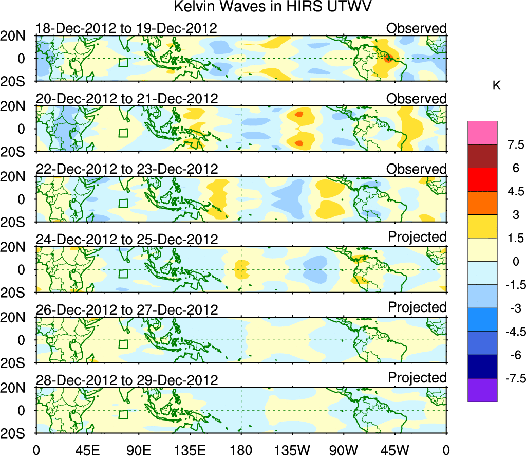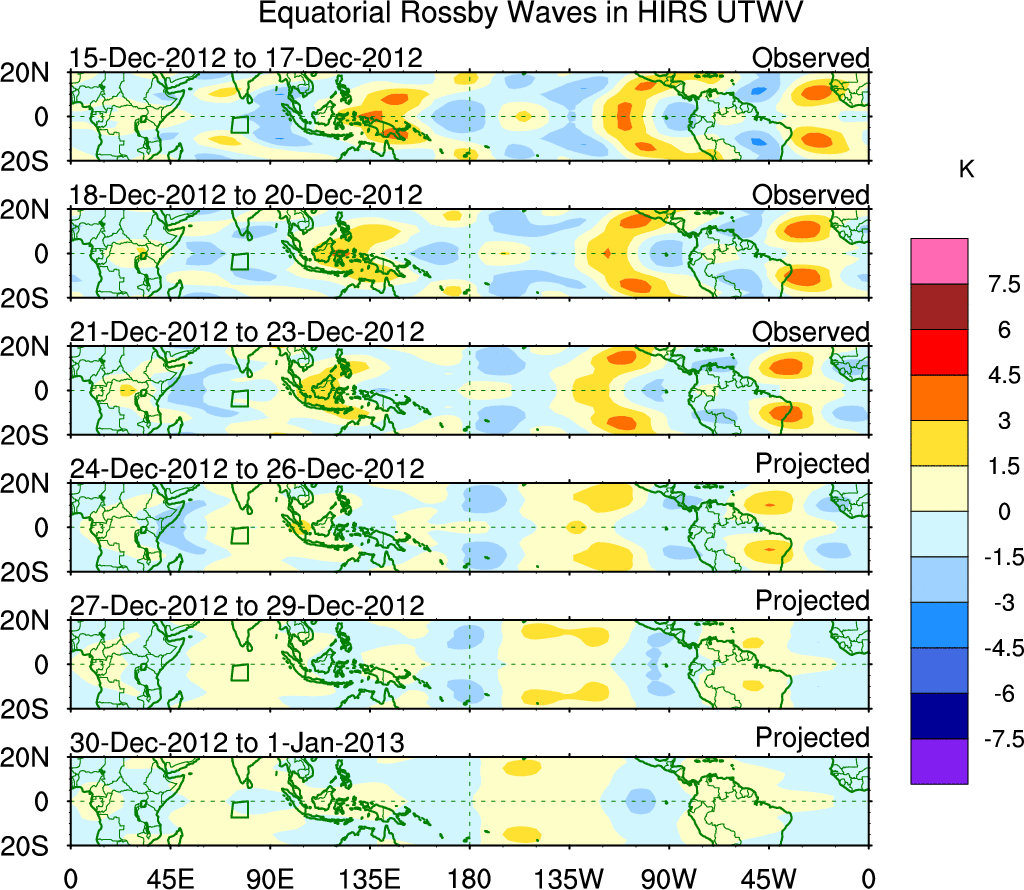 To identify tropical waves in near real-time, the OLR and UTWV data are filtered following Wheeler & Weickmann (2001 MWR). The daily anomalies are calculated using the first 3 harmonics of the seasonal cycle for 1979–2009. Missing values are then filled using linear interpolation in space and time. The most recent 365 days of anomalies are padded with 659 days of zeroes, and the result is filtered for each wave type.