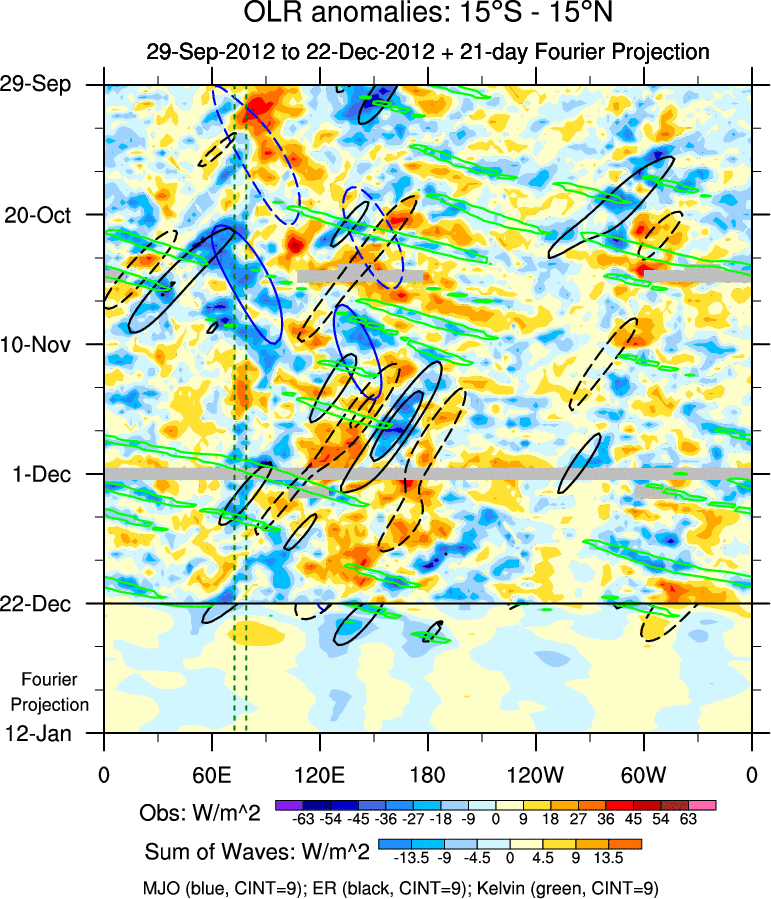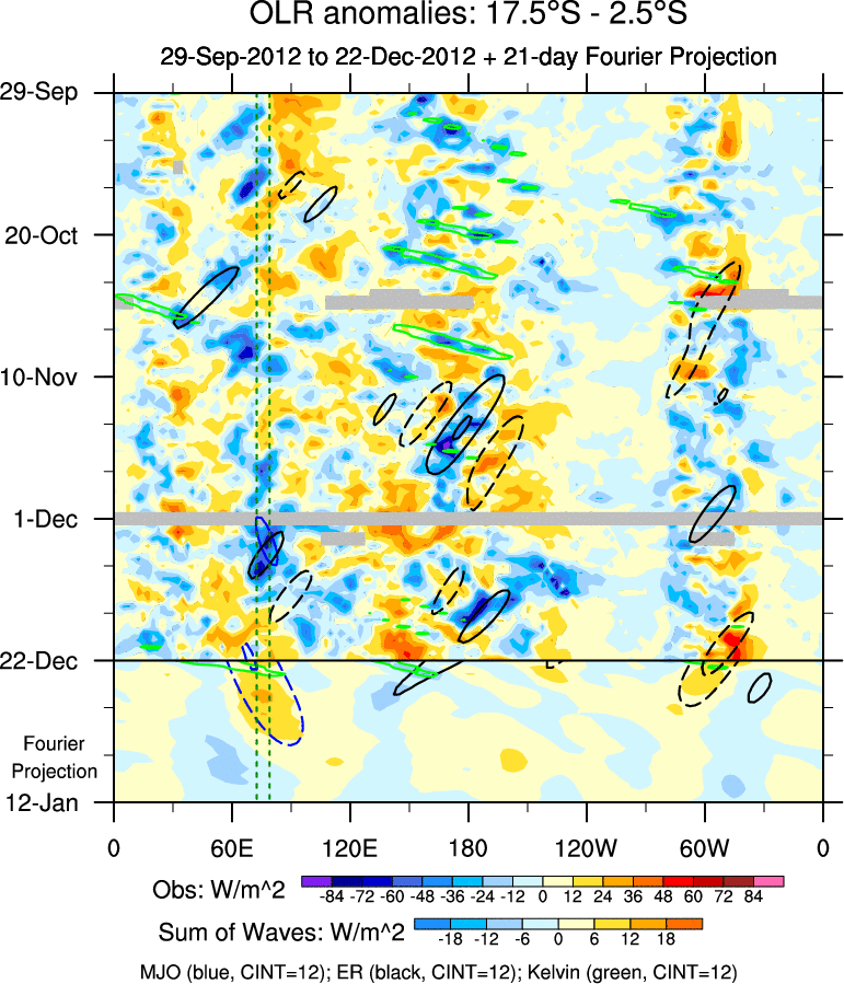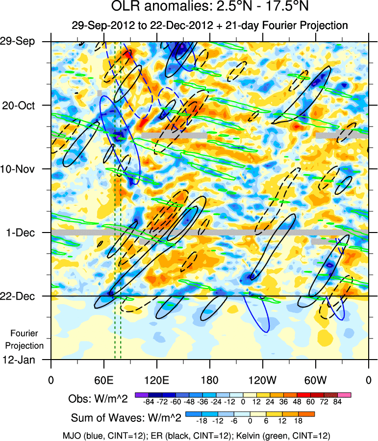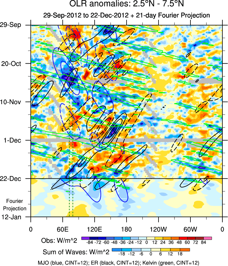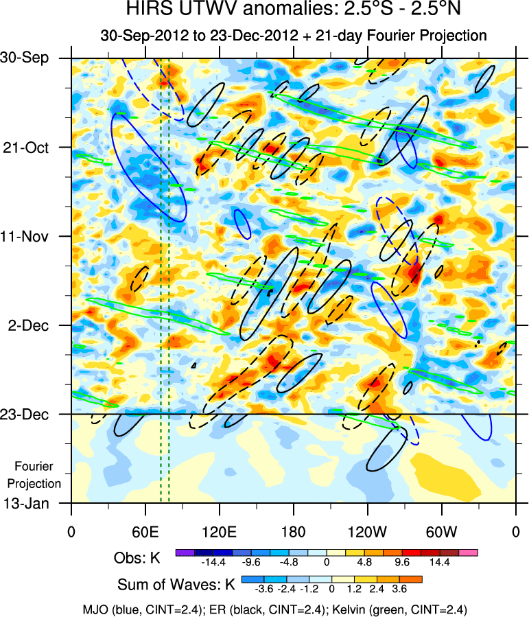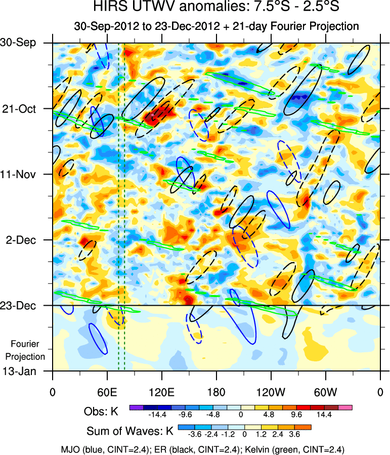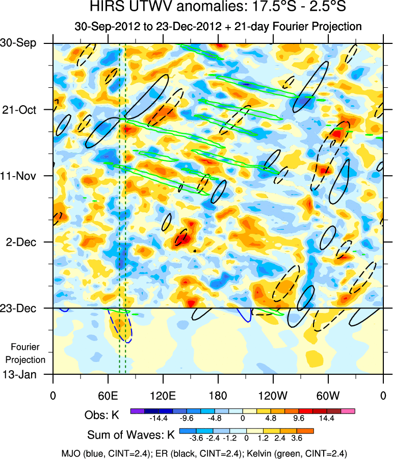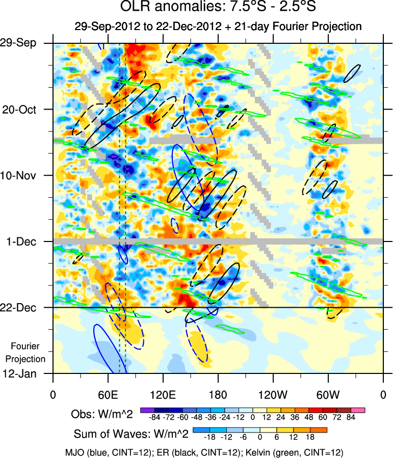 To identify tropical waves in near real-time, the OLR and UTWV data are filtered following Wheeler & Weickmann (2001 MWR). The daily anomalies are calculated using the first 3 harmonics of the seasonal cycle for 1979–2009. Missing values are then filled using linear interpolation in space and time. The most recent 365 days of anomalies are padded with 659 days of zeroes, and the result is filtered for each wave type.