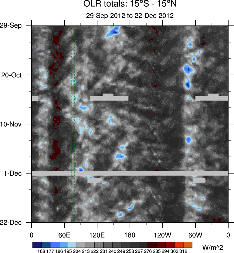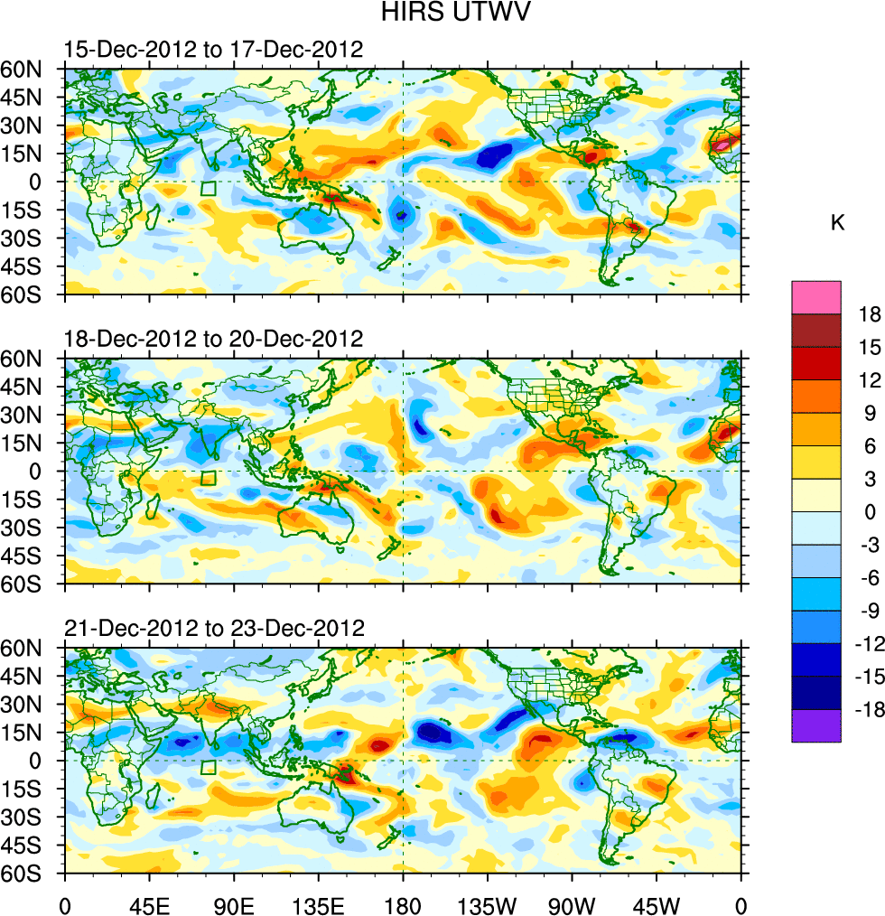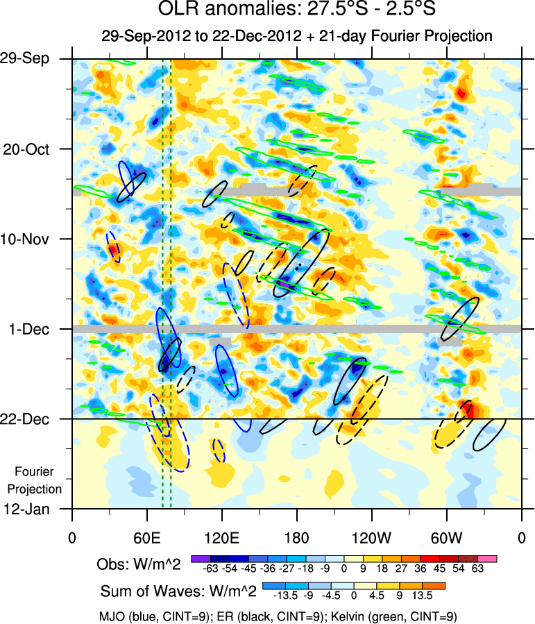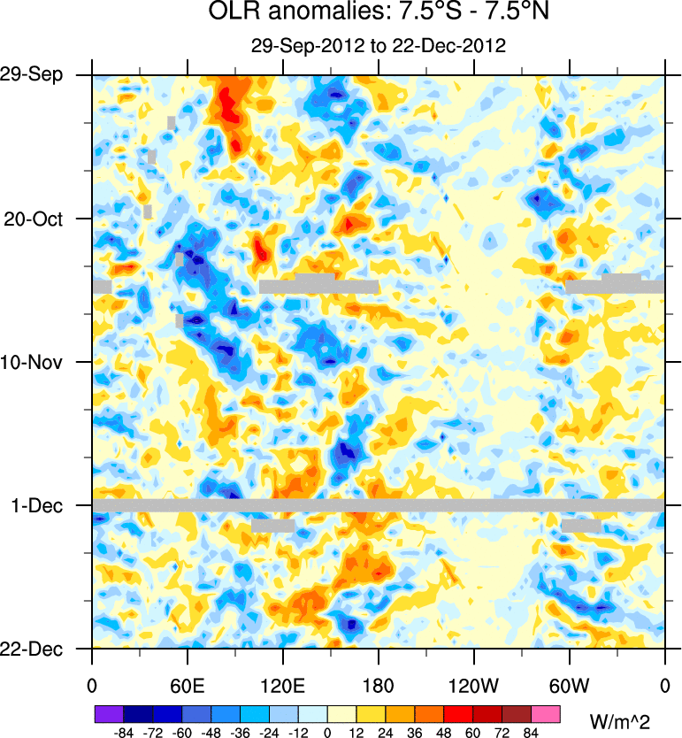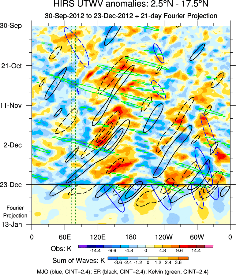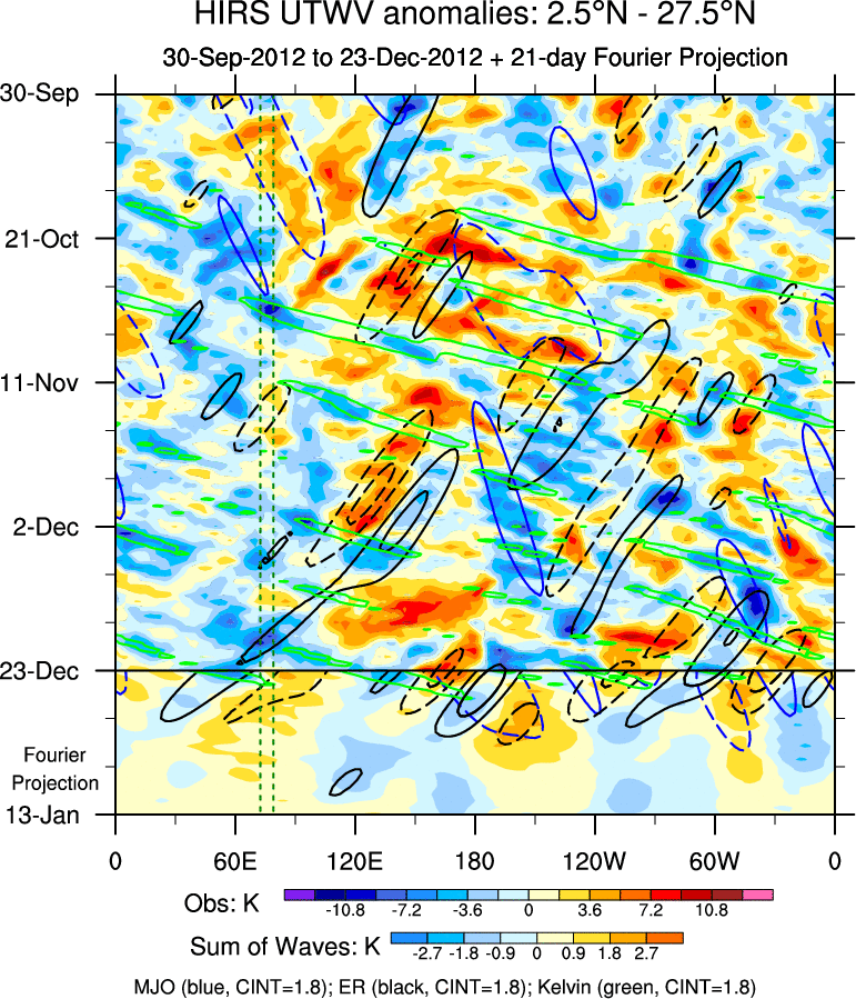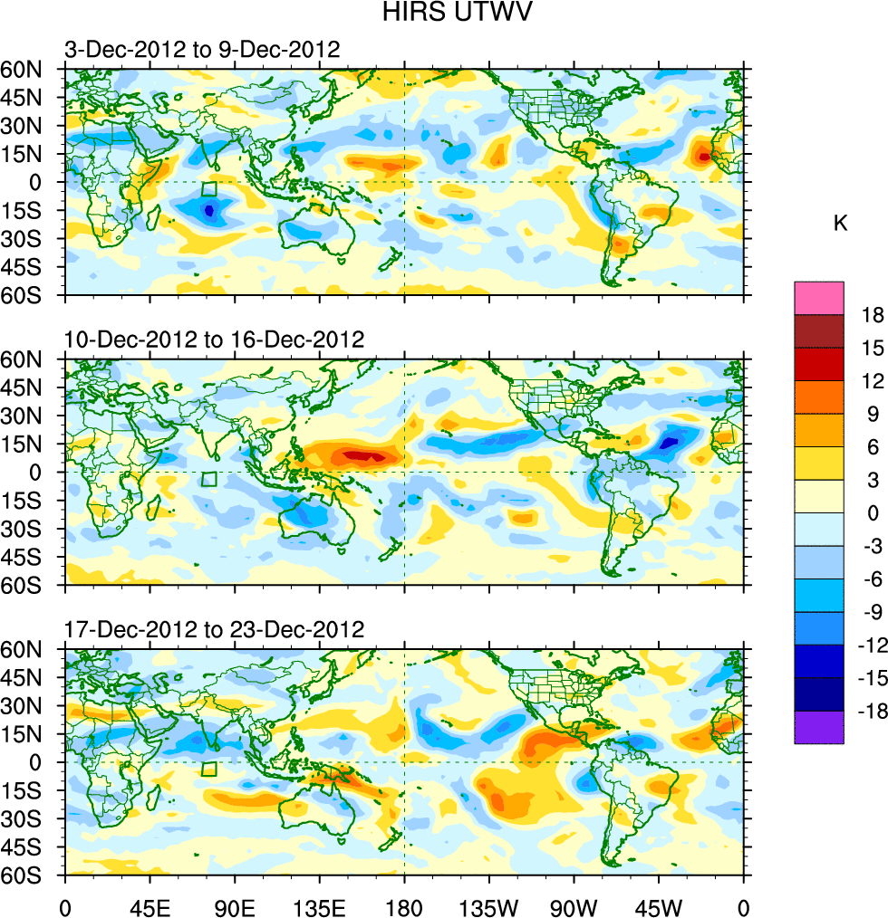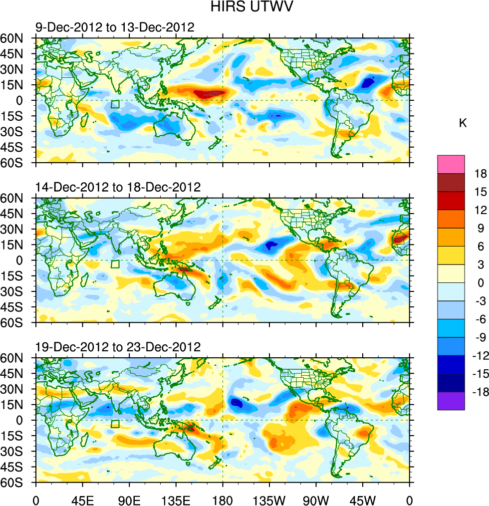 To identify tropical waves in near real-time, the OLR and UTWV data are filtered following Wheeler & Weickmann (2001 MWR). The daily anomalies are calculated using the first 3 harmonics of the seasonal cycle for 1979–2009. Missing values are then filled using linear interpolation in space and time. The most recent 365 days of anomalies are padded with 659 days of zeroes, and the result is filtered for each wave type.