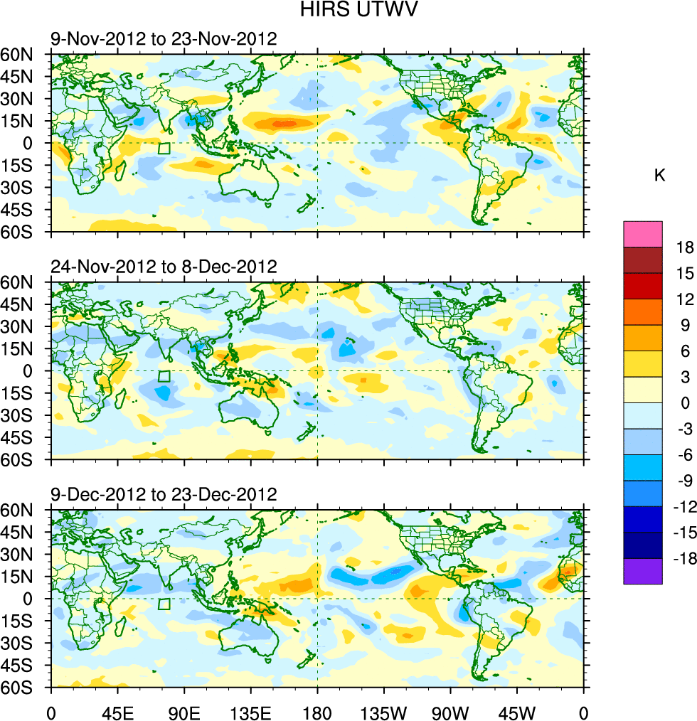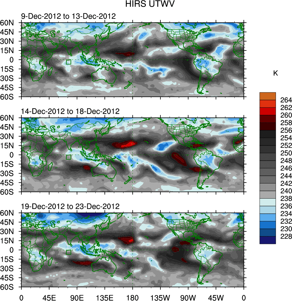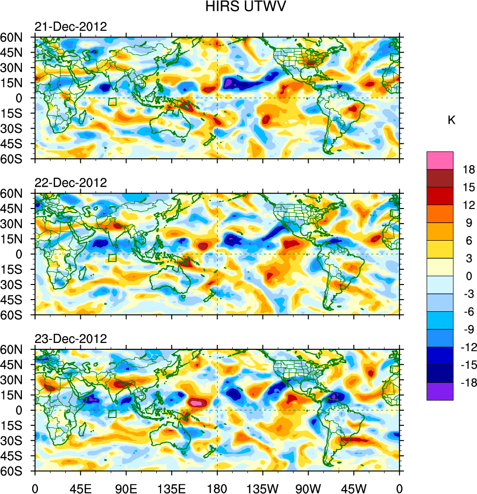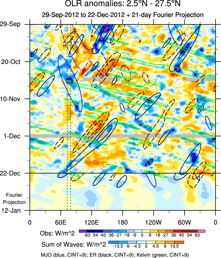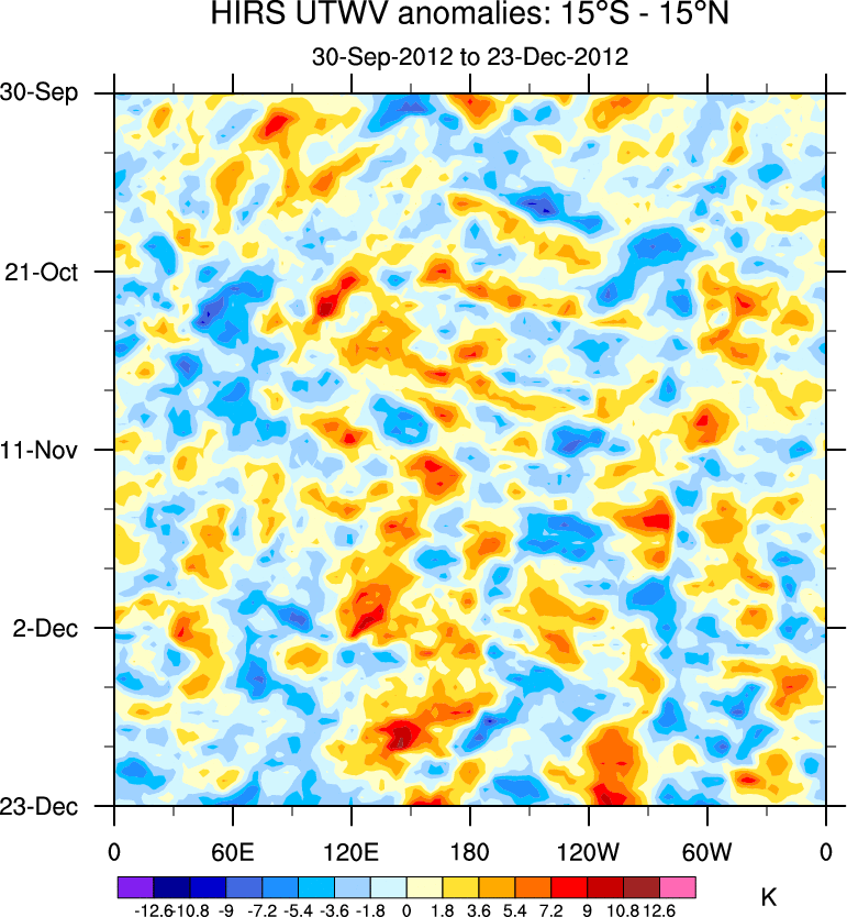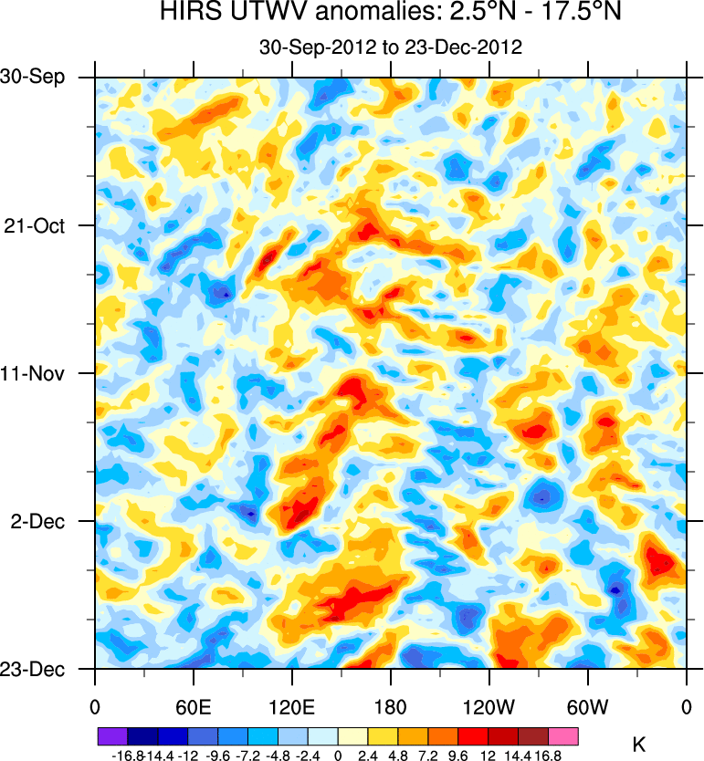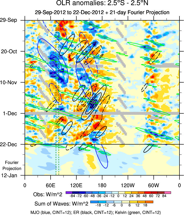 To identify tropical waves in near real-time, the OLR and UTWV data are filtered following Wheeler & Weickmann (2001 MWR). The daily anomalies are calculated using the first 3 harmonics of the seasonal cycle for 1979–2009. Missing values are then filled using linear interpolation in space and time. The most recent 365 days of anomalies are padded with 659 days of zeroes, and the result is filtered for each wave type.