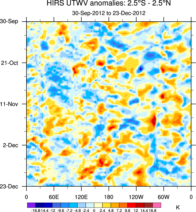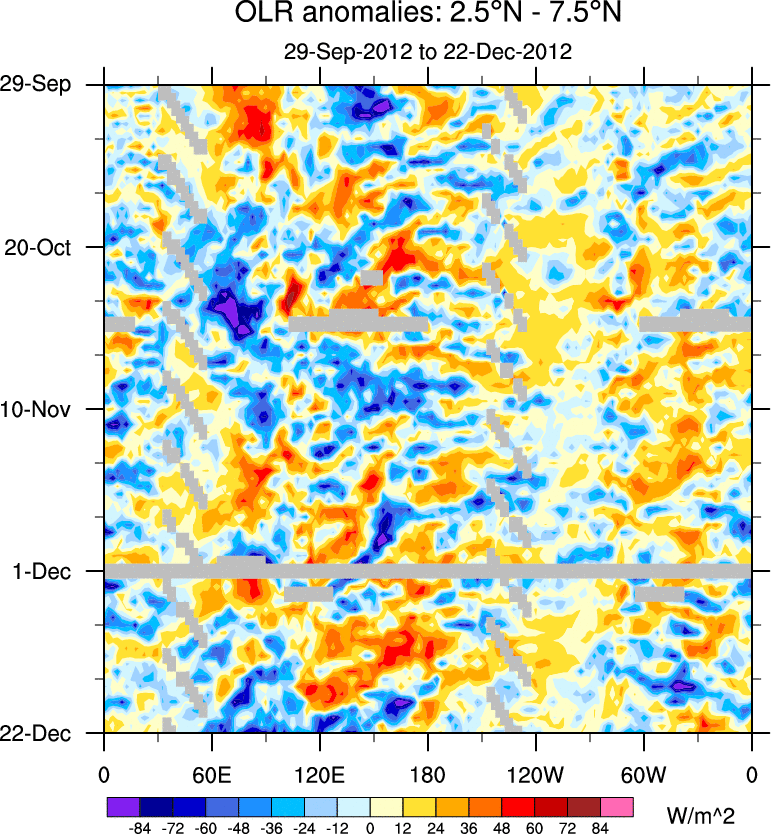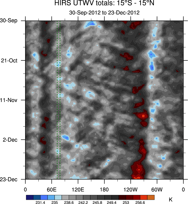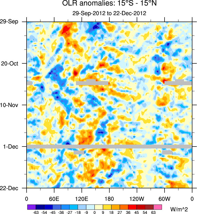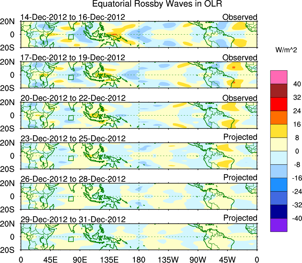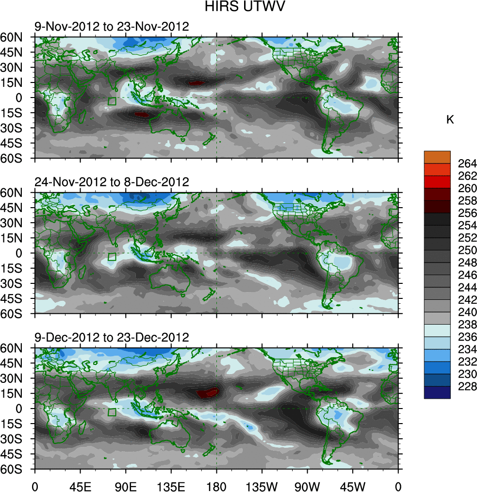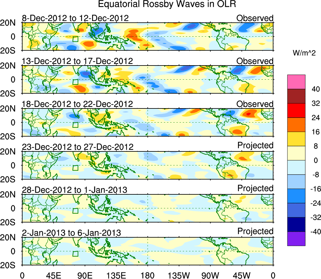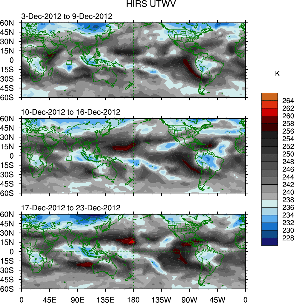 To identify tropical waves in near real-time, the OLR and UTWV data are filtered following Wheeler & Weickmann (2001 MWR). The daily anomalies are calculated using the first 3 harmonics of the seasonal cycle for 1979–2009. Missing values are then filled using linear interpolation in space and time. The most recent 365 days of anomalies are padded with 659 days of zeroes, and the result is filtered for each wave type.