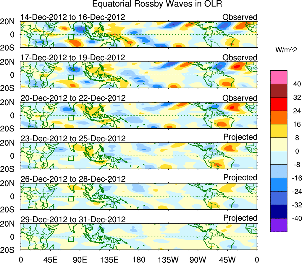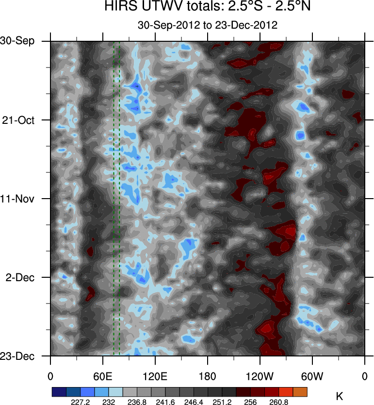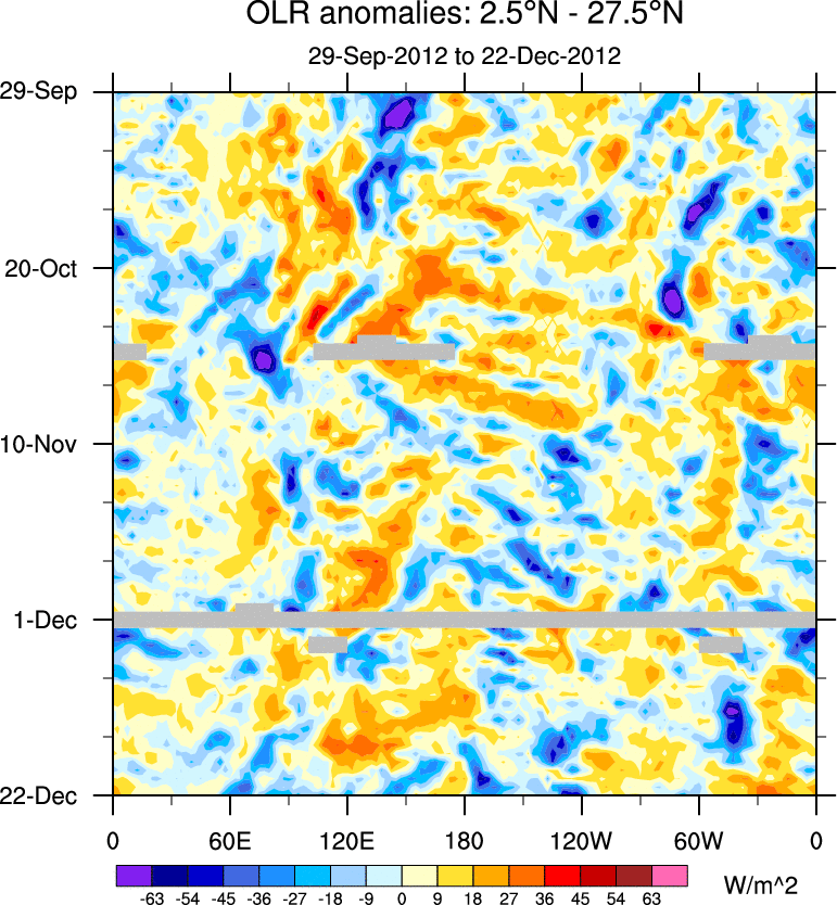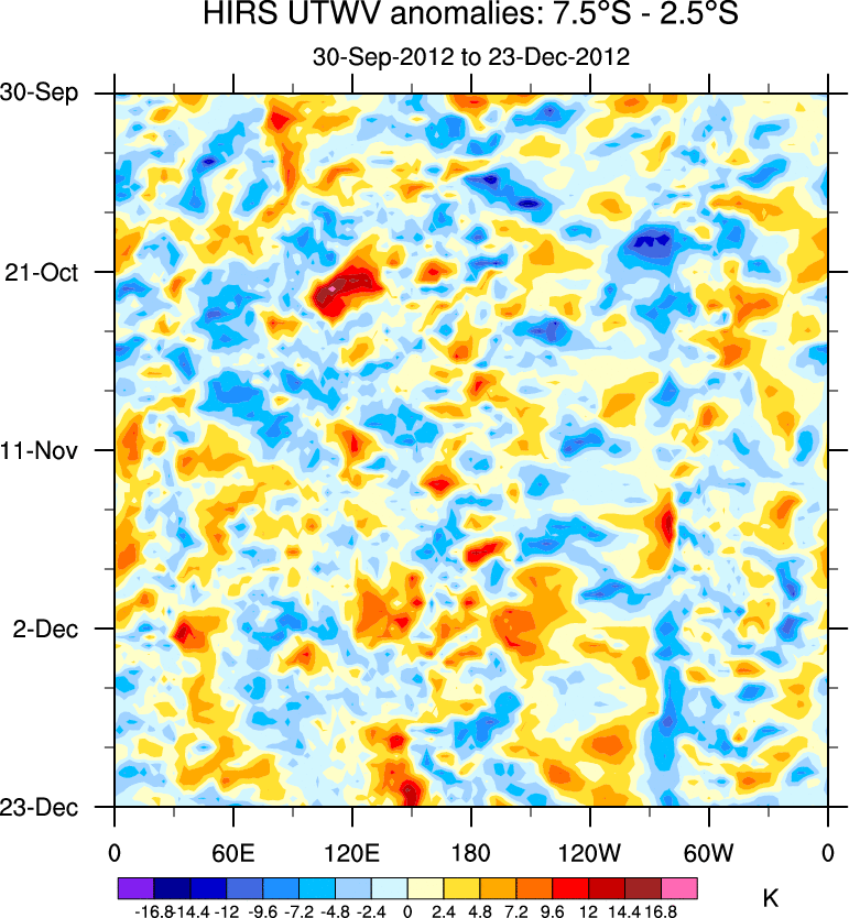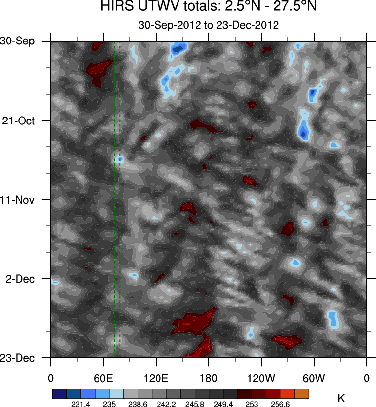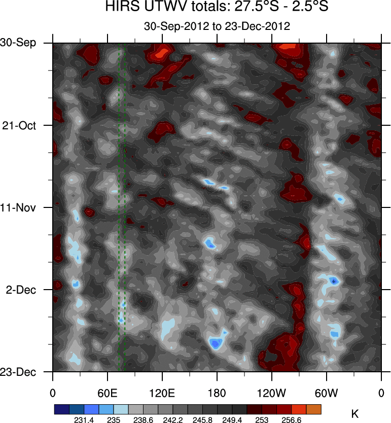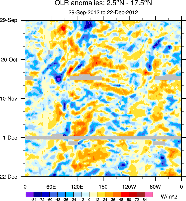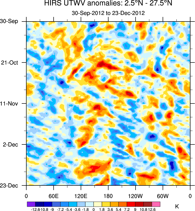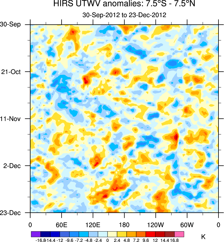 To identify tropical waves in near real-time, the OLR and UTWV data are filtered following Wheeler & Weickmann (2001 MWR). The daily anomalies are calculated using the first 3 harmonics of the seasonal cycle for 1979–2009. Missing values are then filled using linear interpolation in space and time. The most recent 365 days of anomalies are padded with 659 days of zeroes, and the result is filtered for each wave type.