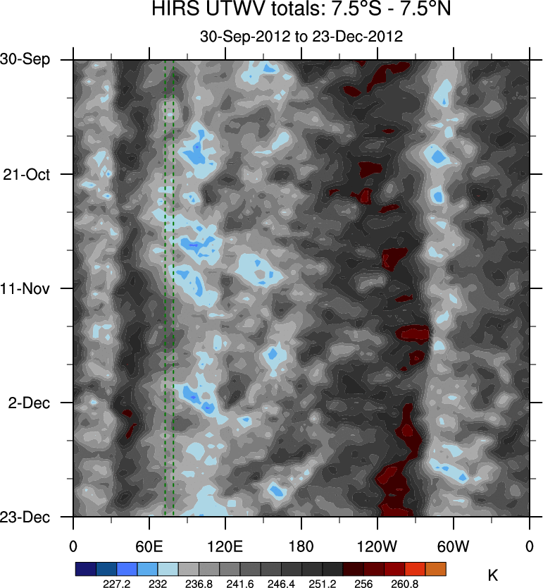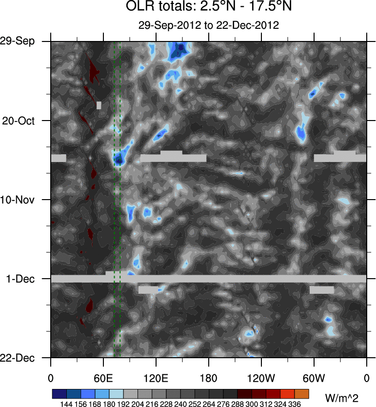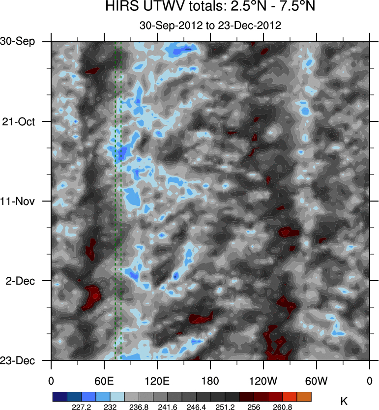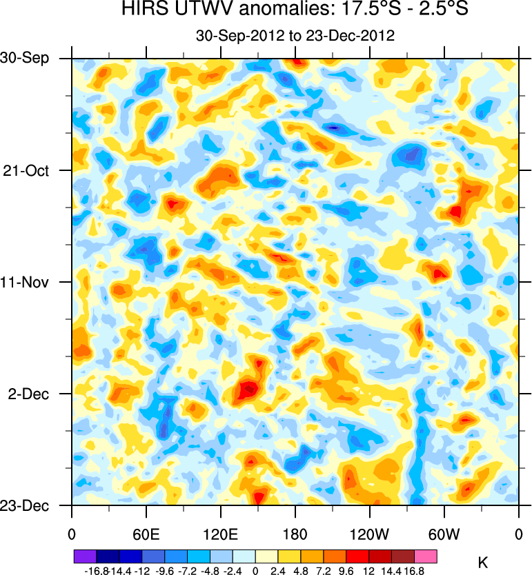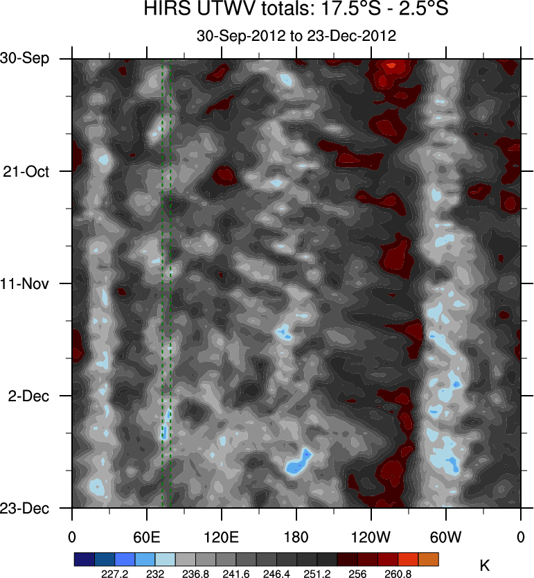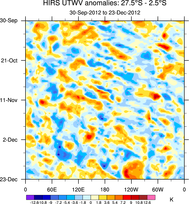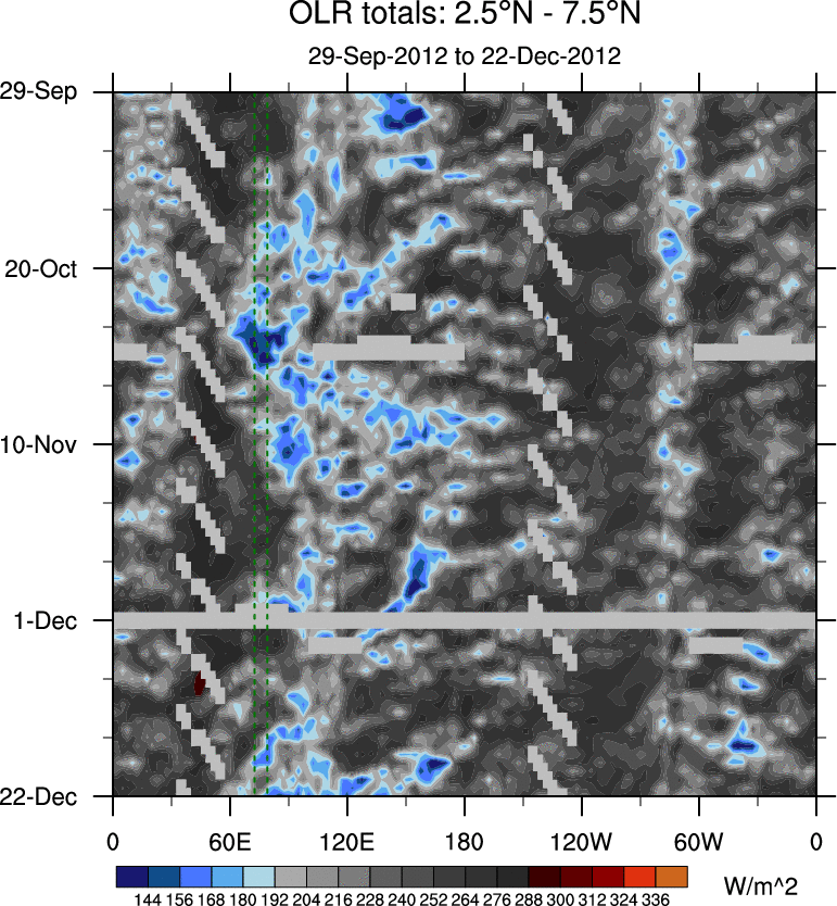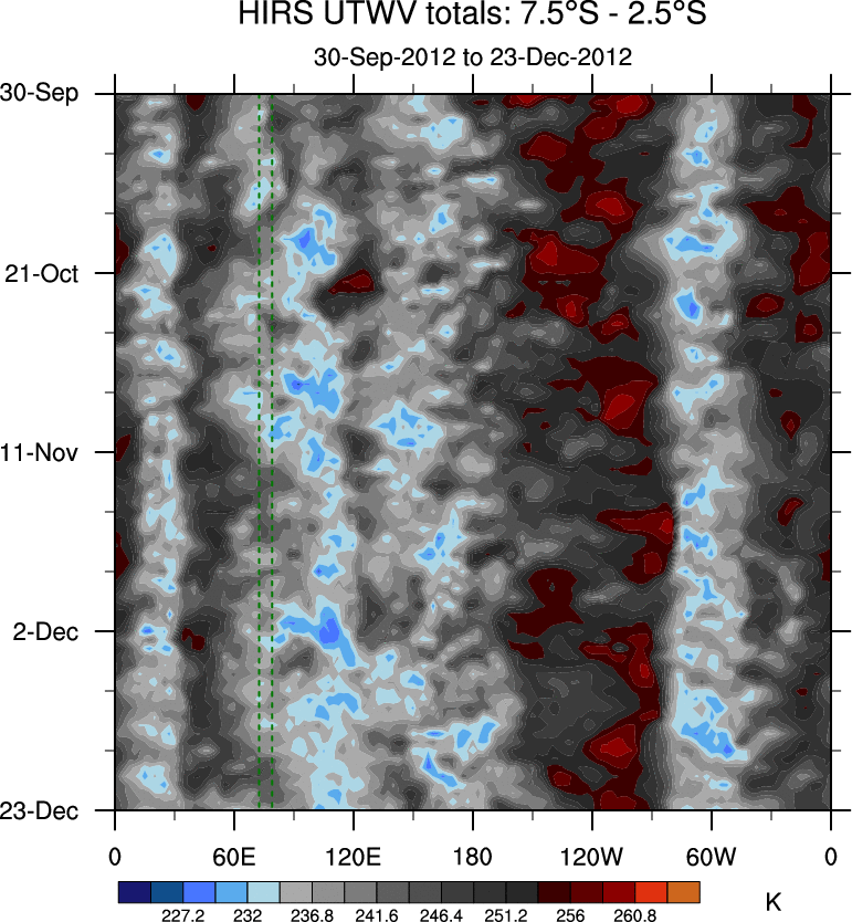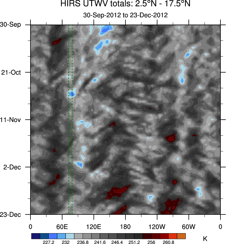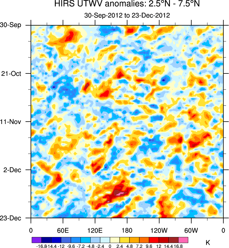 To identify tropical waves in near real-time, the OLR and UTWV data are filtered following Wheeler & Weickmann (2001 MWR). The daily anomalies are calculated using the first 3 harmonics of the seasonal cycle for 1979–2009. Missing values are then filled using linear interpolation in space and time. The most recent 365 days of anomalies are padded with 659 days of zeroes, and the result is filtered for each wave type.