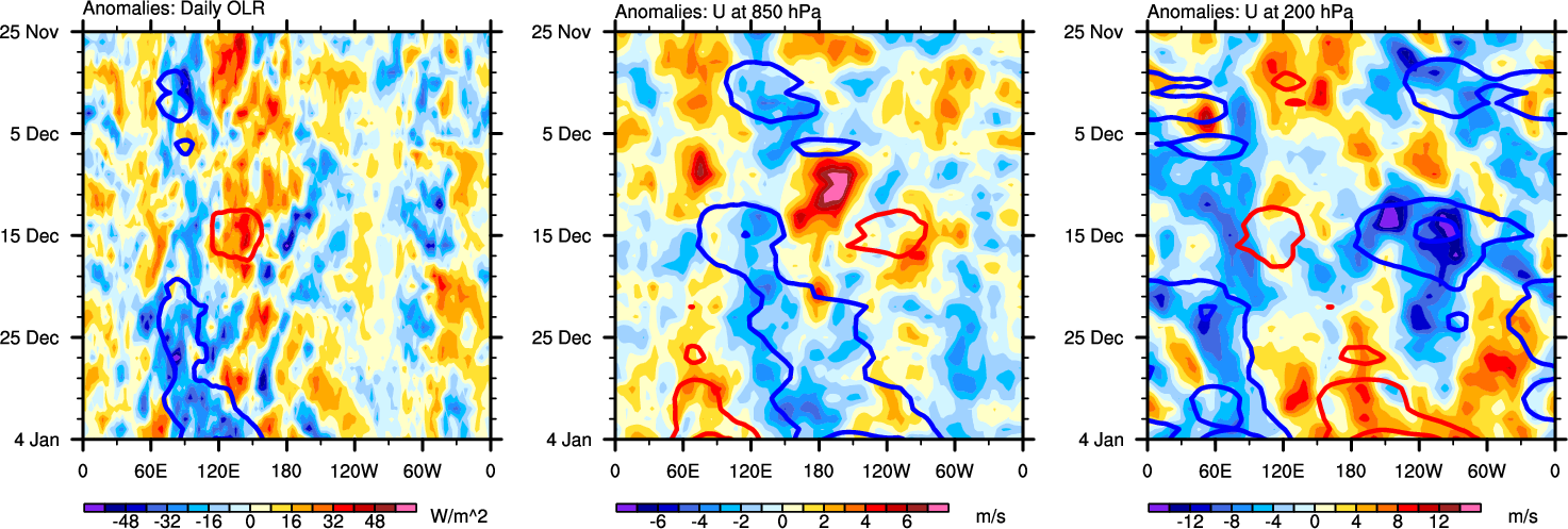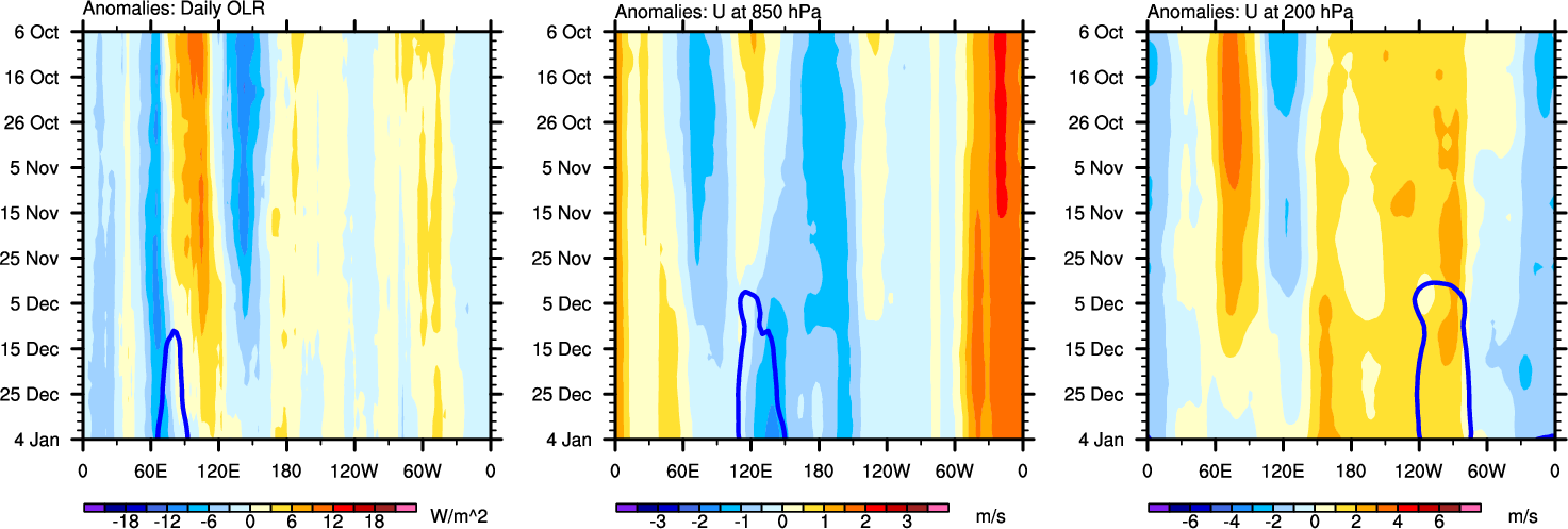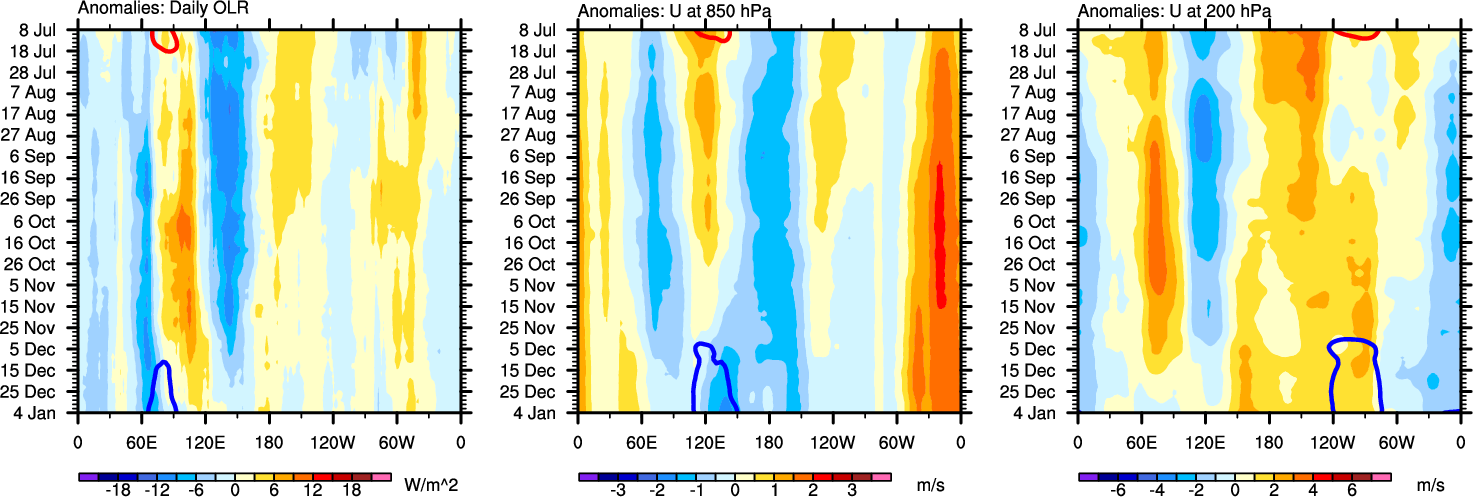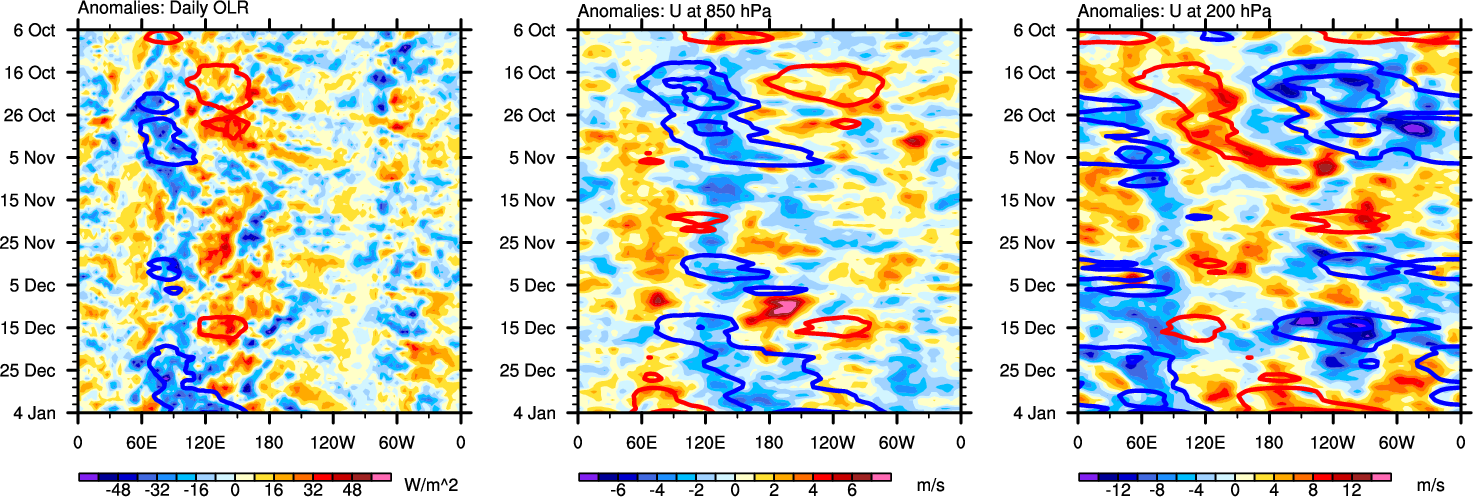 The Hovmollers show longitude-time plots for OLR, U-850, and U-200. The shading indicates the observed anomalies, while the contours are the projection of those anomalies onto the RMM EOFs.