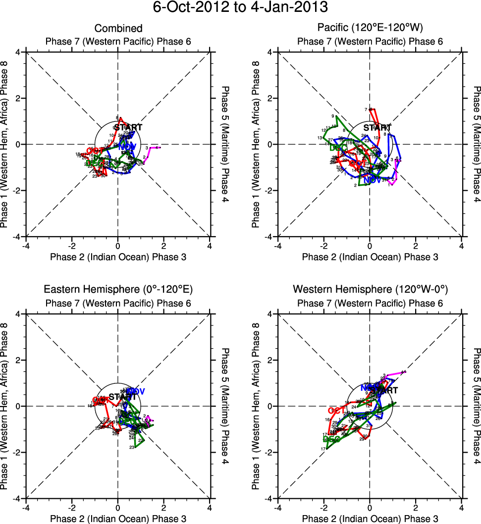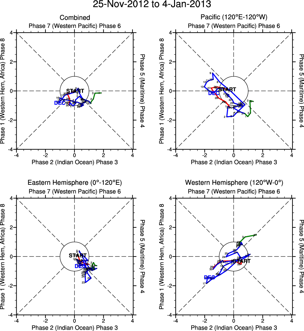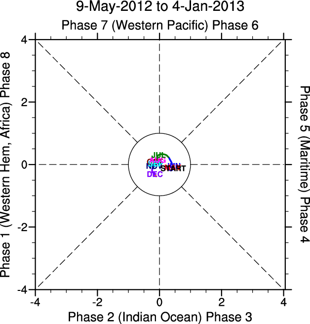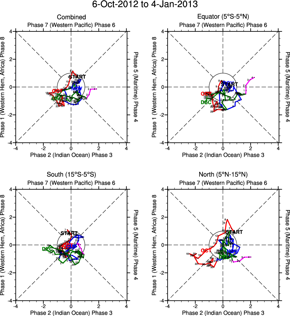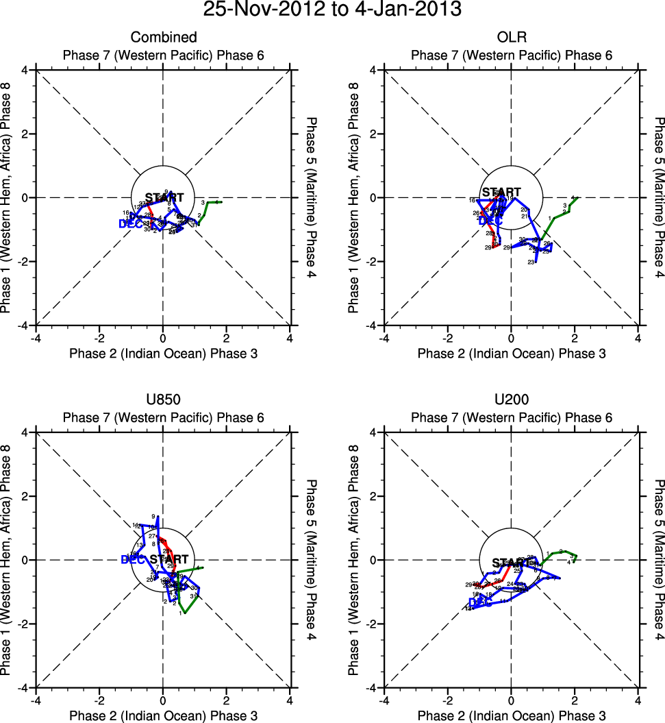 Wheeler and Hendon (2004) constructed the RMM index for monitoring the MJO. This index consists of the first two principal components (PCs) of OLR, 850-hPa zonal wind, and 200-hPa zonal wind averaged 15S-15N.