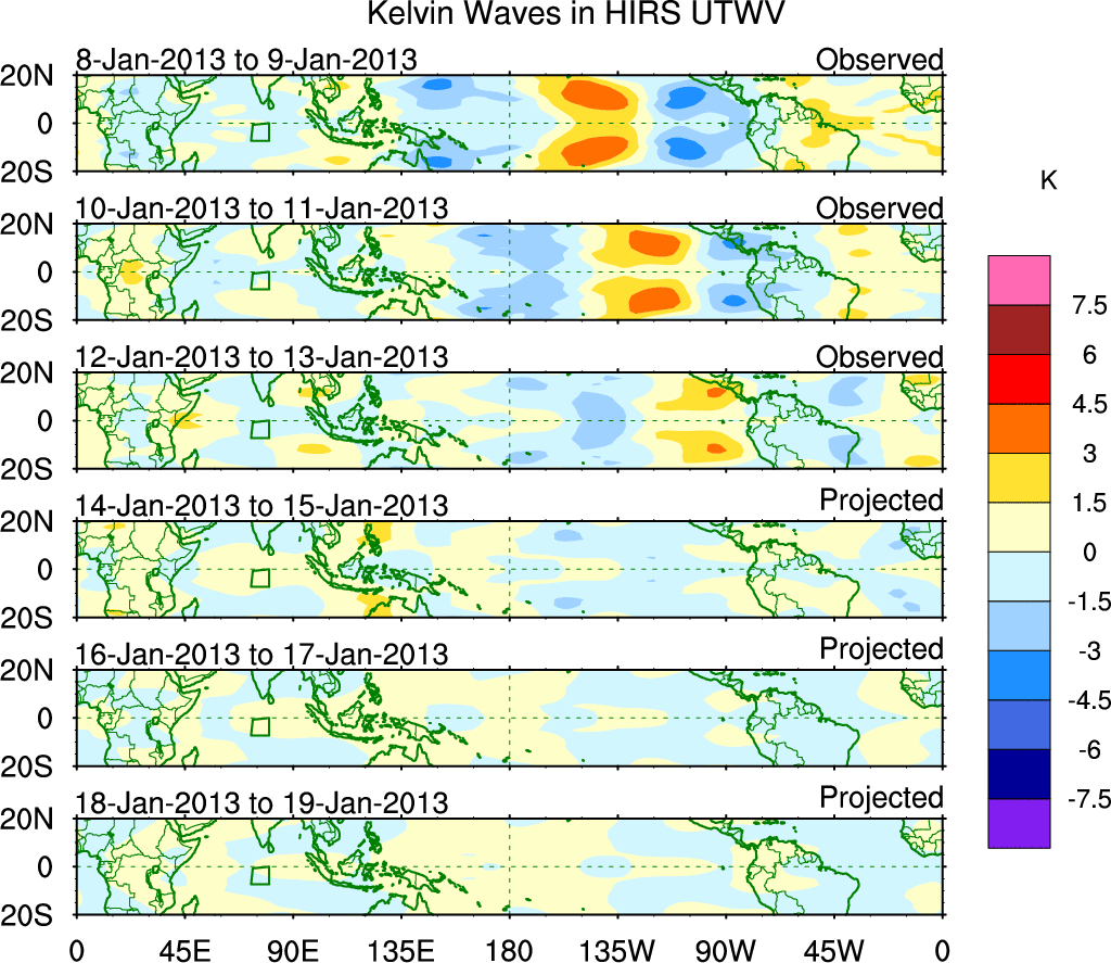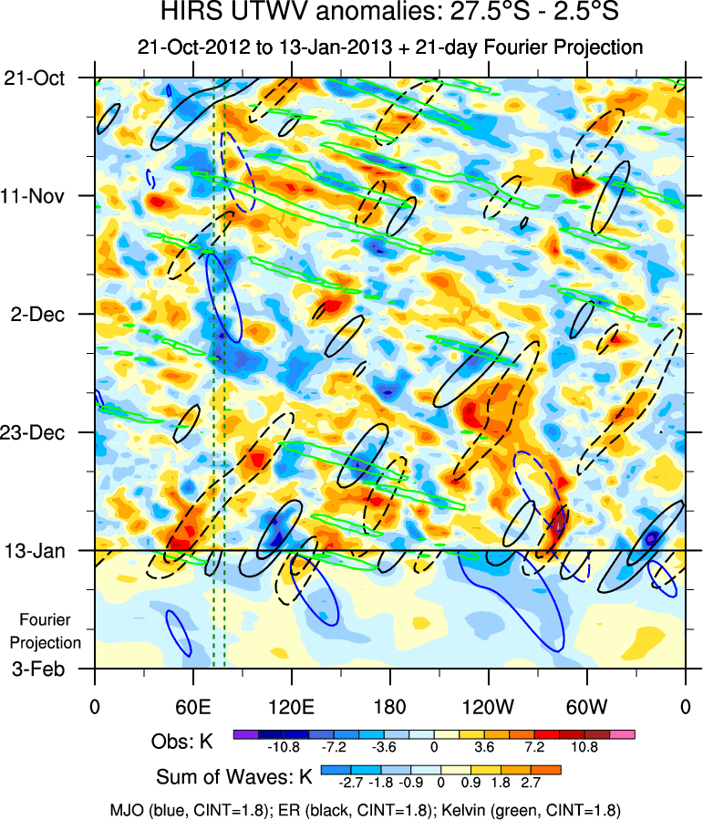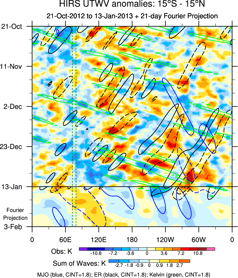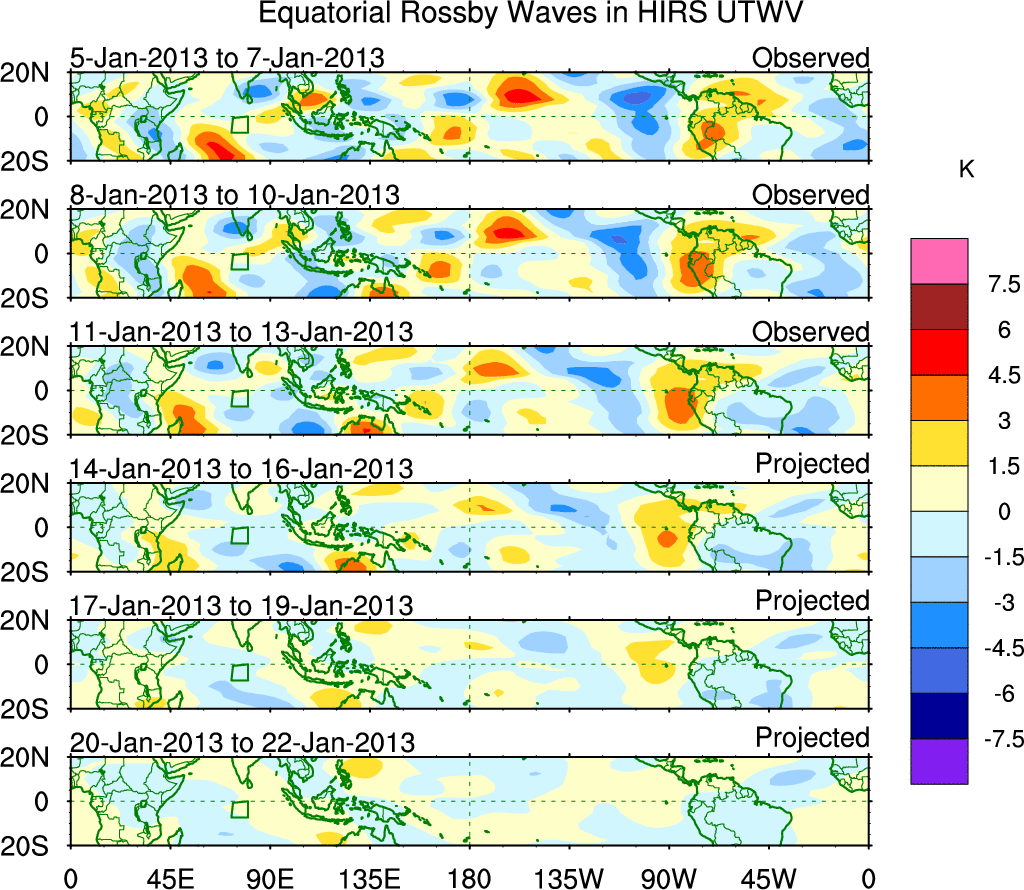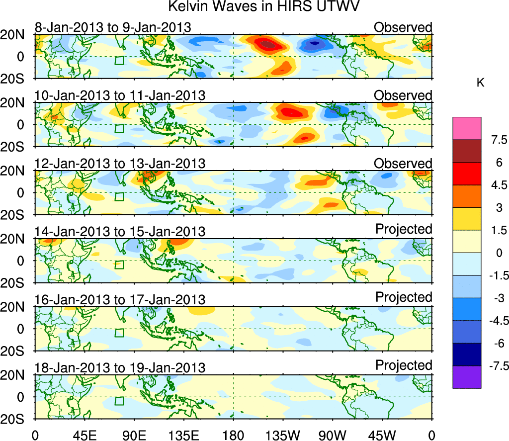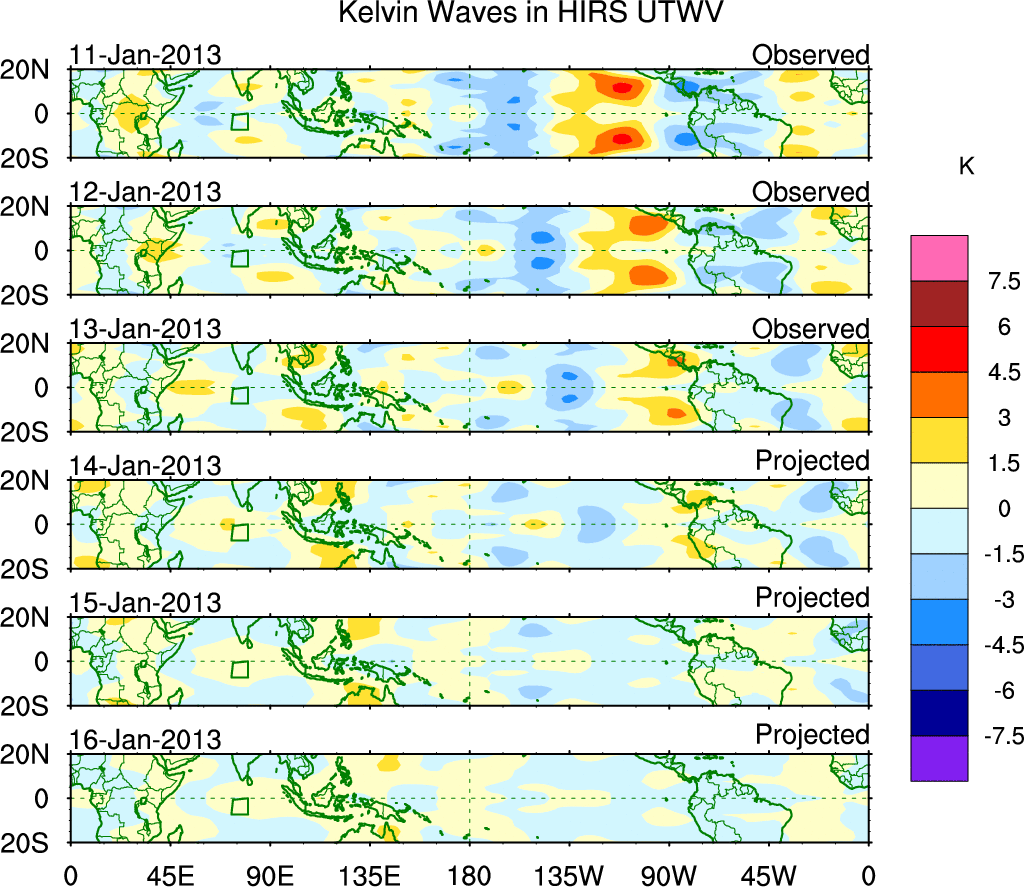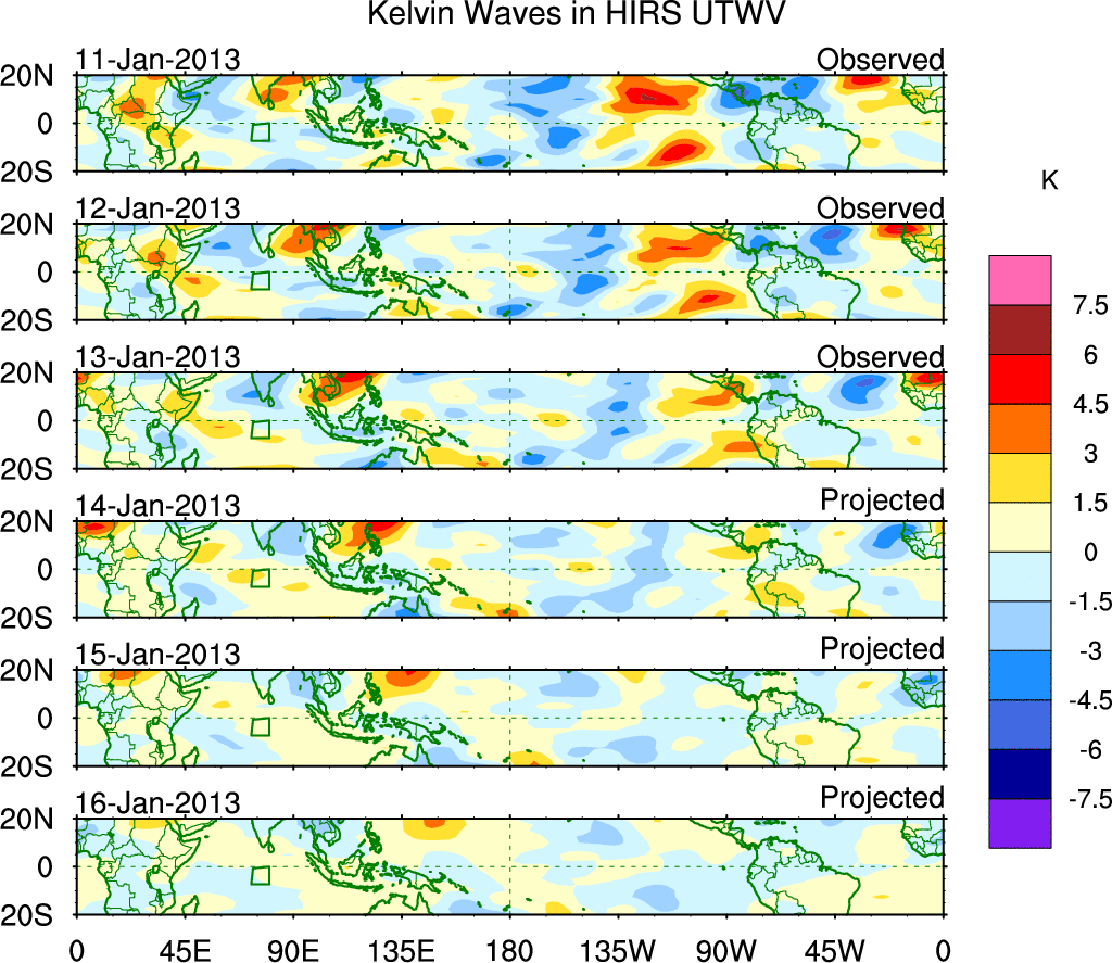 To identify tropical waves in near real-time, the OLR and UTWV data are filtered following Wheeler & Weickmann (2001 MWR). The daily anomalies are calculated using the first 3 harmonics of the seasonal cycle for 1979–2009. Missing values are then filled using linear interpolation in space and time. The most recent 365 days of anomalies are padded with 659 days of zeroes, and the result is filtered for each wave type.
