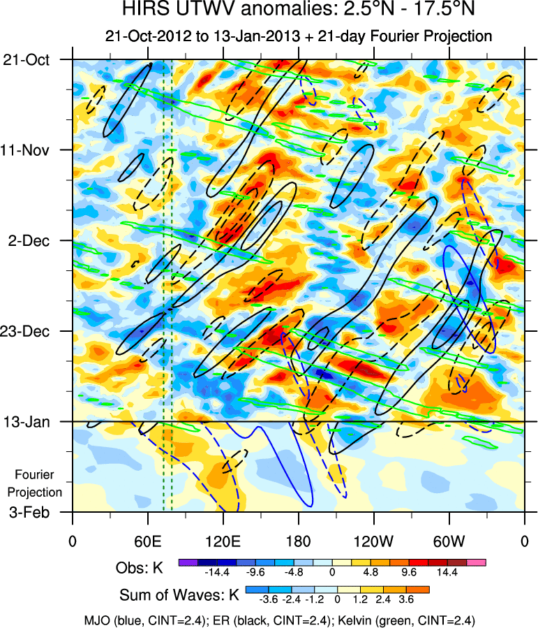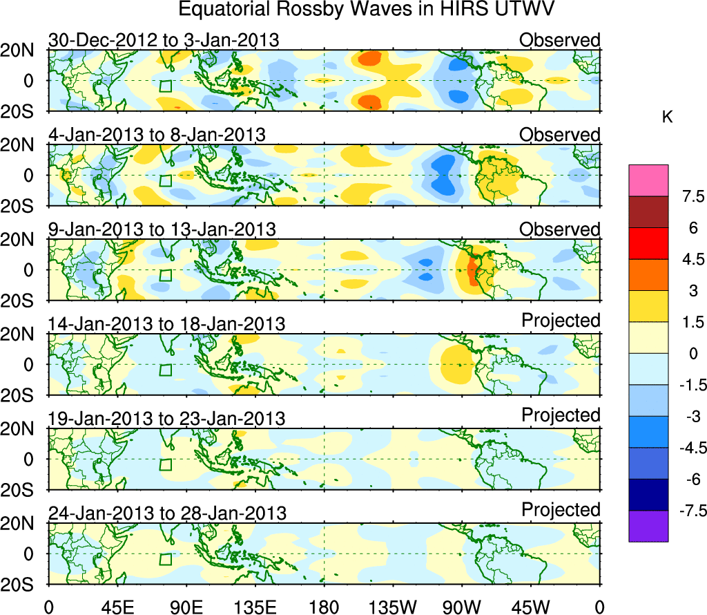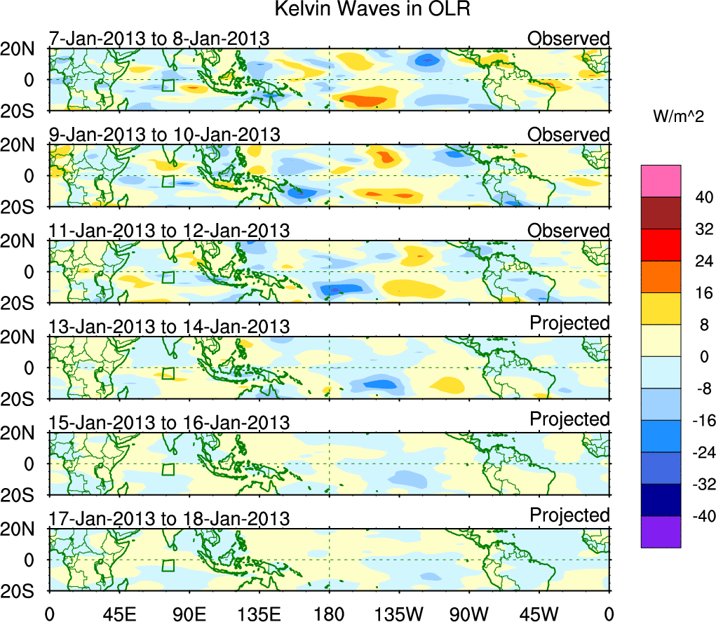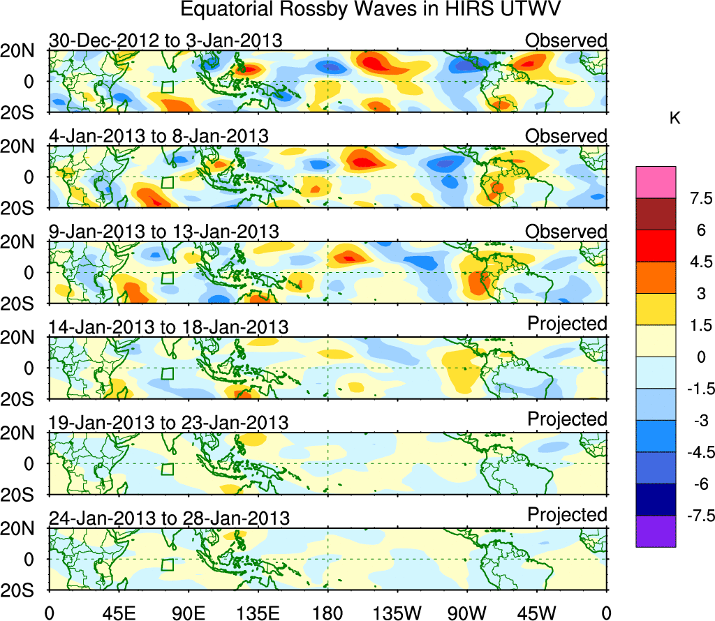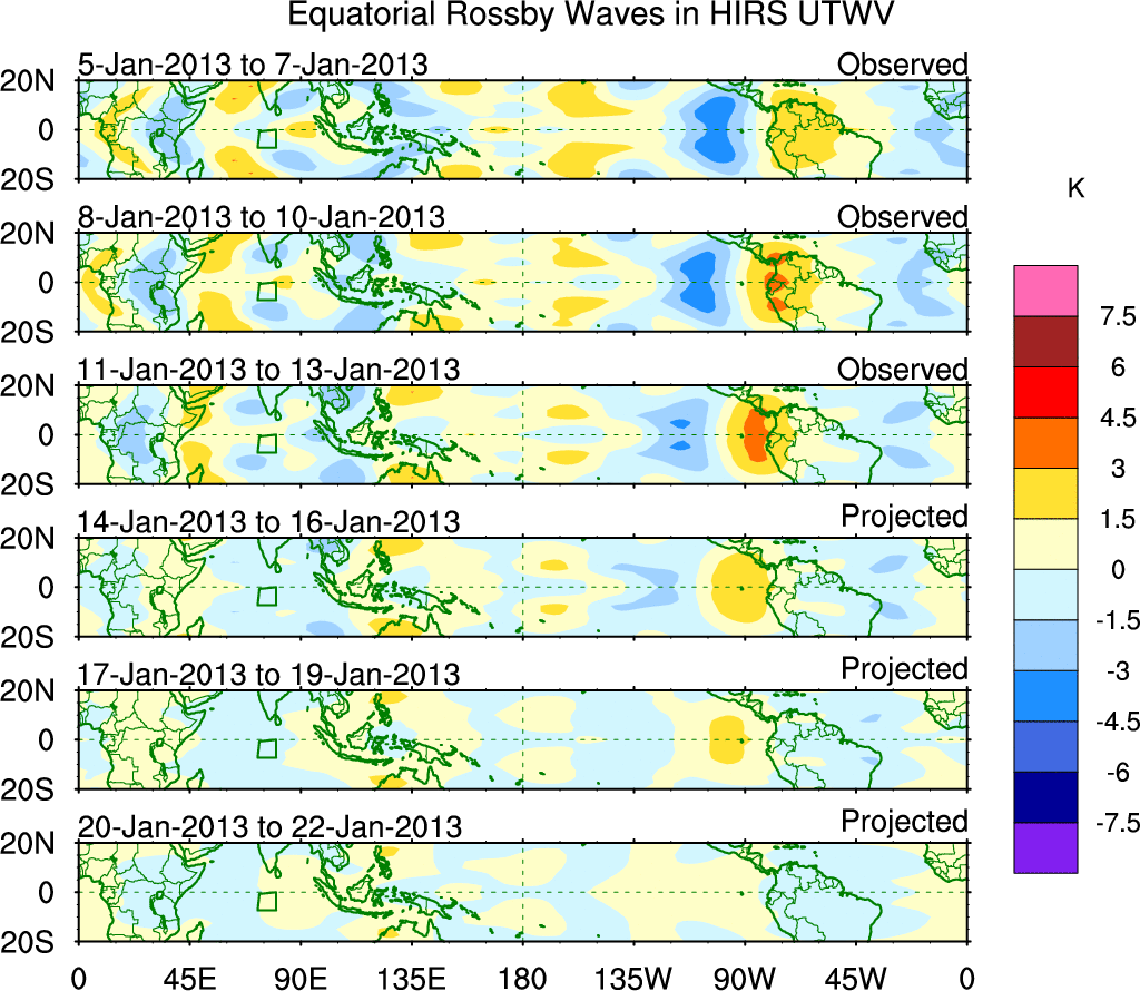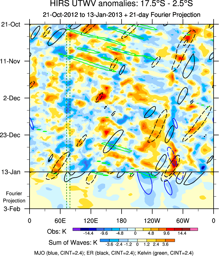 To identify tropical waves in near real-time, the OLR and UTWV data are filtered following Wheeler & Weickmann (2001 MWR). The daily anomalies are calculated using the first 3 harmonics of the seasonal cycle for 1979–2009. Missing values are then filled using linear interpolation in space and time. The most recent 365 days of anomalies are padded with 659 days of zeroes, and the result is filtered for each wave type.