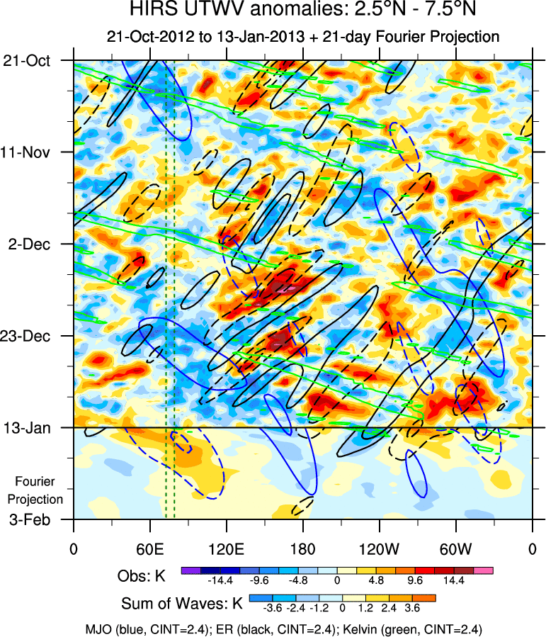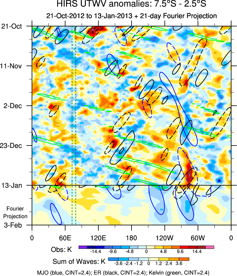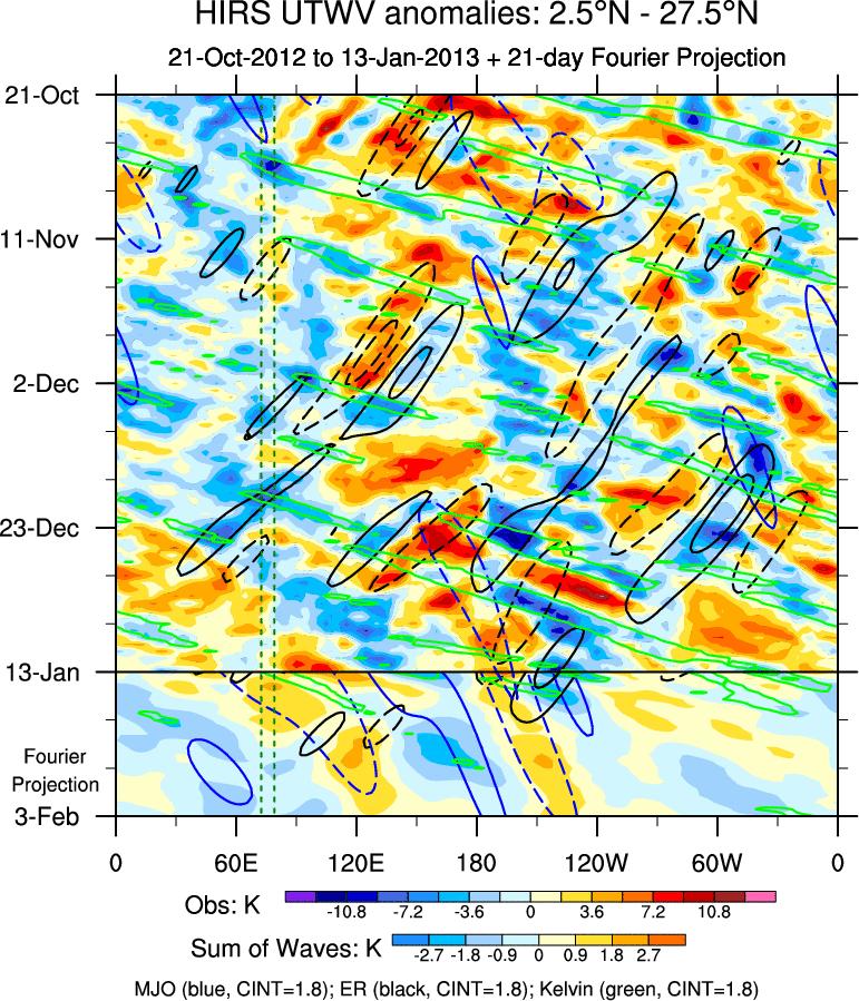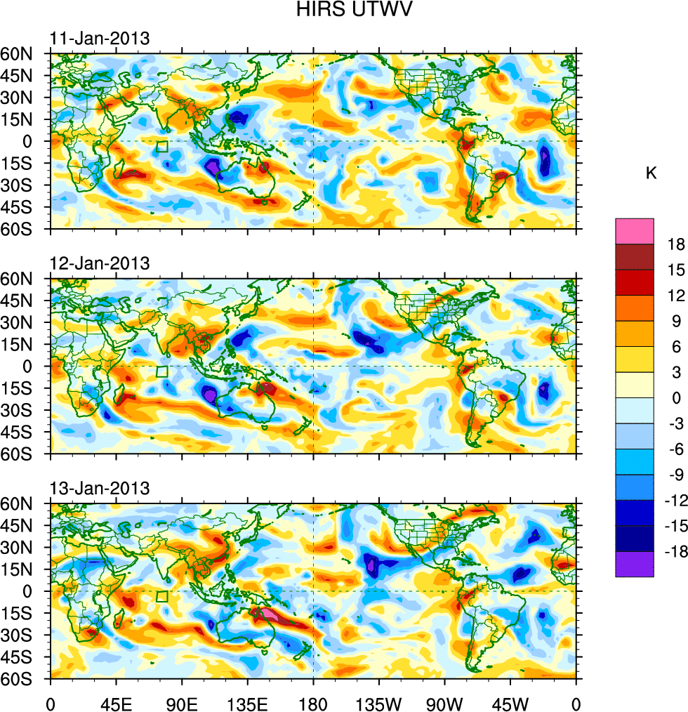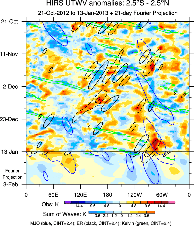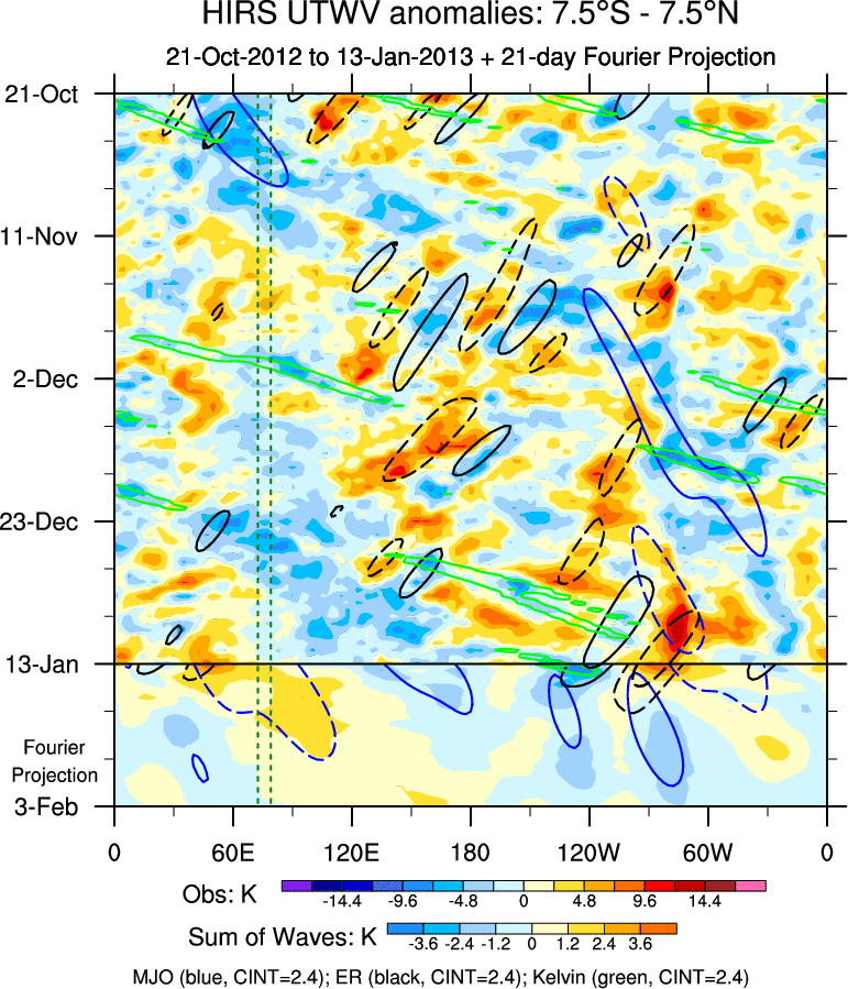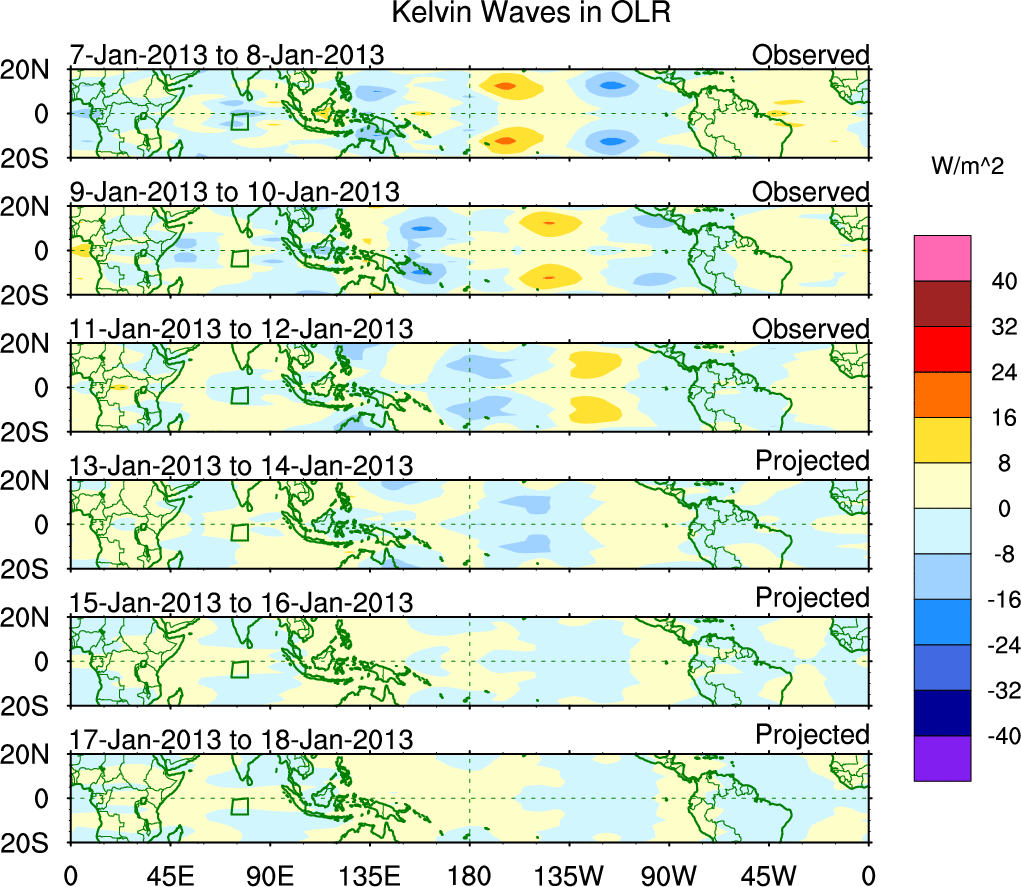 To identify tropical waves in near real-time, the OLR and UTWV data are filtered following Wheeler & Weickmann (2001 MWR). The daily anomalies are calculated using the first 3 harmonics of the seasonal cycle for 1979–2009. Missing values are then filled using linear interpolation in space and time. The most recent 365 days of anomalies are padded with 659 days of zeroes, and the result is filtered for each wave type.