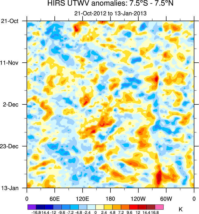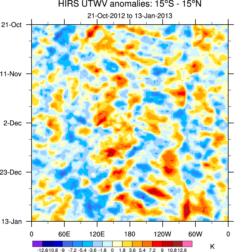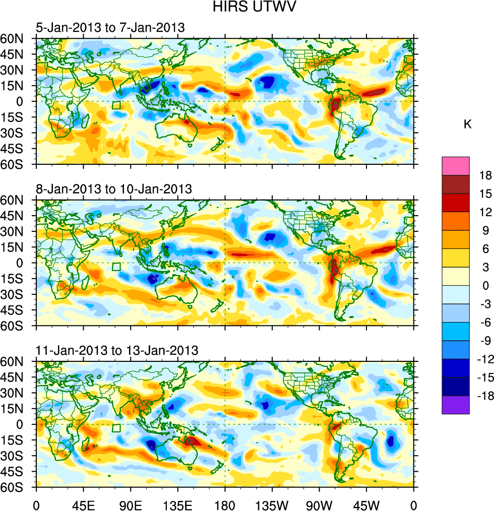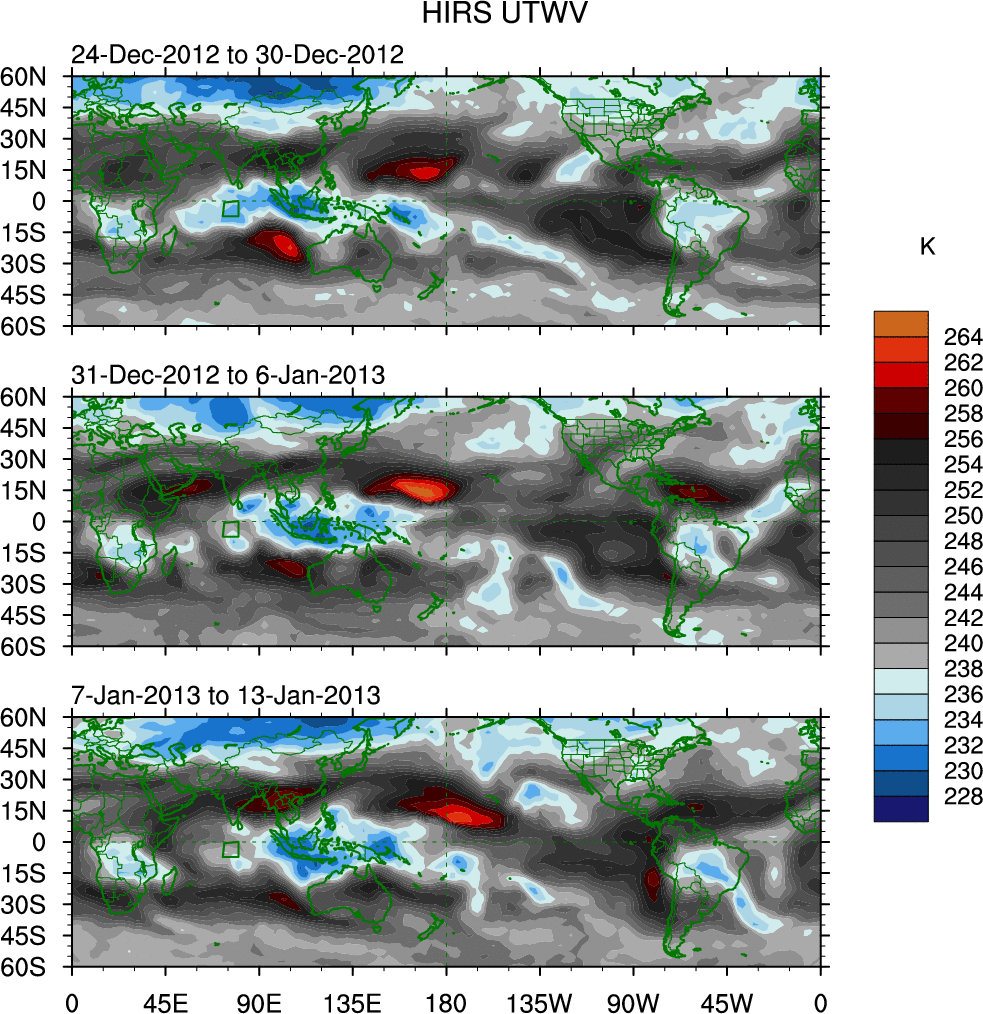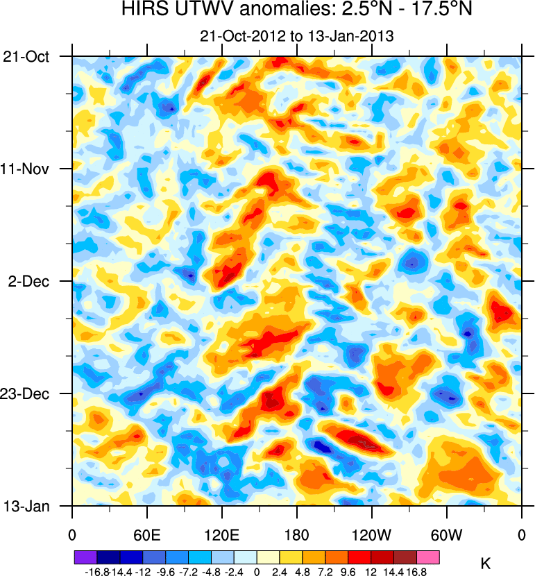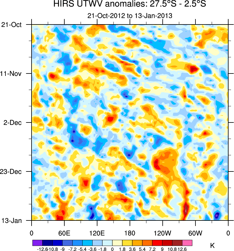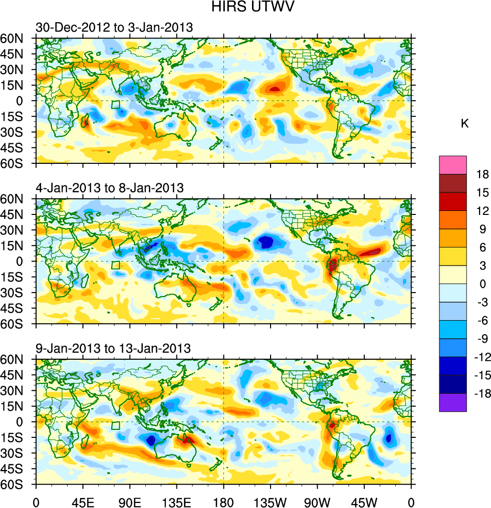 To identify tropical waves in near real-time, the OLR and UTWV data are filtered following Wheeler & Weickmann (2001 MWR). The daily anomalies are calculated using the first 3 harmonics of the seasonal cycle for 1979–2009. Missing values are then filled using linear interpolation in space and time. The most recent 365 days of anomalies are padded with 659 days of zeroes, and the result is filtered for each wave type.