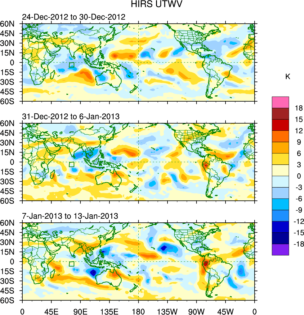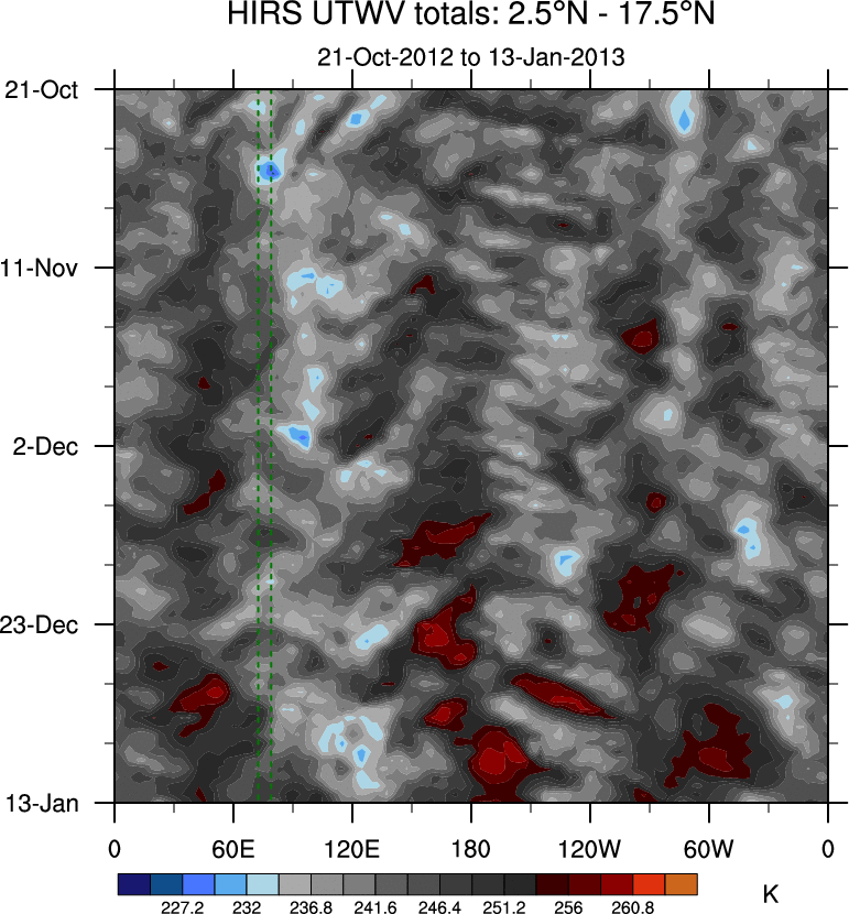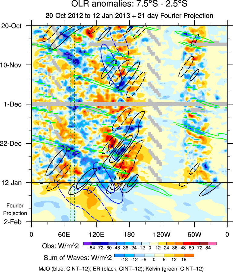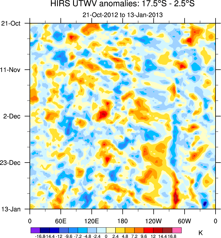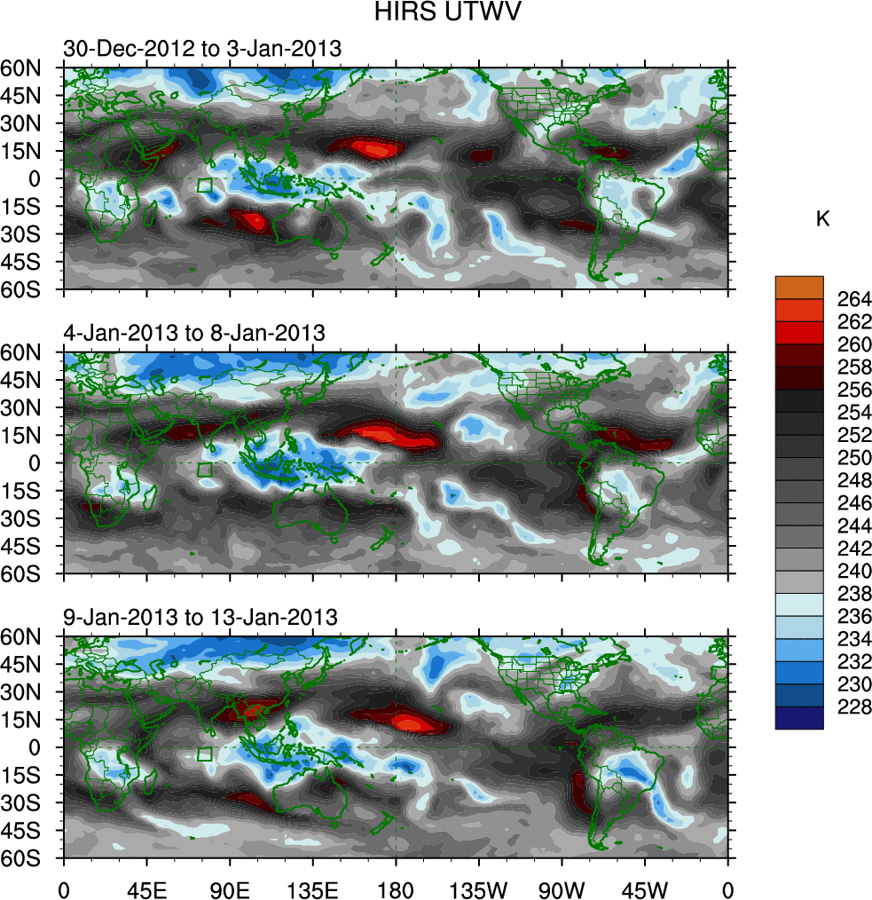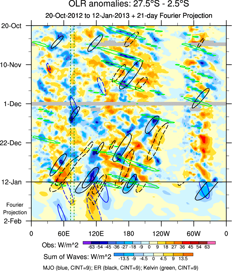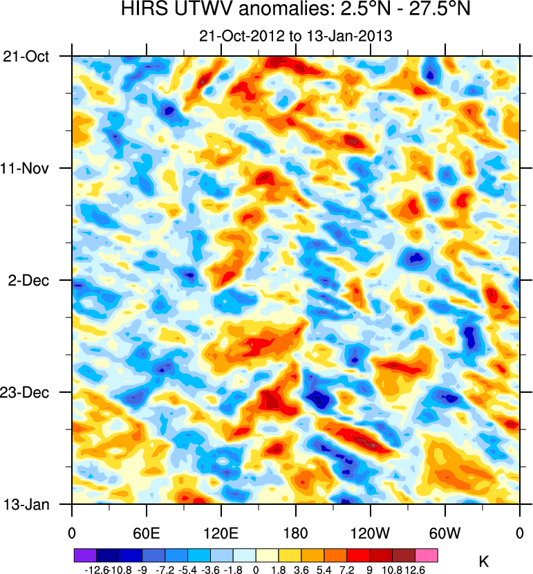 To identify tropical waves in near real-time, the OLR and UTWV data are filtered following Wheeler & Weickmann (2001 MWR). The daily anomalies are calculated using the first 3 harmonics of the seasonal cycle for 1979–2009. Missing values are then filled using linear interpolation in space and time. The most recent 365 days of anomalies are padded with 659 days of zeroes, and the result is filtered for each wave type.