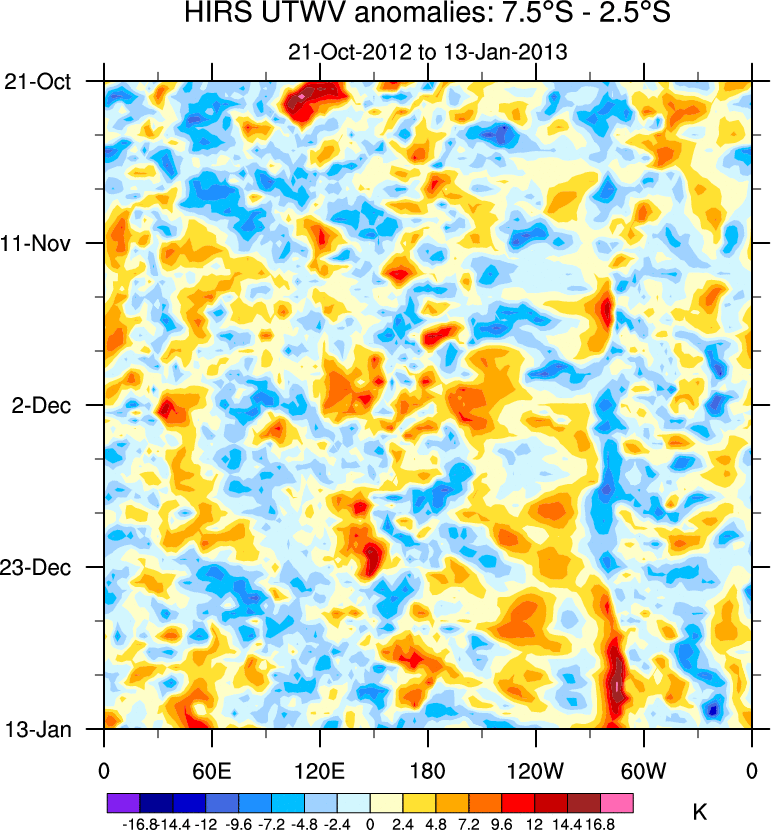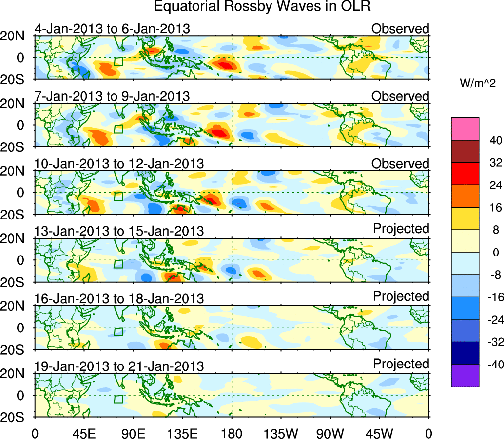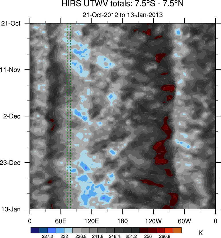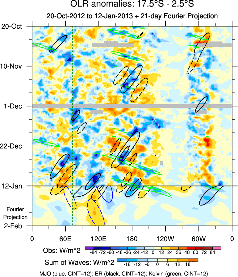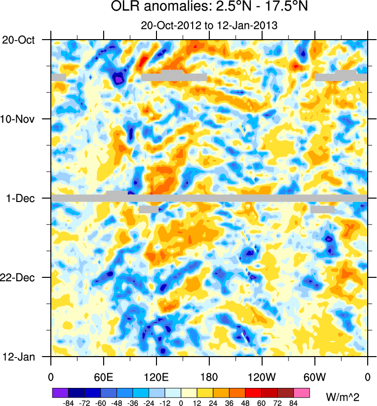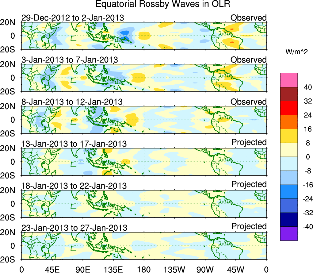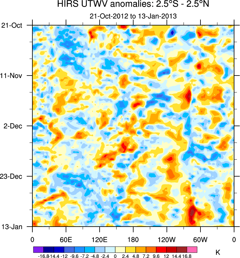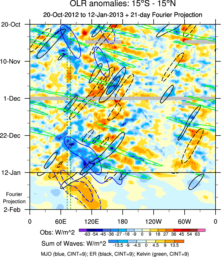 To identify tropical waves in near real-time, the OLR and UTWV data are filtered following Wheeler & Weickmann (2001 MWR). The daily anomalies are calculated using the first 3 harmonics of the seasonal cycle for 1979–2009. Missing values are then filled using linear interpolation in space and time. The most recent 365 days of anomalies are padded with 659 days of zeroes, and the result is filtered for each wave type.