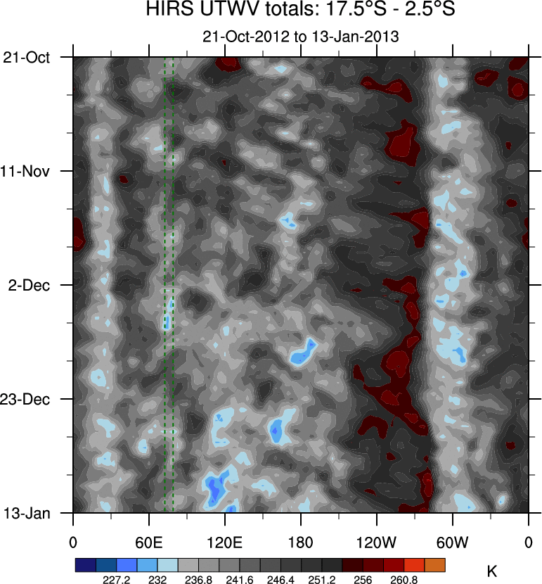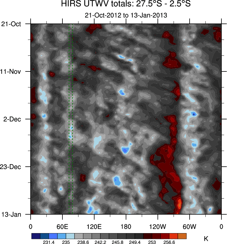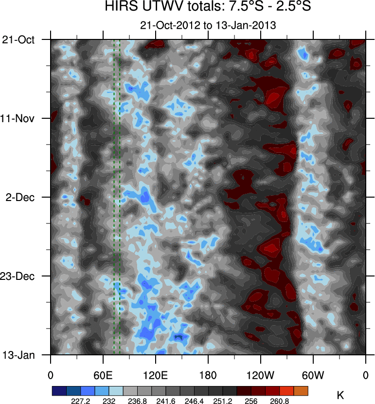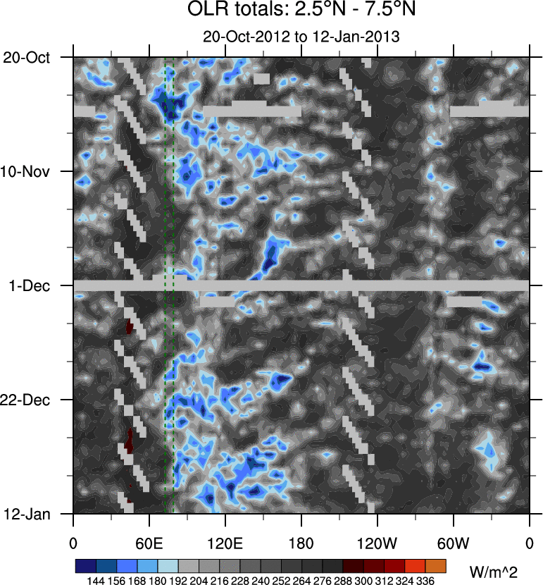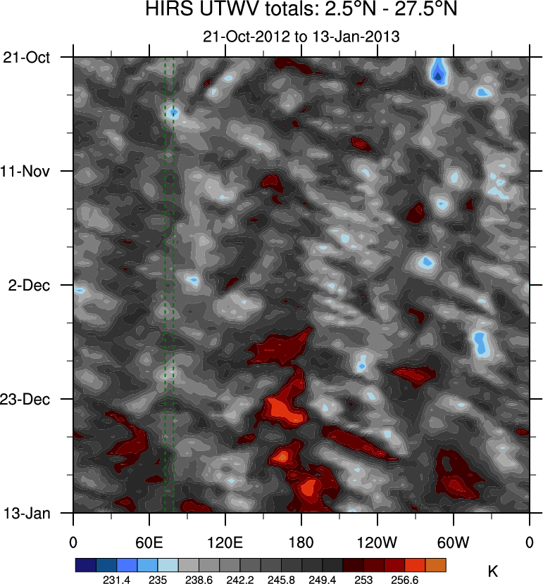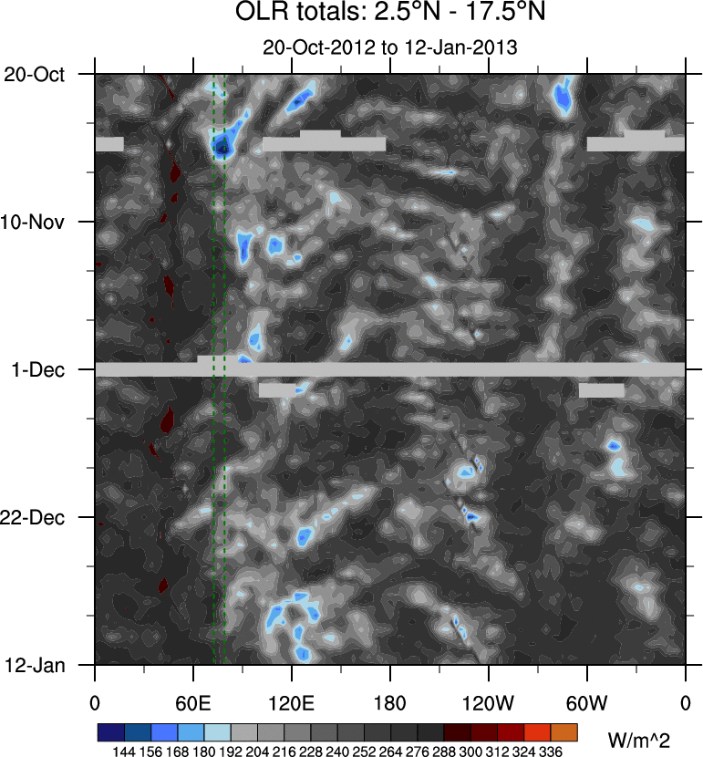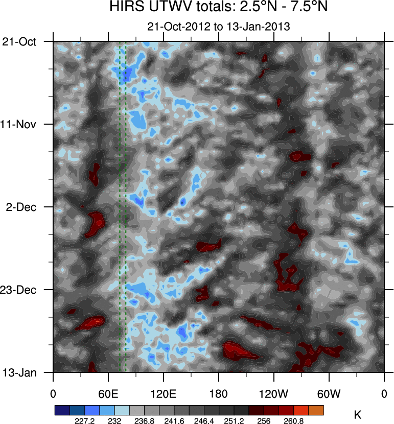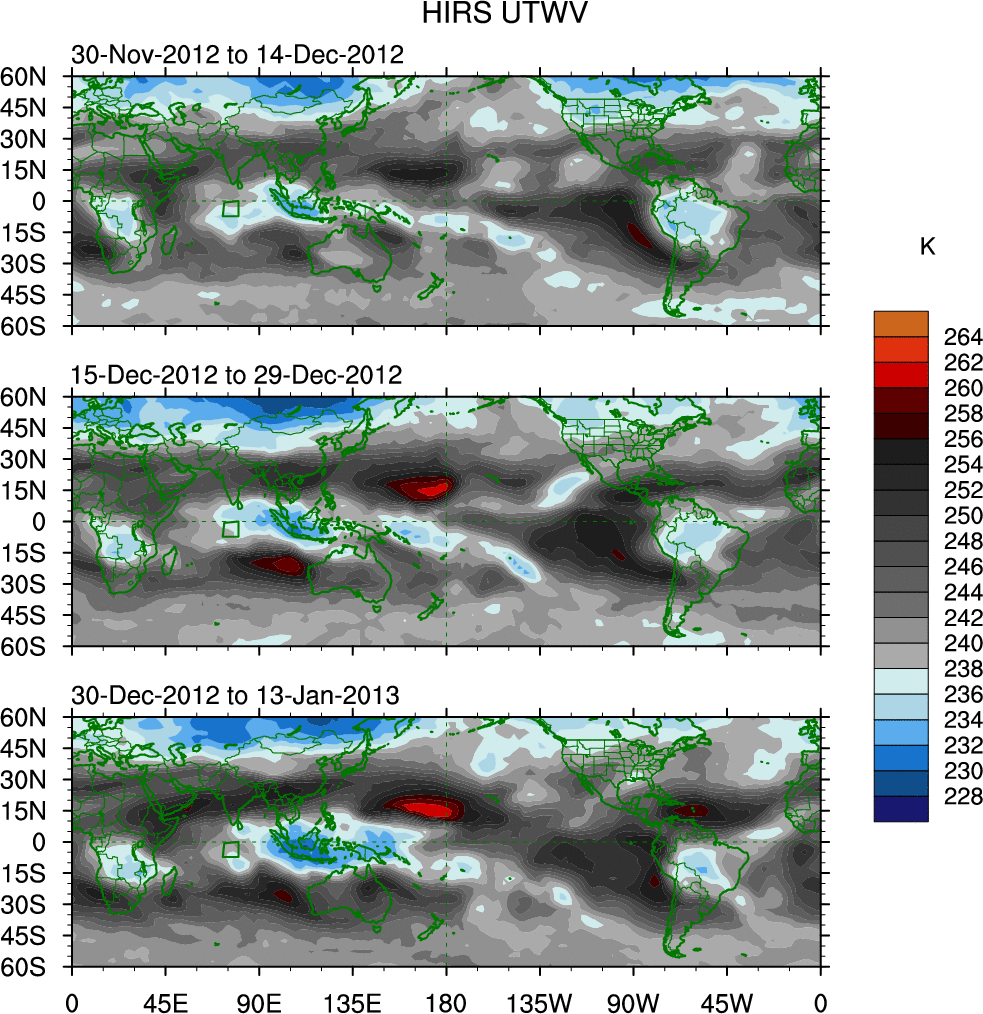 To identify tropical waves in near real-time, the OLR and UTWV data are filtered following Wheeler & Weickmann (2001 MWR). The daily anomalies are calculated using the first 3 harmonics of the seasonal cycle for 1979–2009. Missing values are then filled using linear interpolation in space and time. The most recent 365 days of anomalies are padded with 659 days of zeroes, and the result is filtered for each wave type.