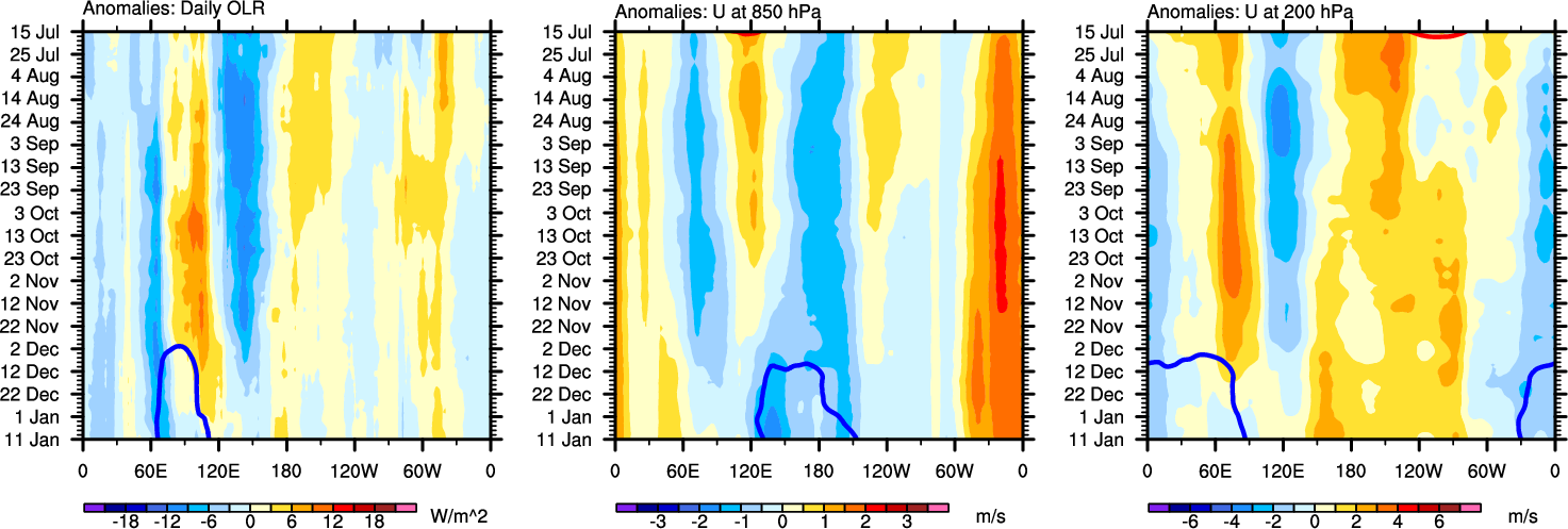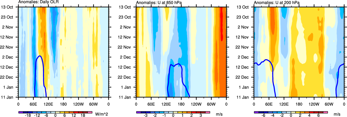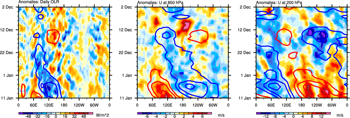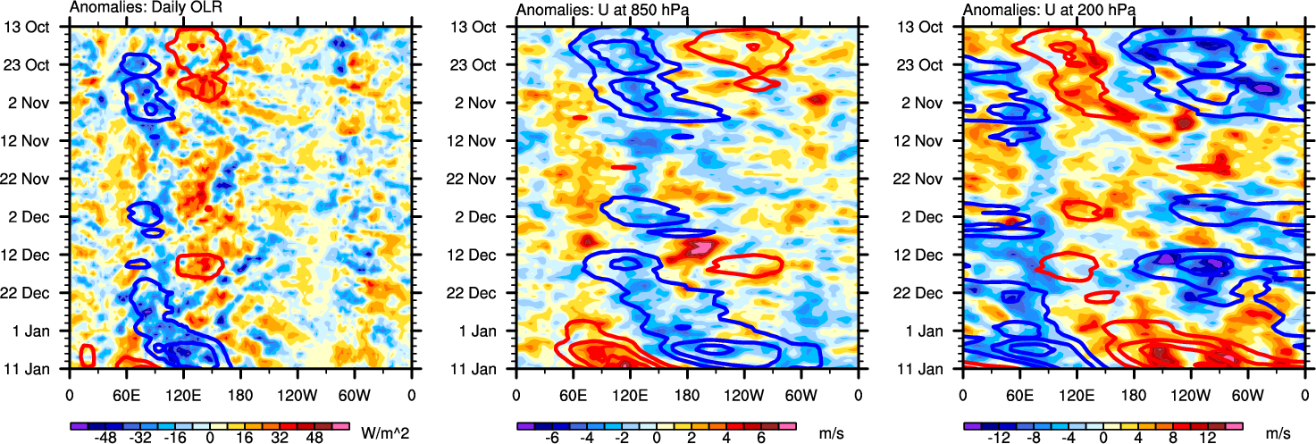 The Hovmollers show longitude-time plots for OLR, U-850, and U-200. The shading indicates the observed anomalies, while the contours are the projection of those anomalies onto the RMM EOFs.
