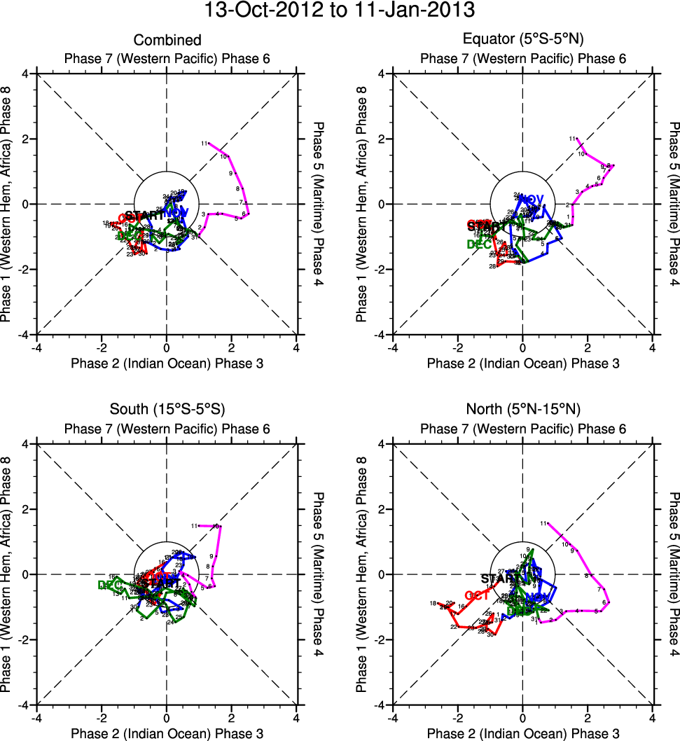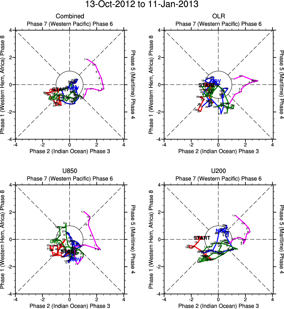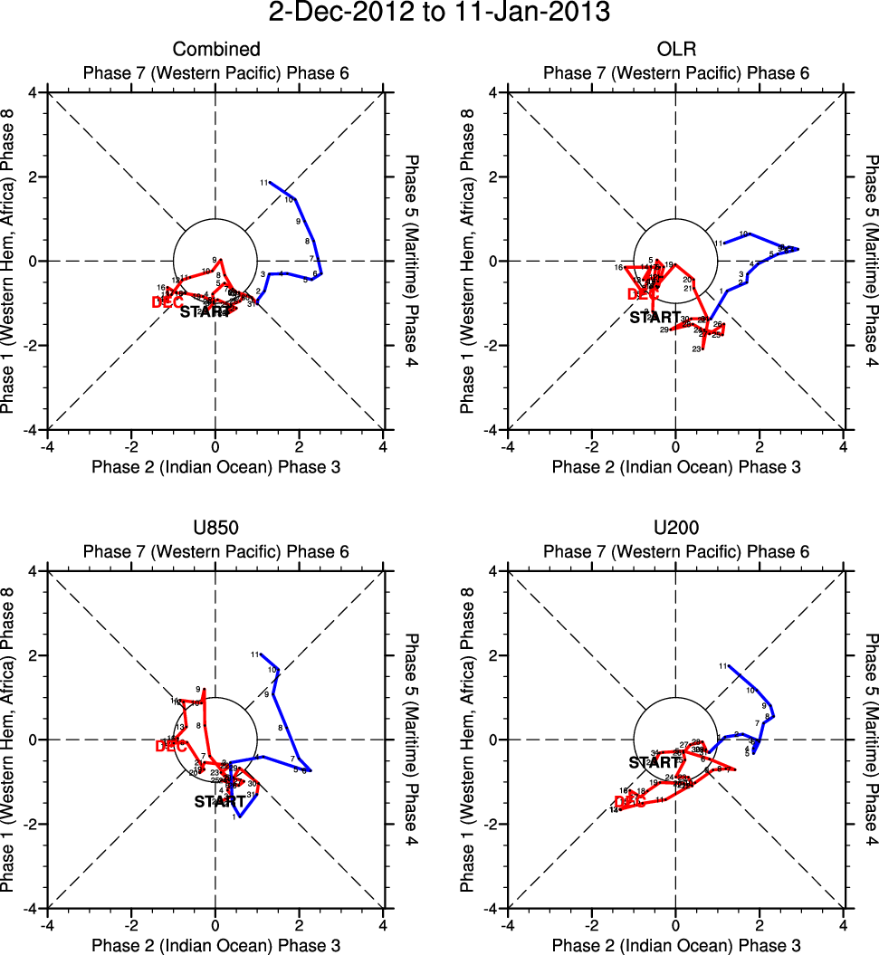 Wheeler and Hendon (2004) constructed the RMM index for monitoring the MJO. This index consists of the first two principal components (PCs) of OLR, 850-hPa zonal wind, and 200-hPa zonal wind averaged 15S-15N.