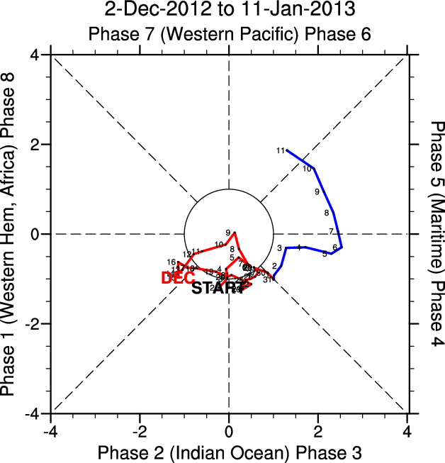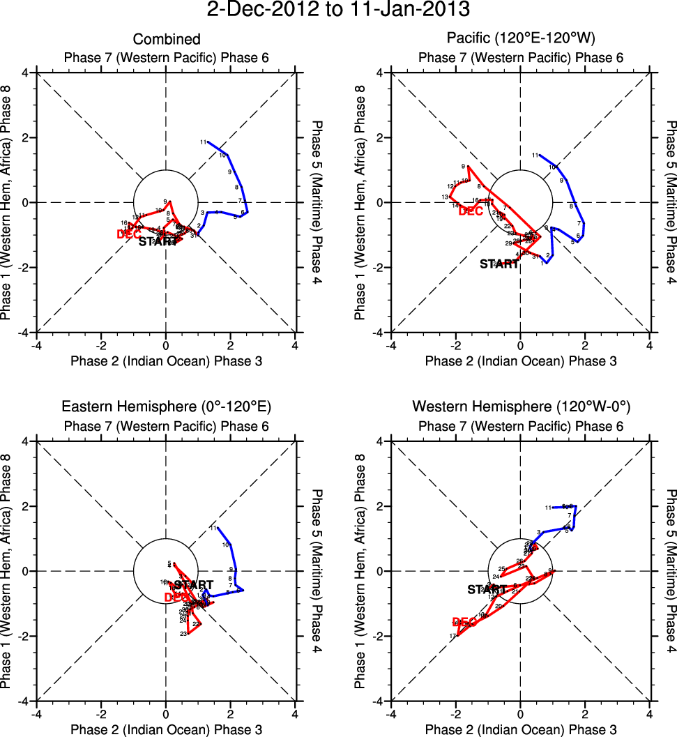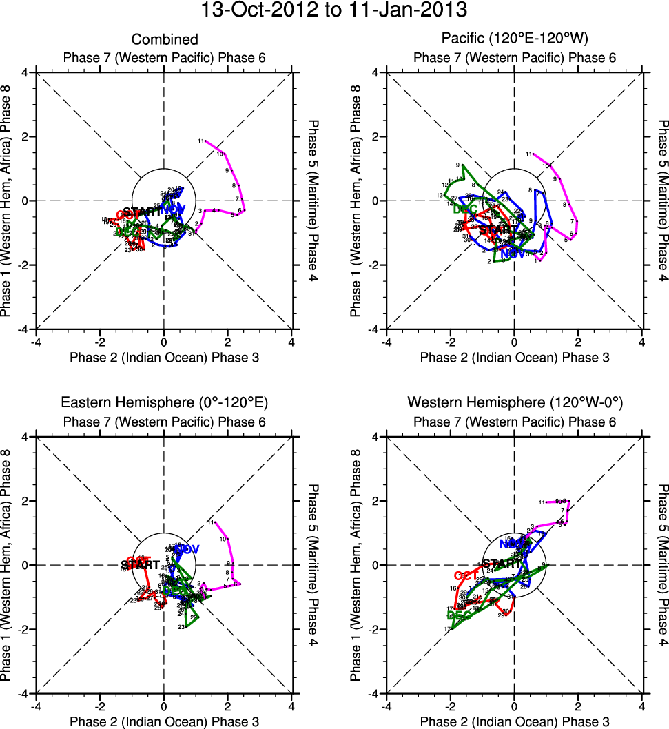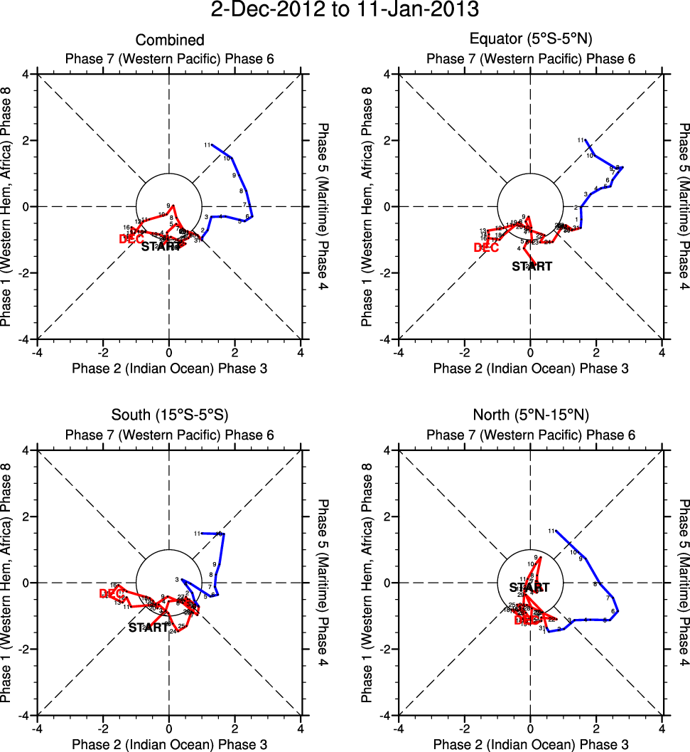 Wheeler and Hendon (2004) constructed the RMM index for monitoring the MJO. This index consists of the first two principal components (PCs) of OLR, 850-hPa zonal wind, and 200-hPa zonal wind averaged 15S-15N.