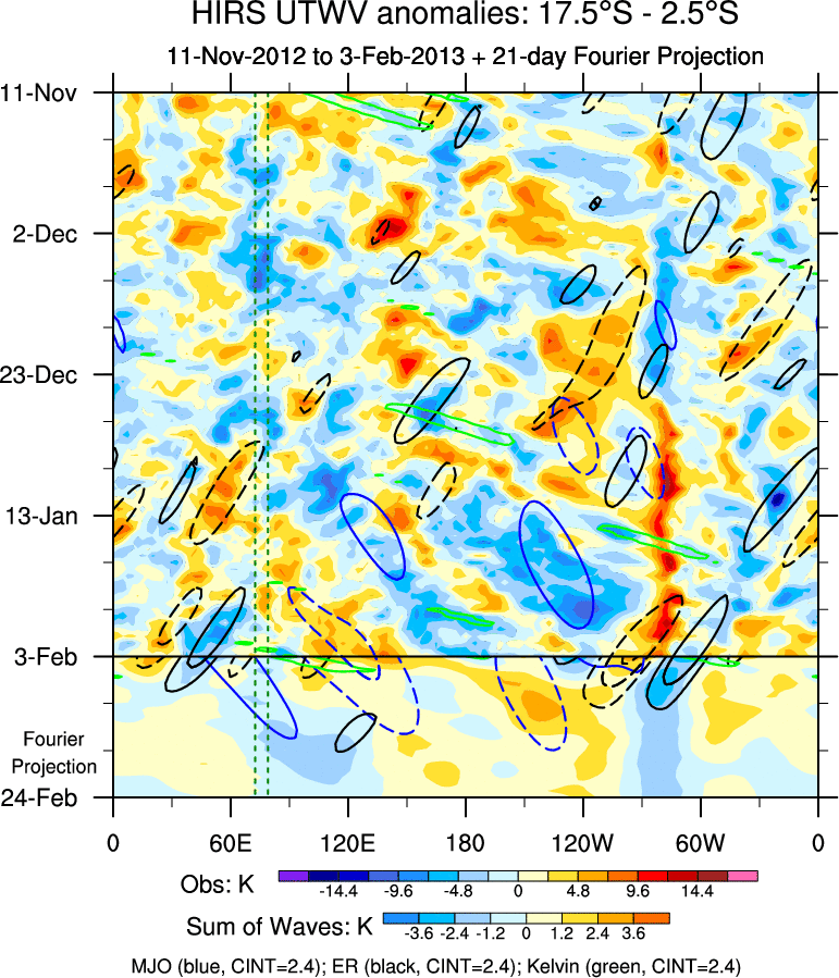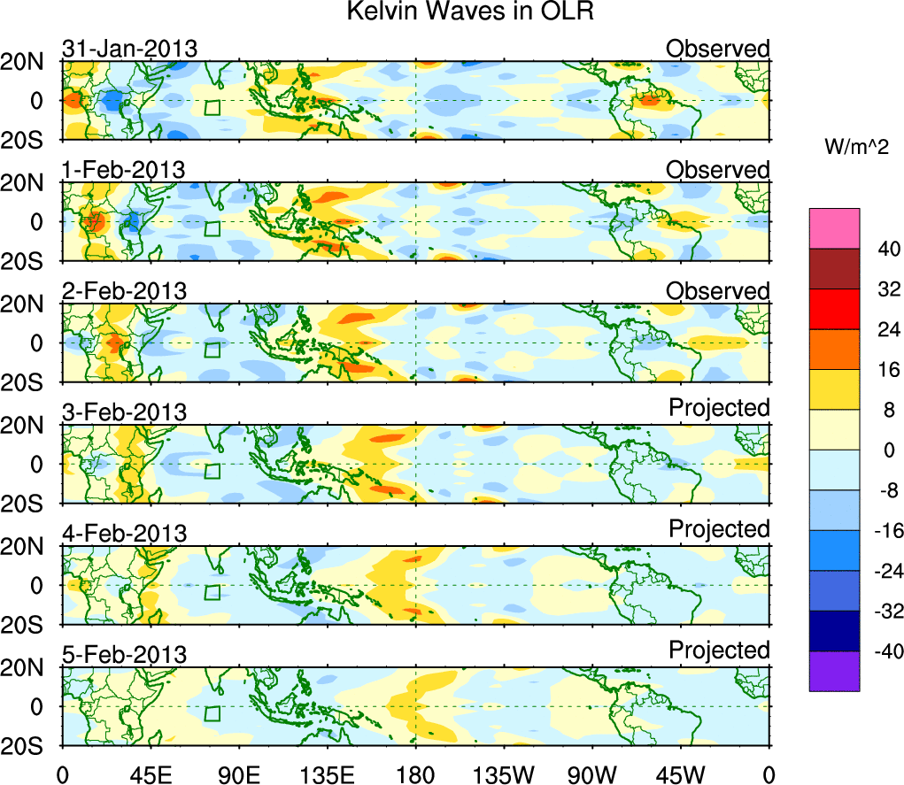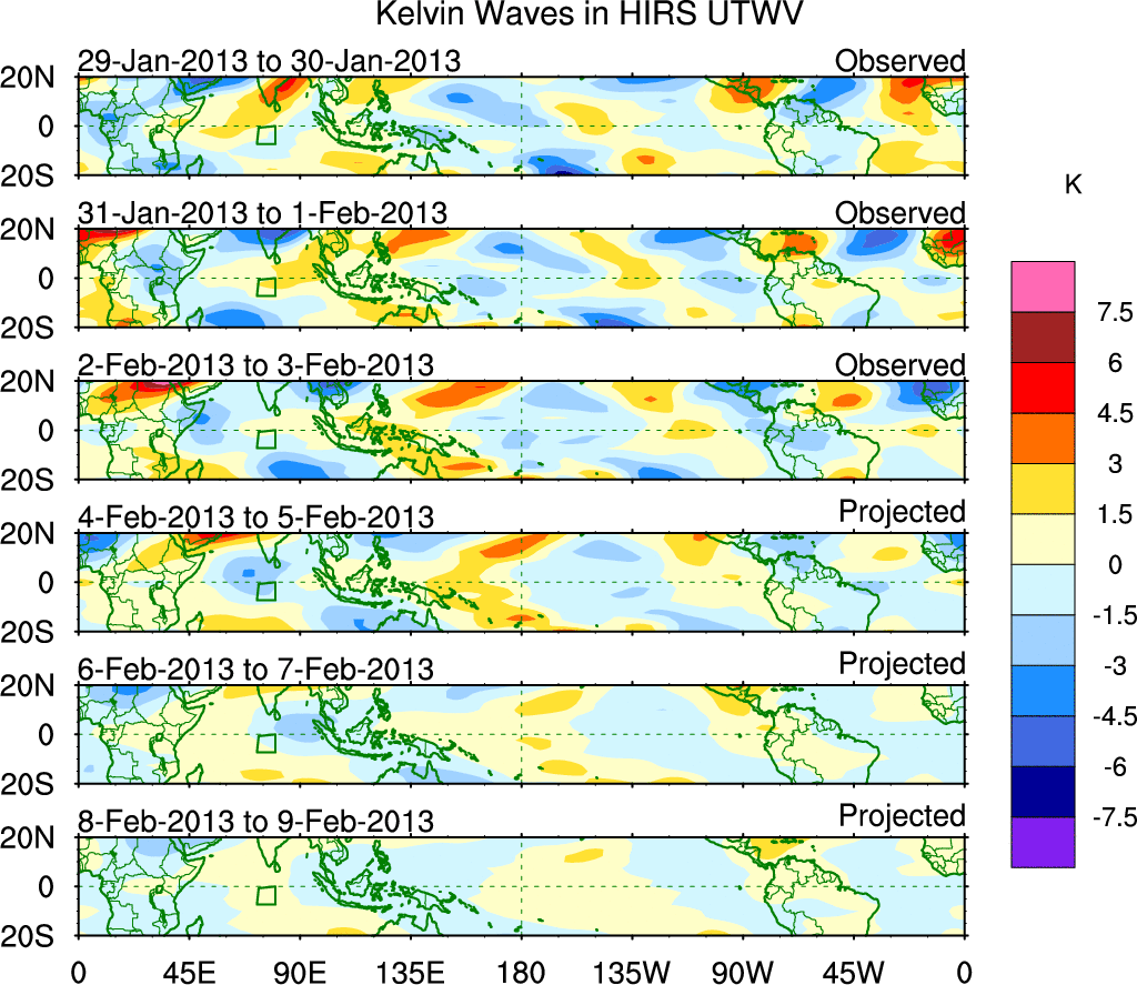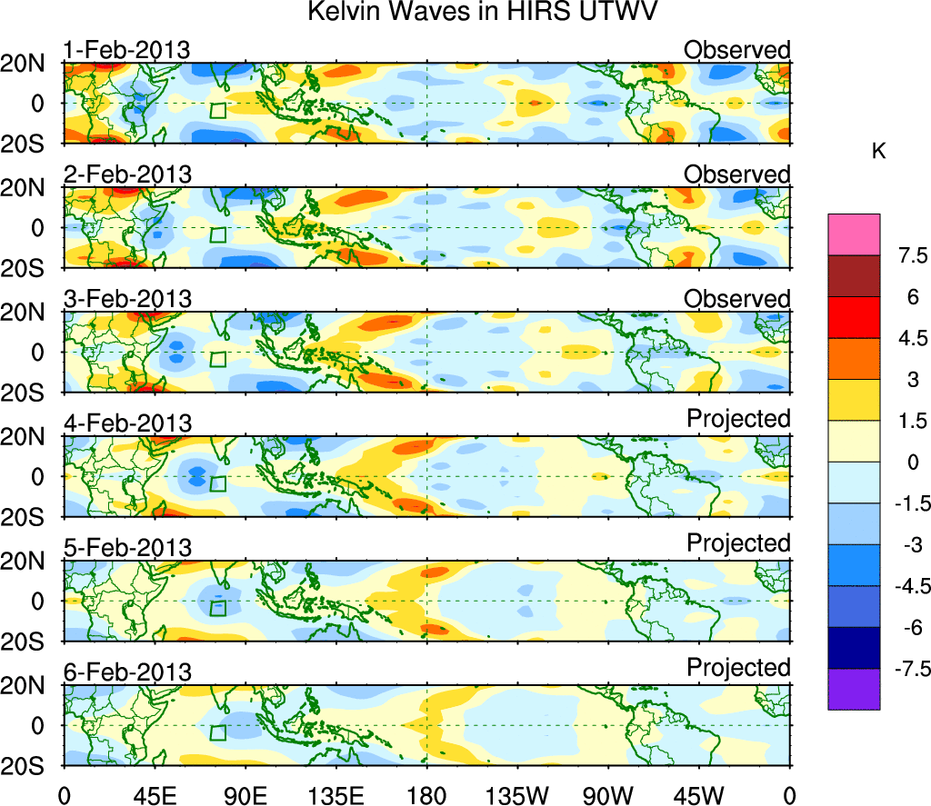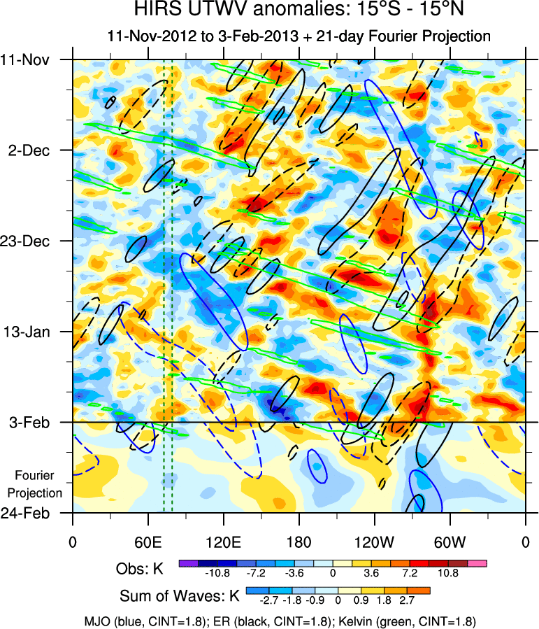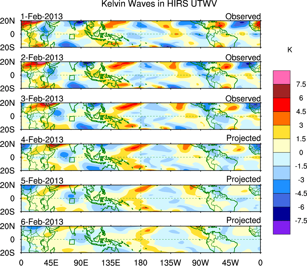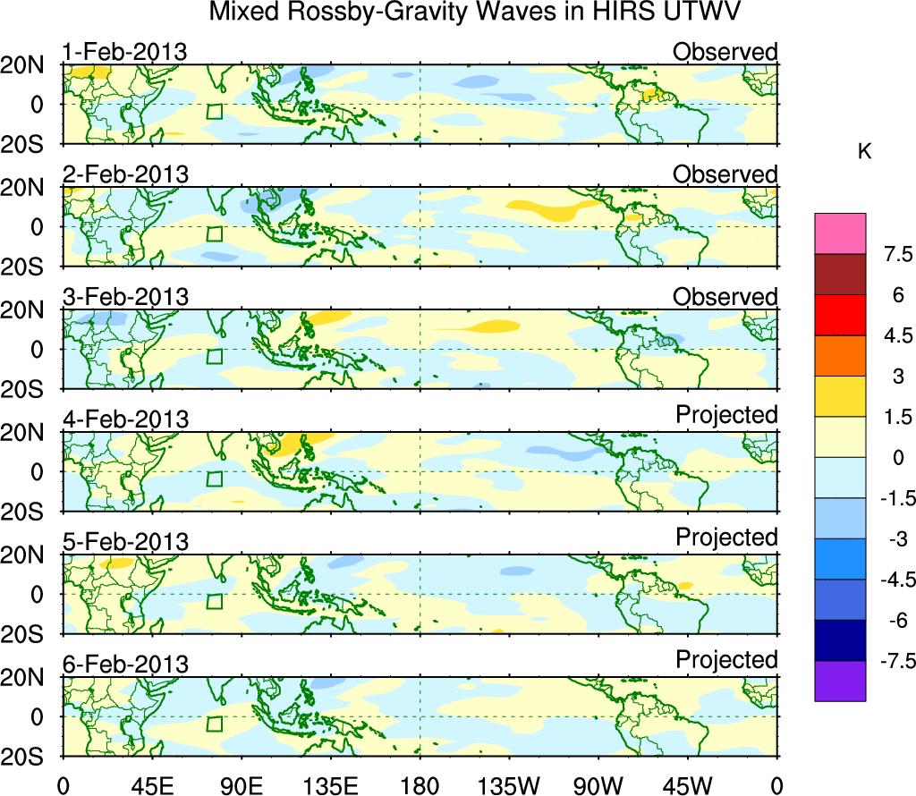 To identify tropical waves in near real-time, the OLR and UTWV data are filtered following Wheeler & Weickmann (2001 MWR). The daily anomalies are calculated using the first 3 harmonics of the seasonal cycle for 1979–2009. Missing values are then filled using linear interpolation in space and time. The most recent 365 days of anomalies are padded with 659 days of zeroes, and the result is filtered for each wave type.