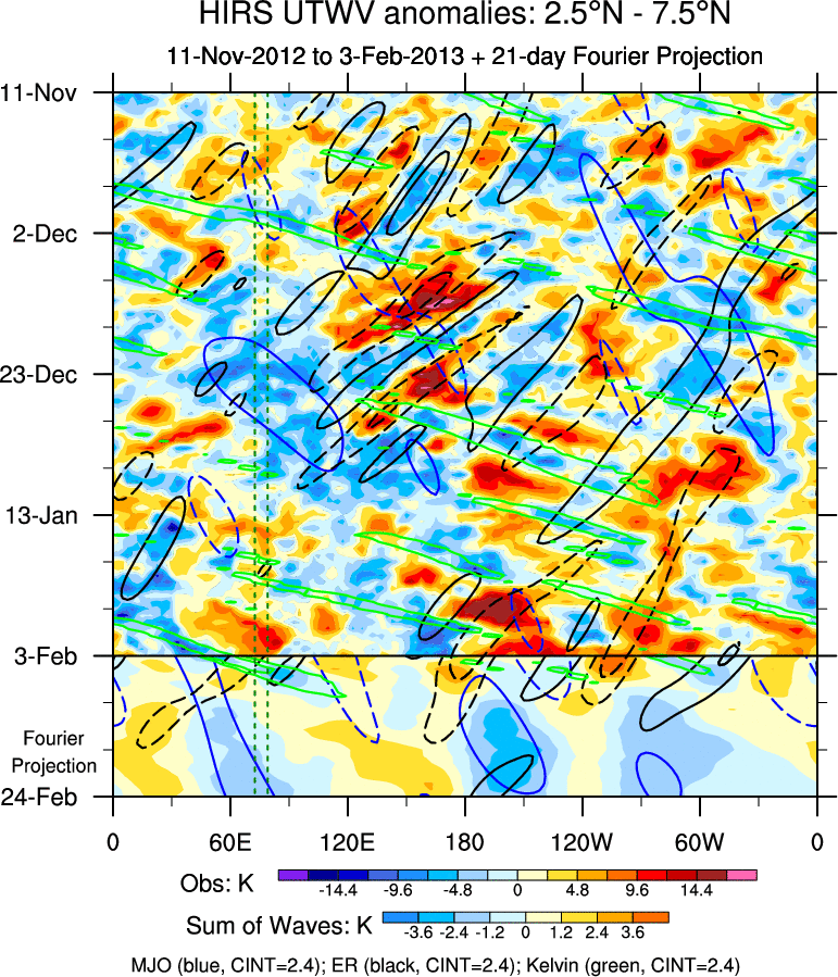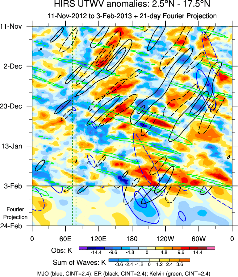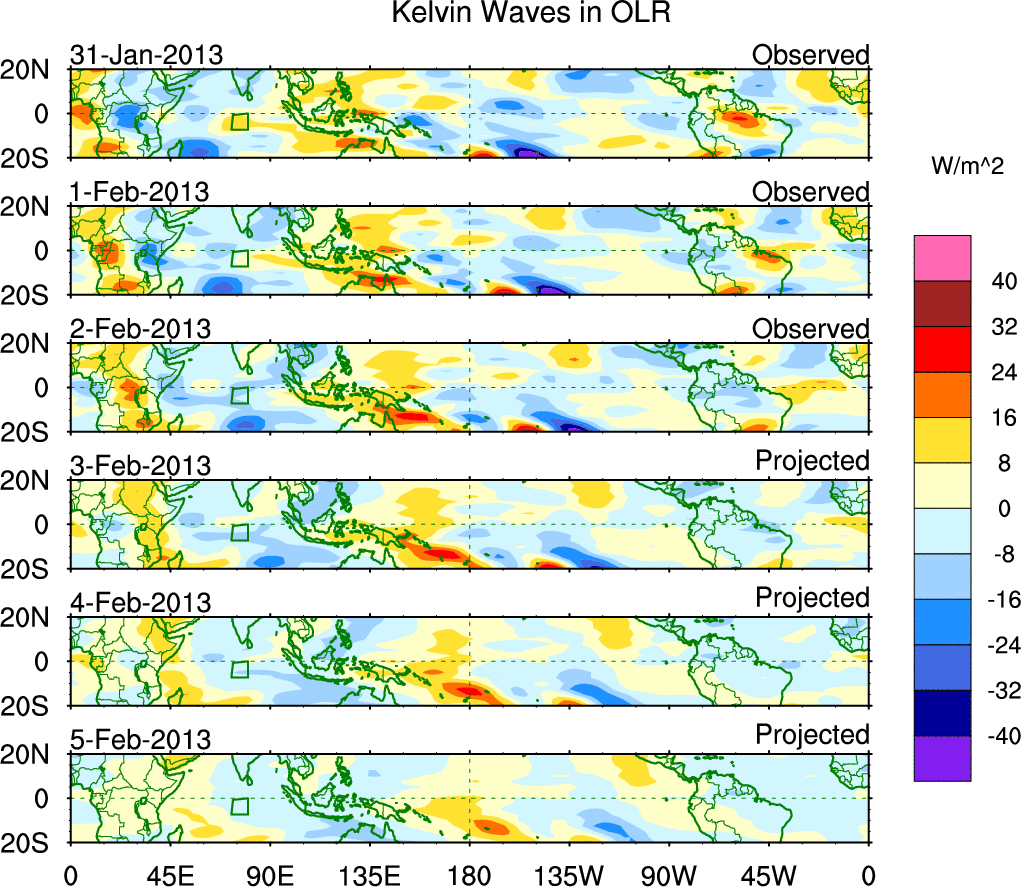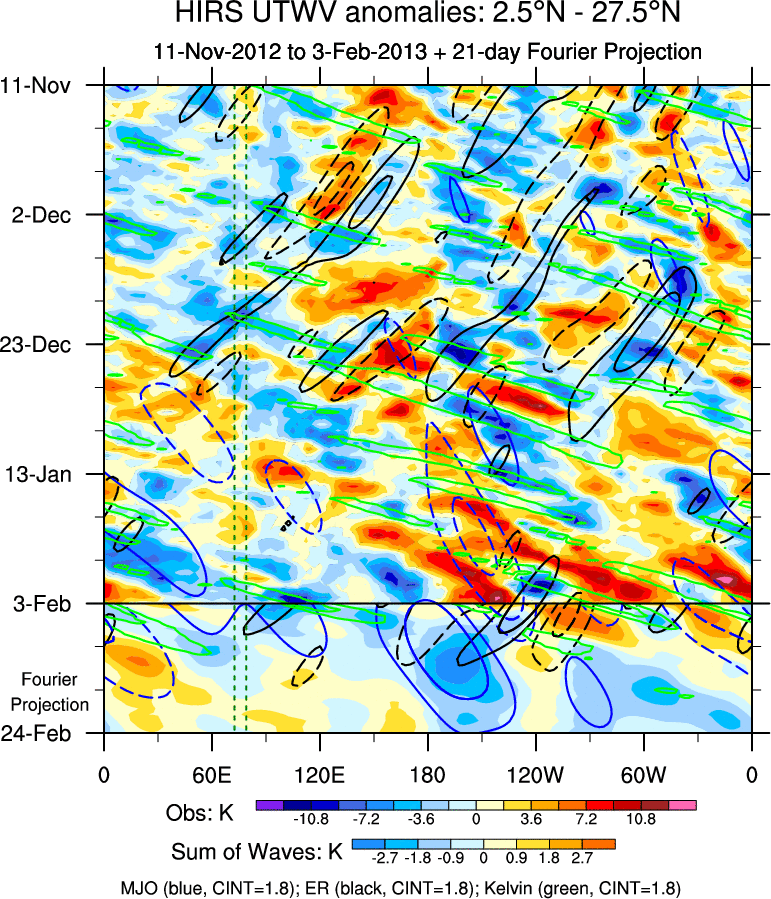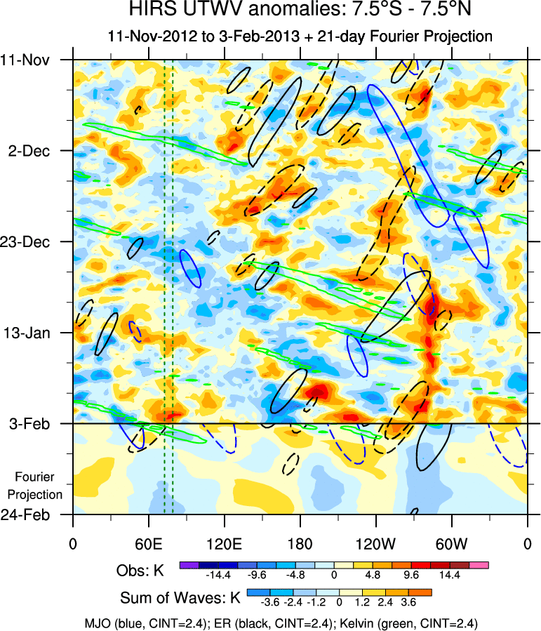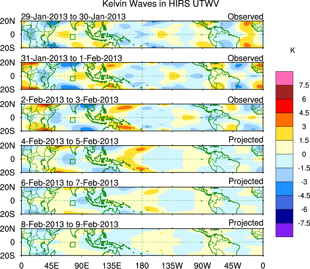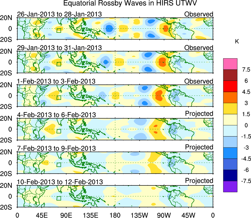 To identify tropical waves in near real-time, the OLR and UTWV data are filtered following Wheeler & Weickmann (2001 MWR). The daily anomalies are calculated using the first 3 harmonics of the seasonal cycle for 1979–2009. Missing values are then filled using linear interpolation in space and time. The most recent 365 days of anomalies are padded with 659 days of zeroes, and the result is filtered for each wave type.