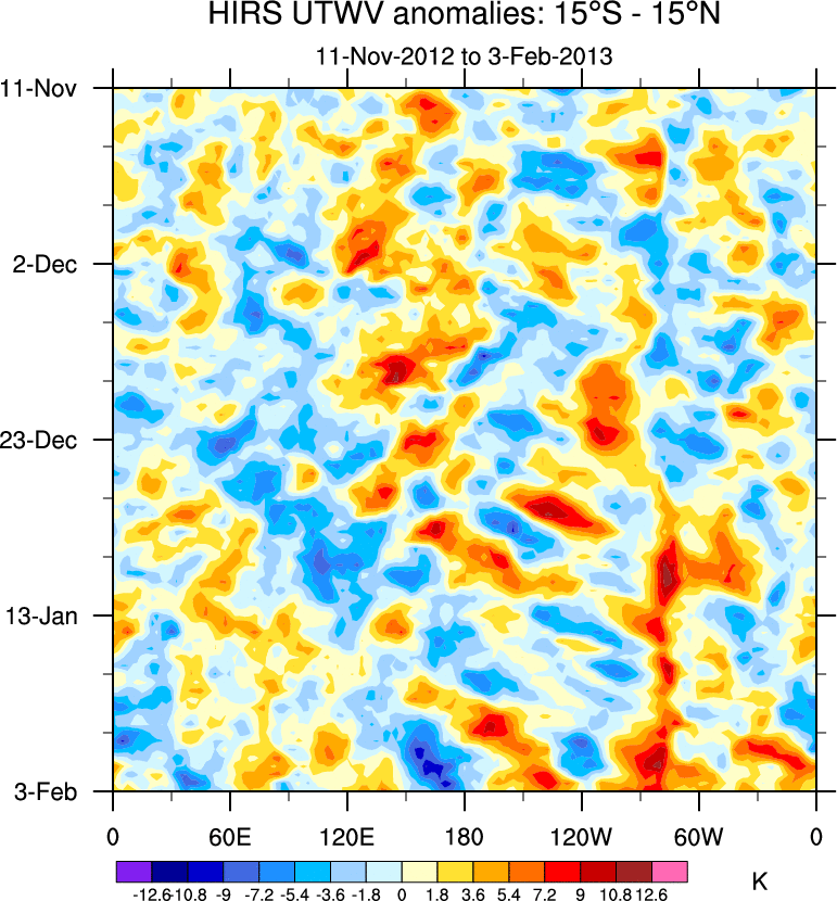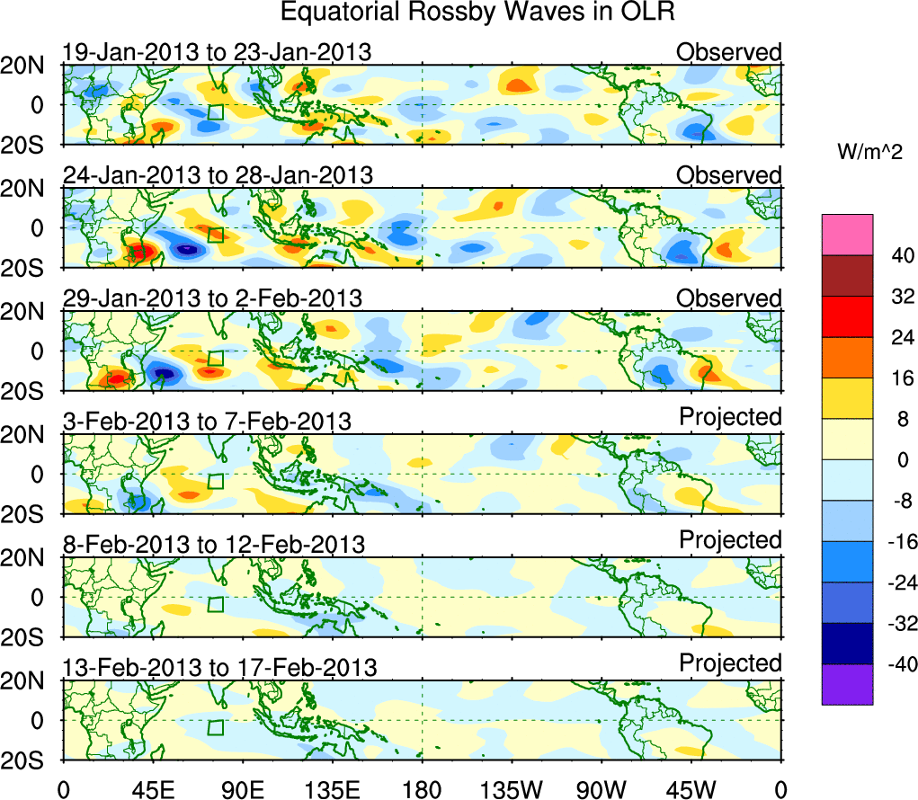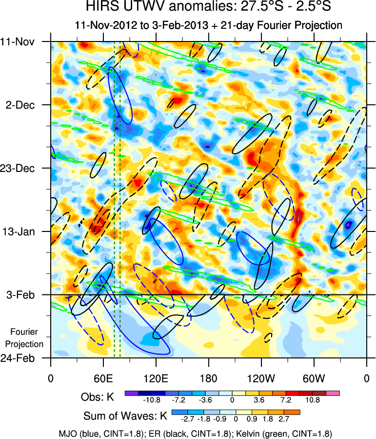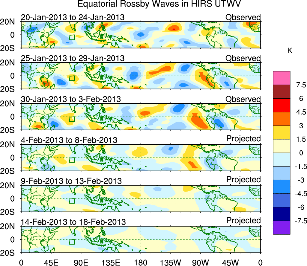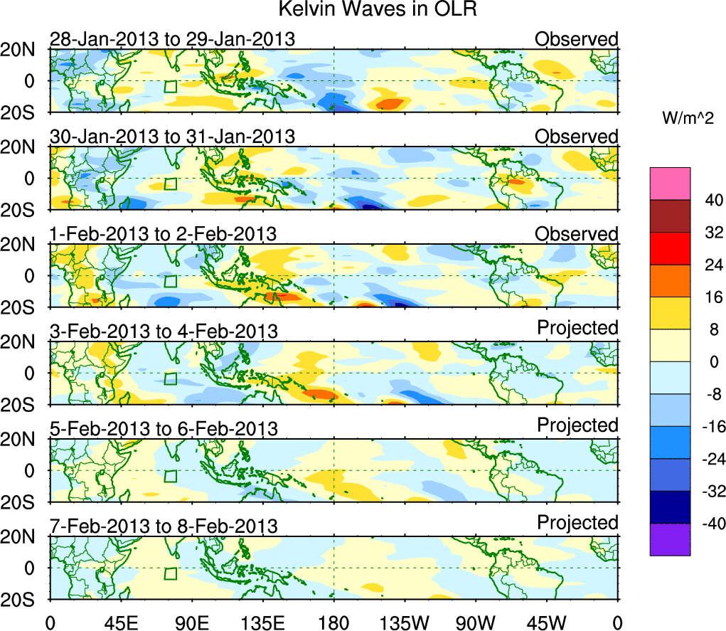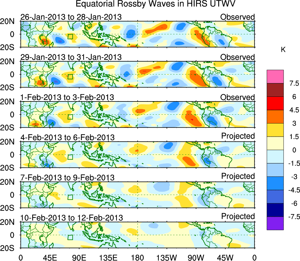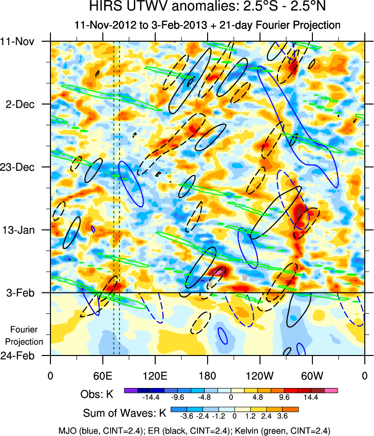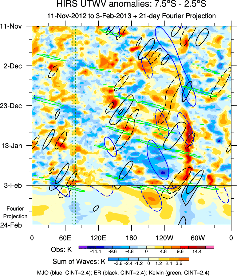 To identify tropical waves in near real-time, the OLR and UTWV data are filtered following Wheeler & Weickmann (2001 MWR). The daily anomalies are calculated using the first 3 harmonics of the seasonal cycle for 1979–2009. Missing values are then filled using linear interpolation in space and time. The most recent 365 days of anomalies are padded with 659 days of zeroes, and the result is filtered for each wave type.