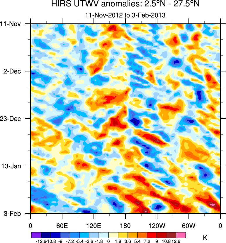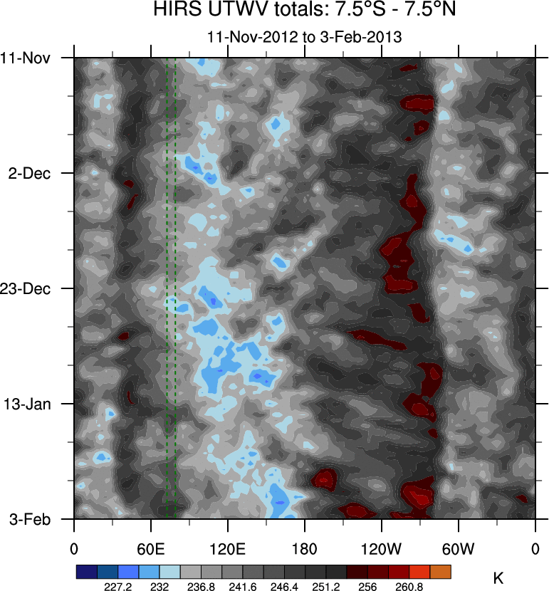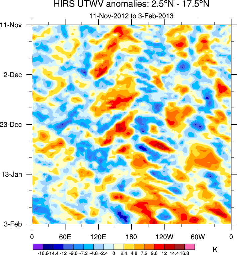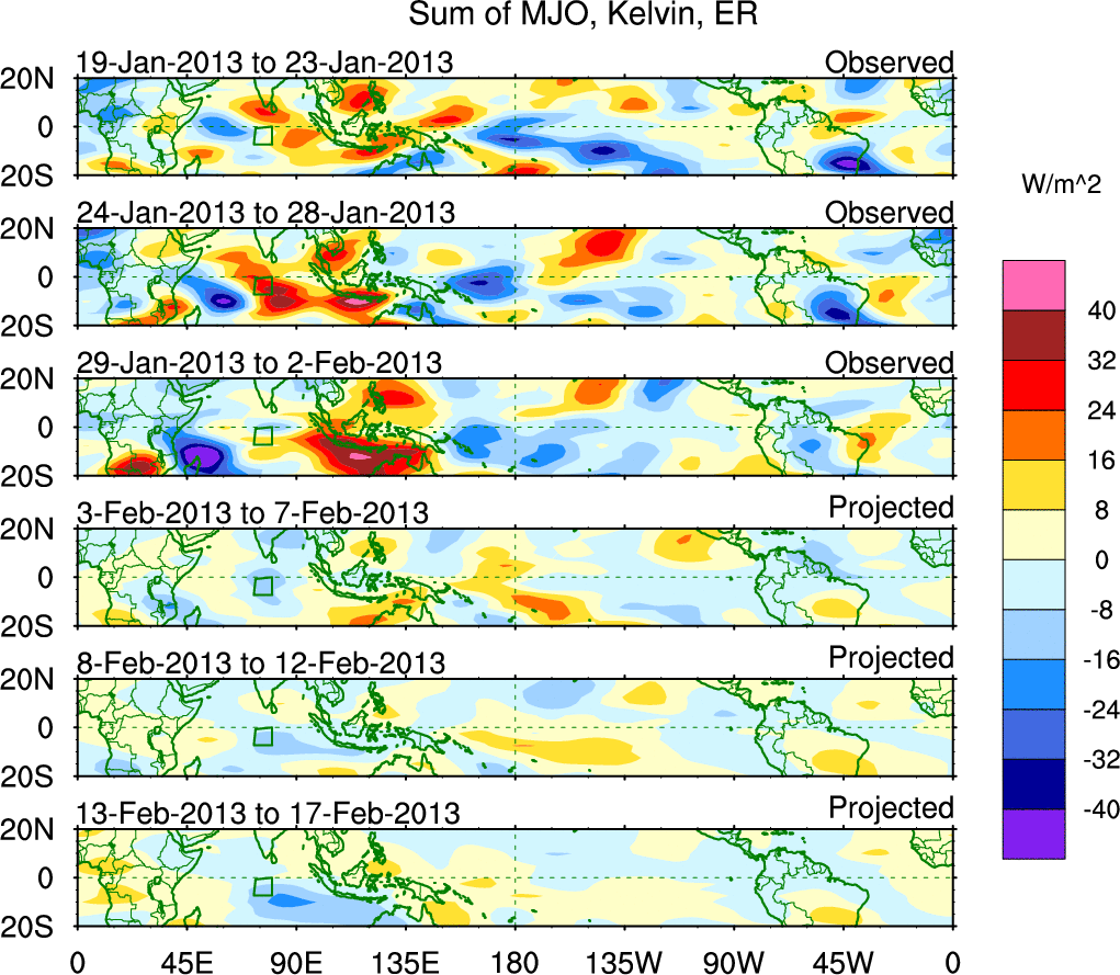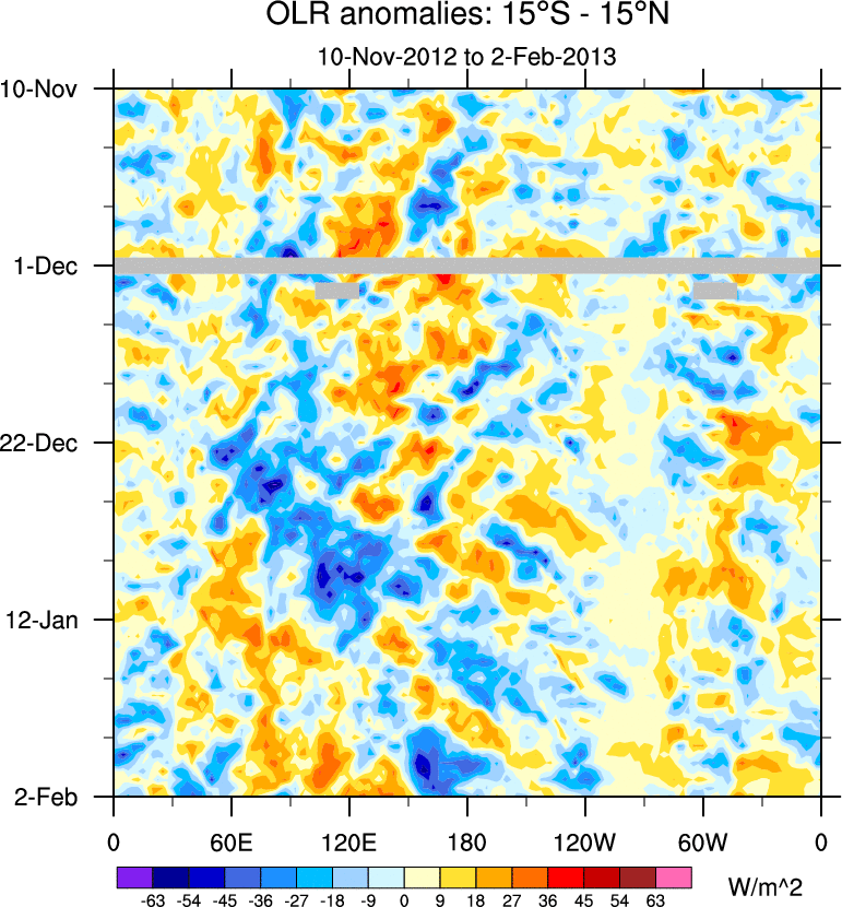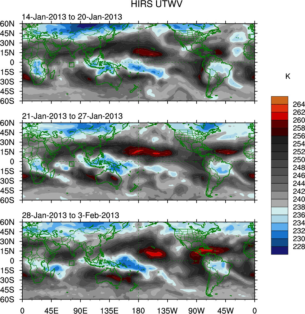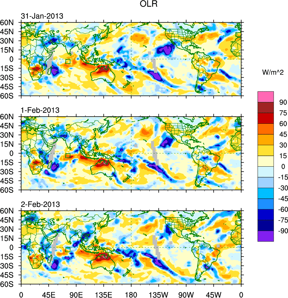 To identify tropical waves in near real-time, the OLR and UTWV data are filtered following Wheeler & Weickmann (2001 MWR). The daily anomalies are calculated using the first 3 harmonics of the seasonal cycle for 1979–2009. Missing values are then filled using linear interpolation in space and time. The most recent 365 days of anomalies are padded with 659 days of zeroes, and the result is filtered for each wave type.