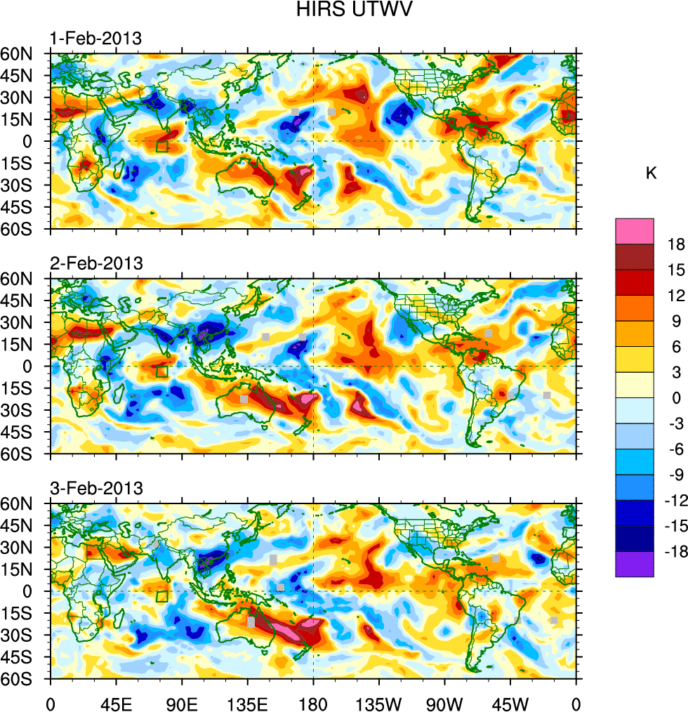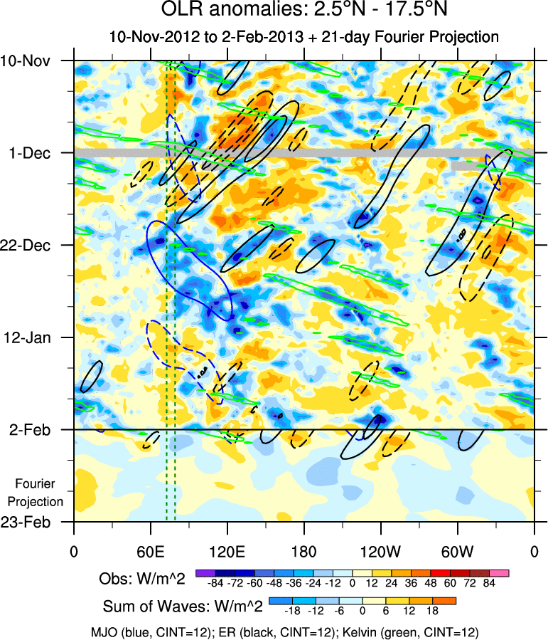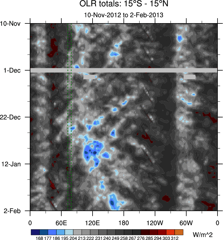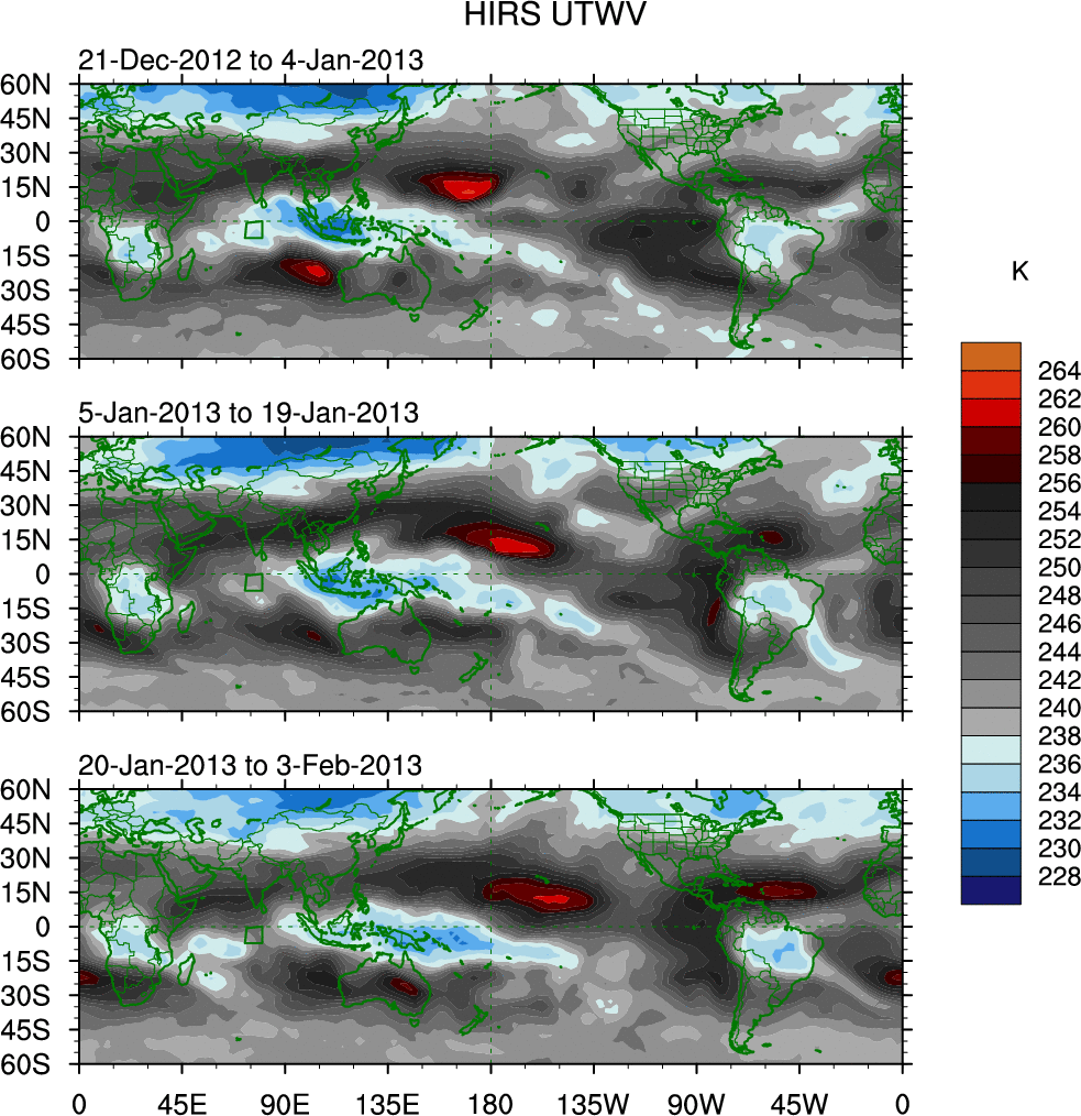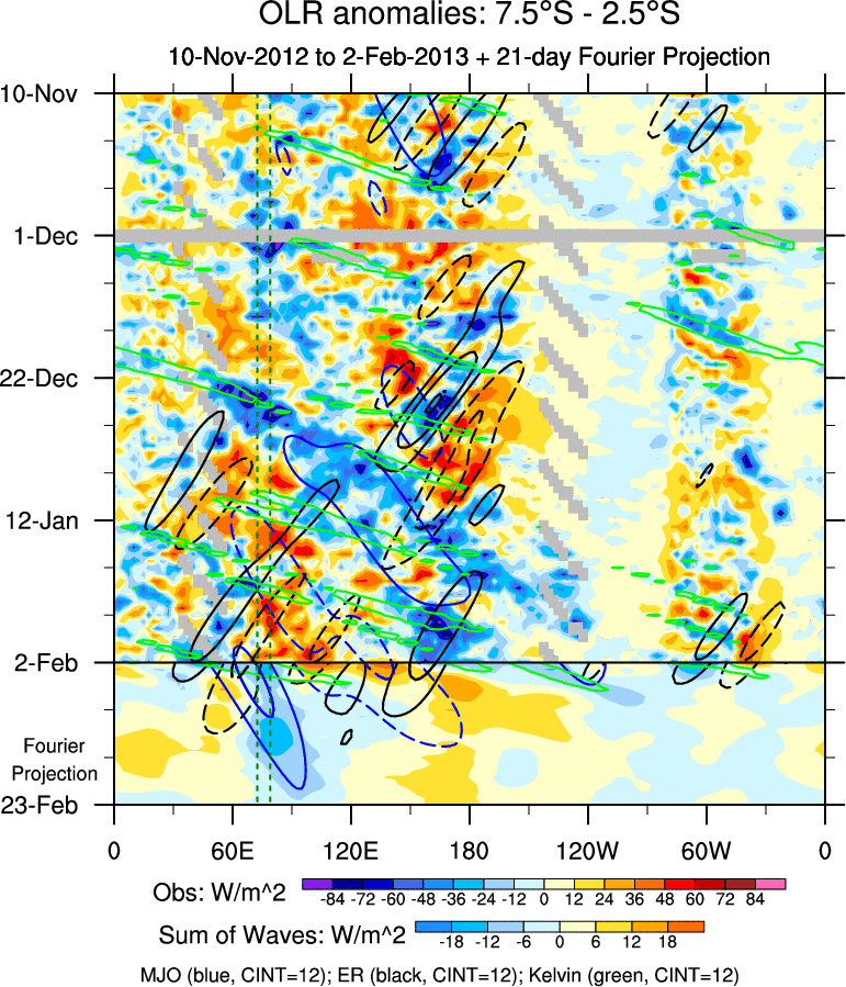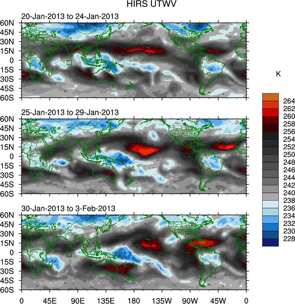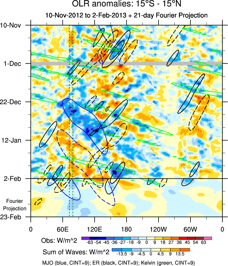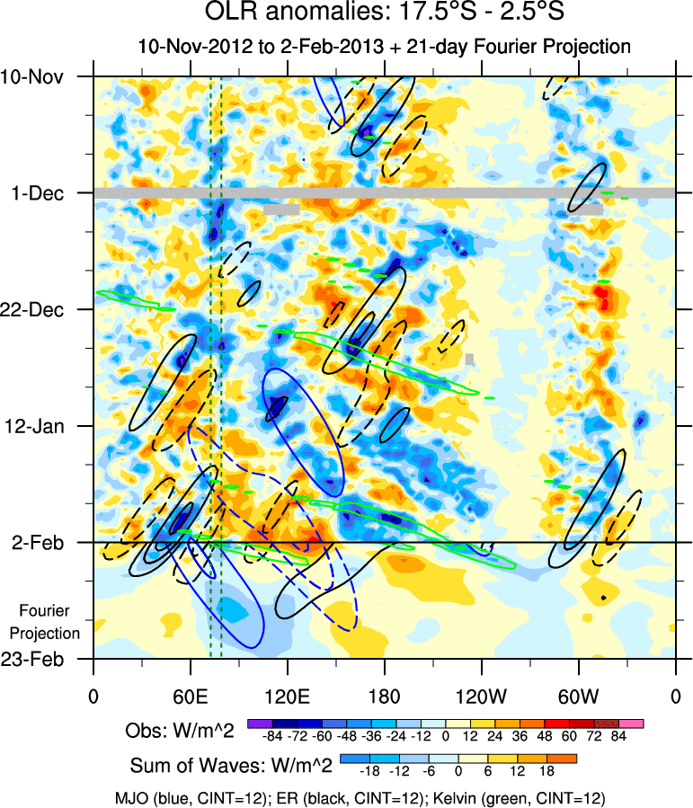 To identify tropical waves in near real-time, the OLR and UTWV data are filtered following Wheeler & Weickmann (2001 MWR). The daily anomalies are calculated using the first 3 harmonics of the seasonal cycle for 1979–2009. Missing values are then filled using linear interpolation in space and time. The most recent 365 days of anomalies are padded with 659 days of zeroes, and the result is filtered for each wave type.