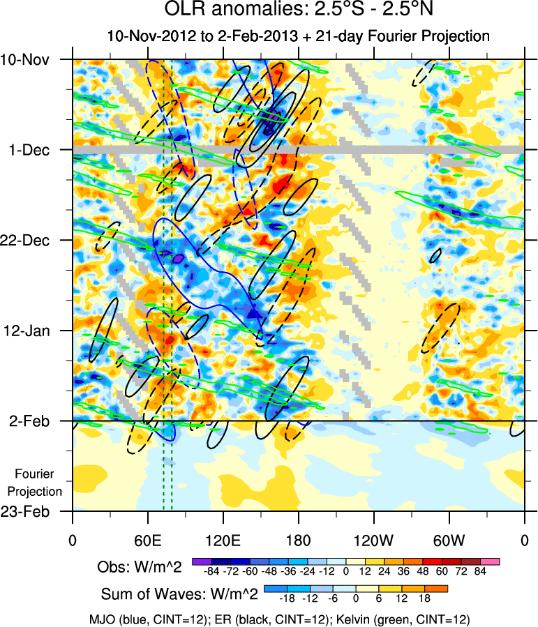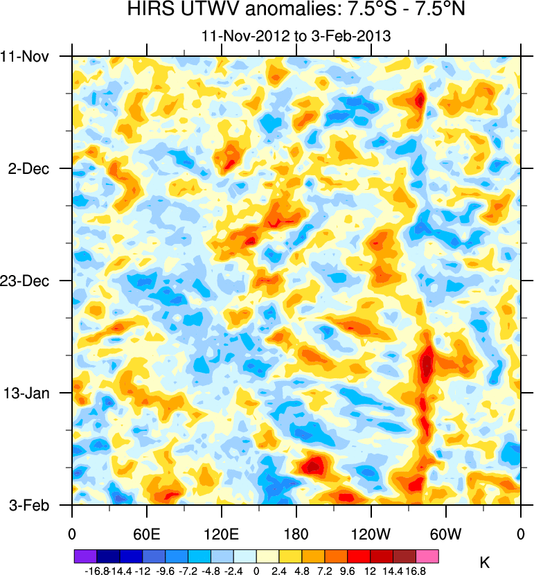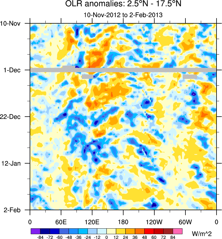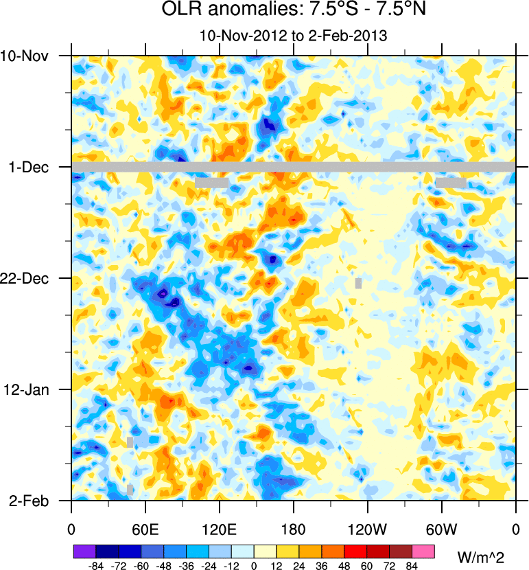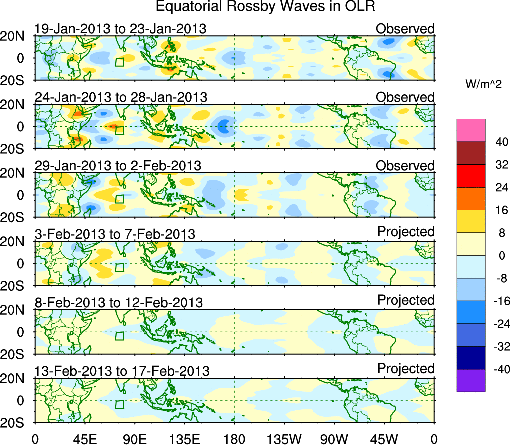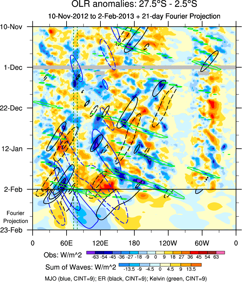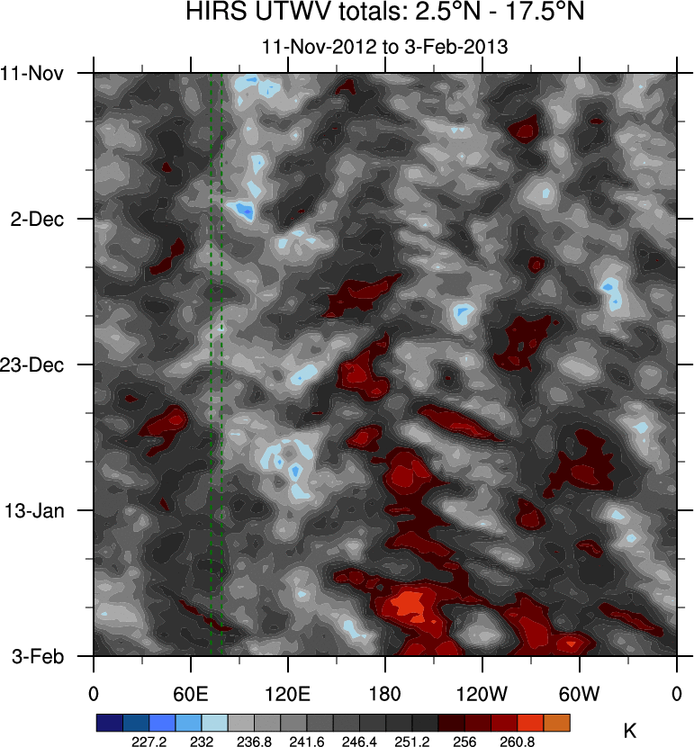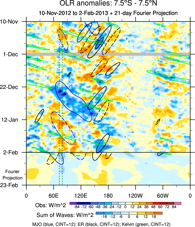 To identify tropical waves in near real-time, the OLR and UTWV data are filtered following Wheeler & Weickmann (2001 MWR). The daily anomalies are calculated using the first 3 harmonics of the seasonal cycle for 1979–2009. Missing values are then filled using linear interpolation in space and time. The most recent 365 days of anomalies are padded with 659 days of zeroes, and the result is filtered for each wave type.