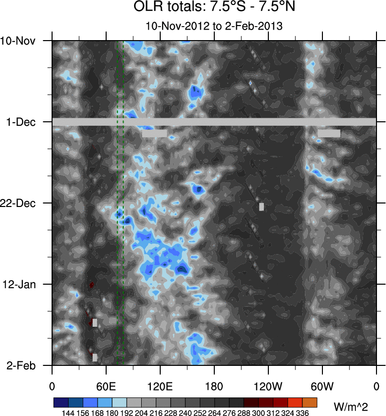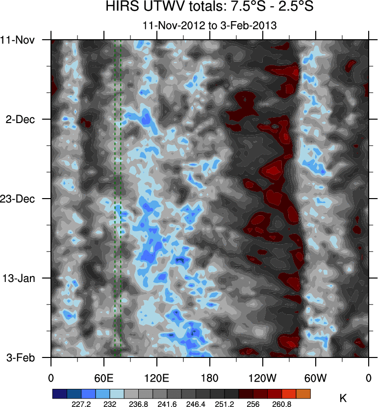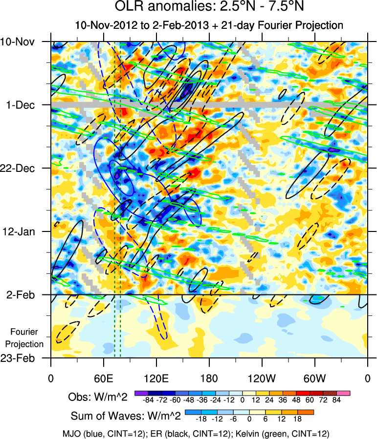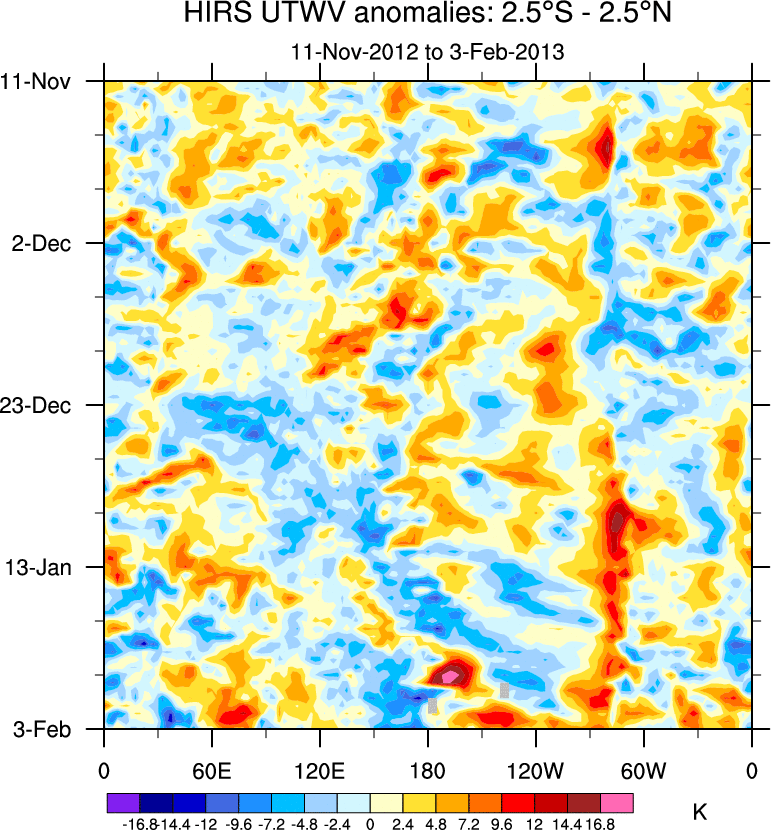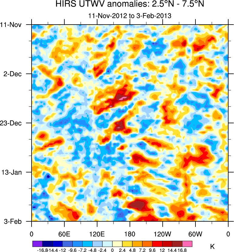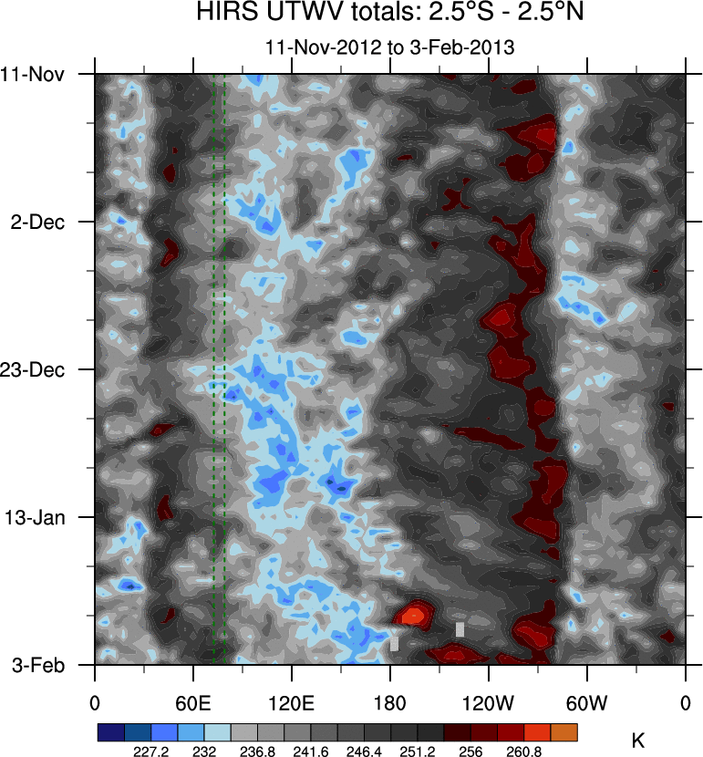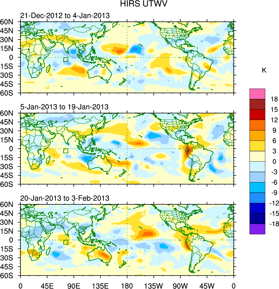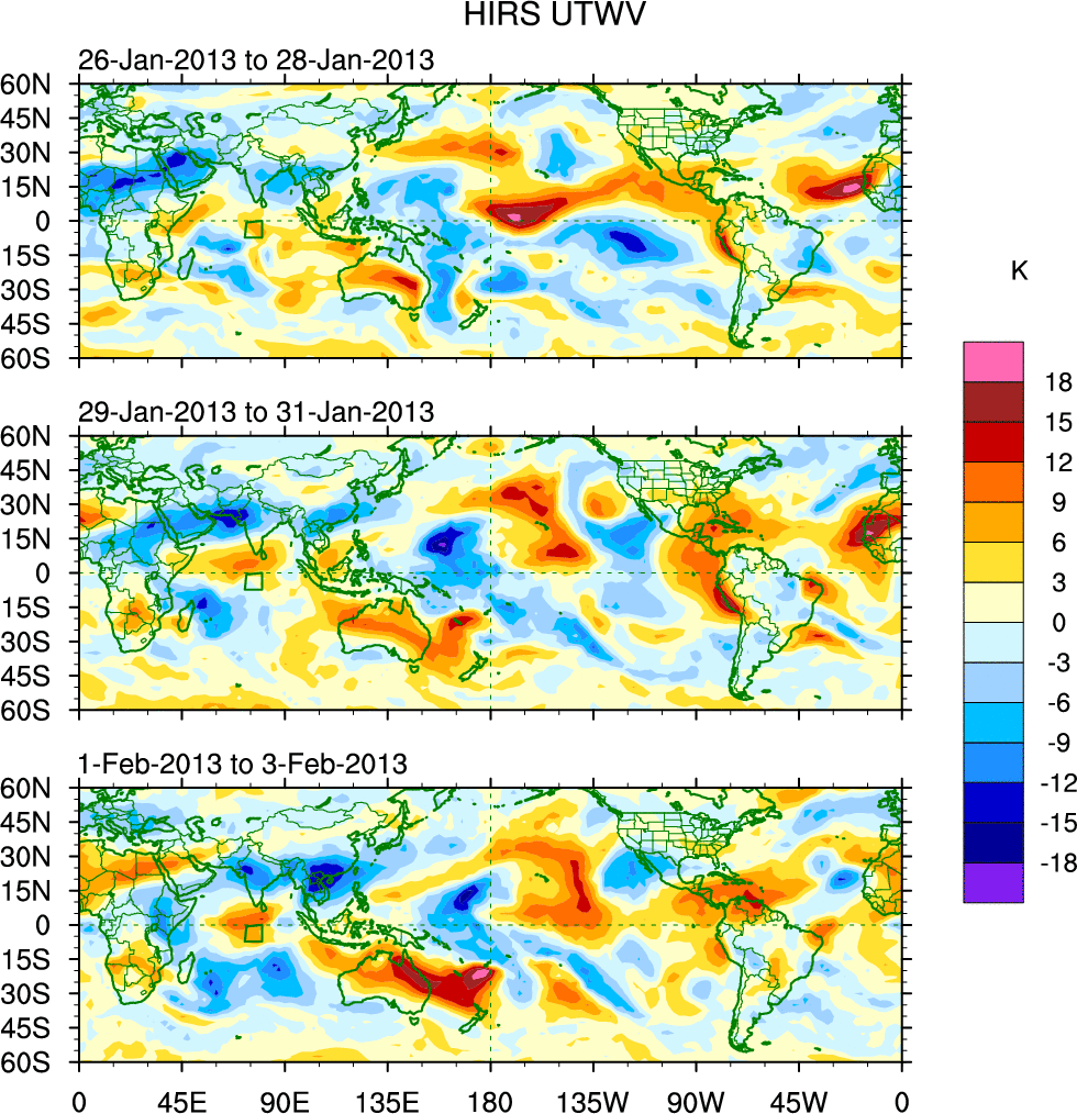 To identify tropical waves in near real-time, the OLR and UTWV data are filtered following Wheeler & Weickmann (2001 MWR). The daily anomalies are calculated using the first 3 harmonics of the seasonal cycle for 1979–2009. Missing values are then filled using linear interpolation in space and time. The most recent 365 days of anomalies are padded with 659 days of zeroes, and the result is filtered for each wave type.