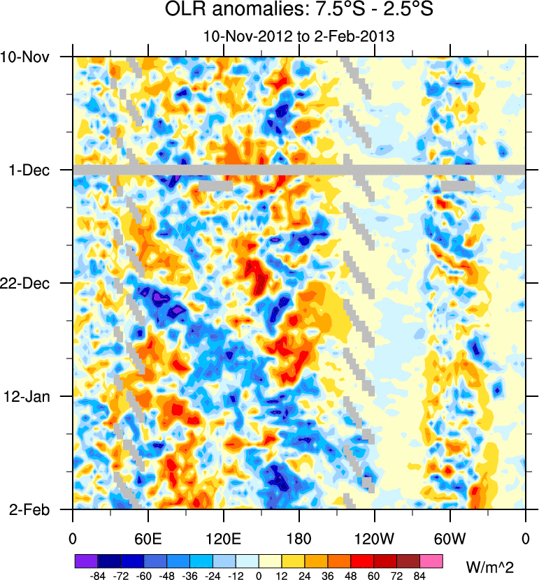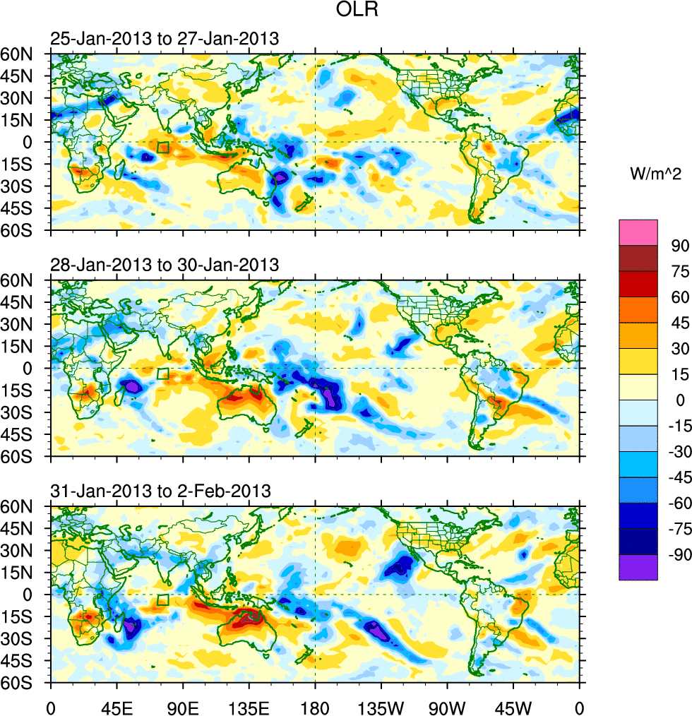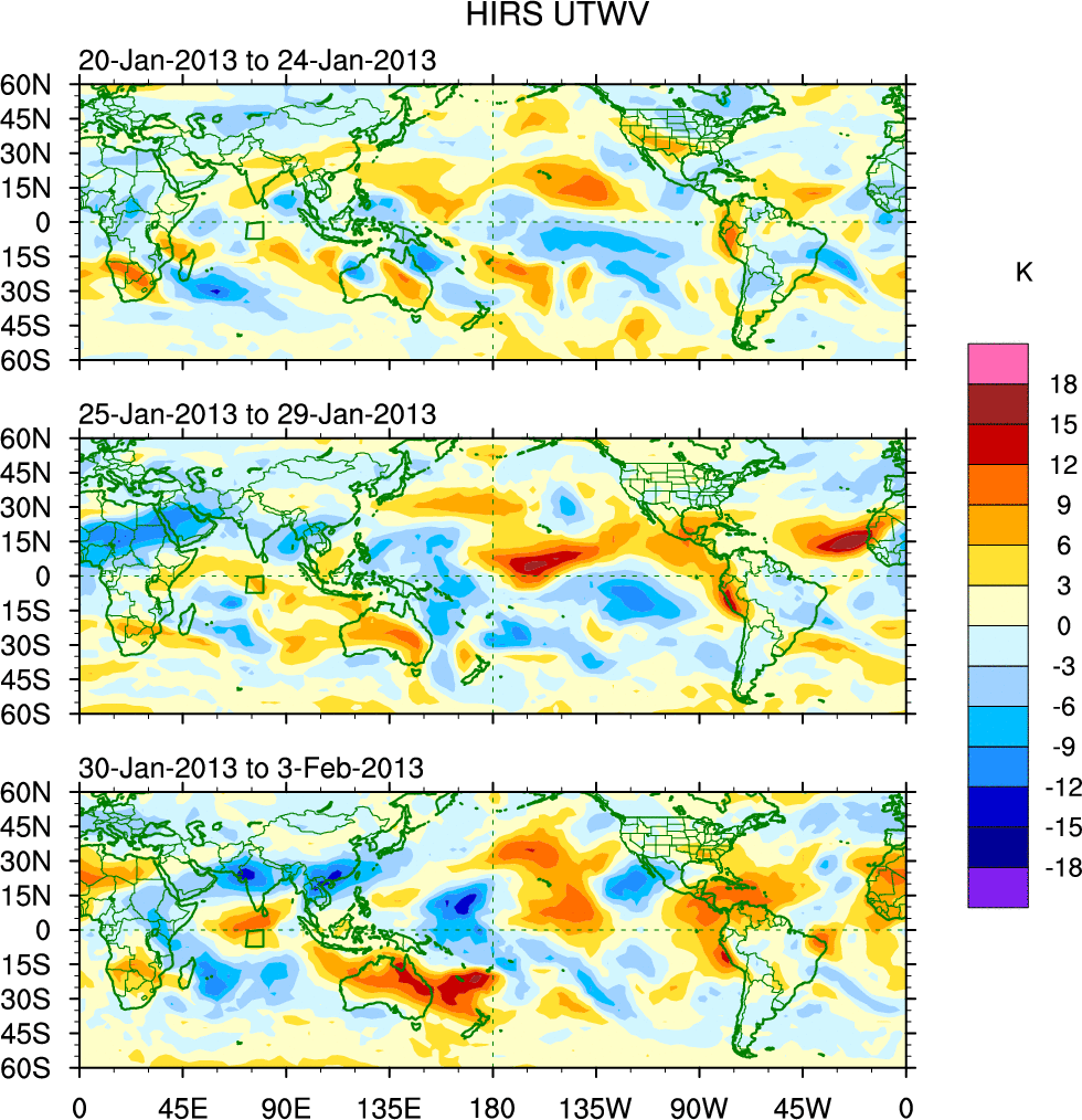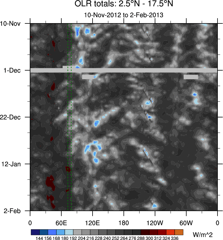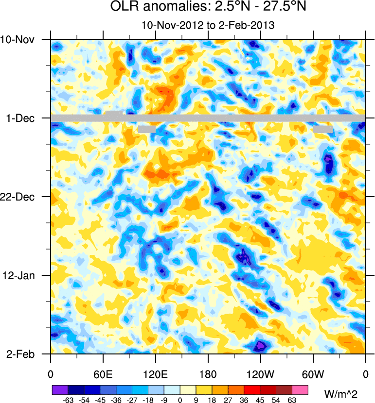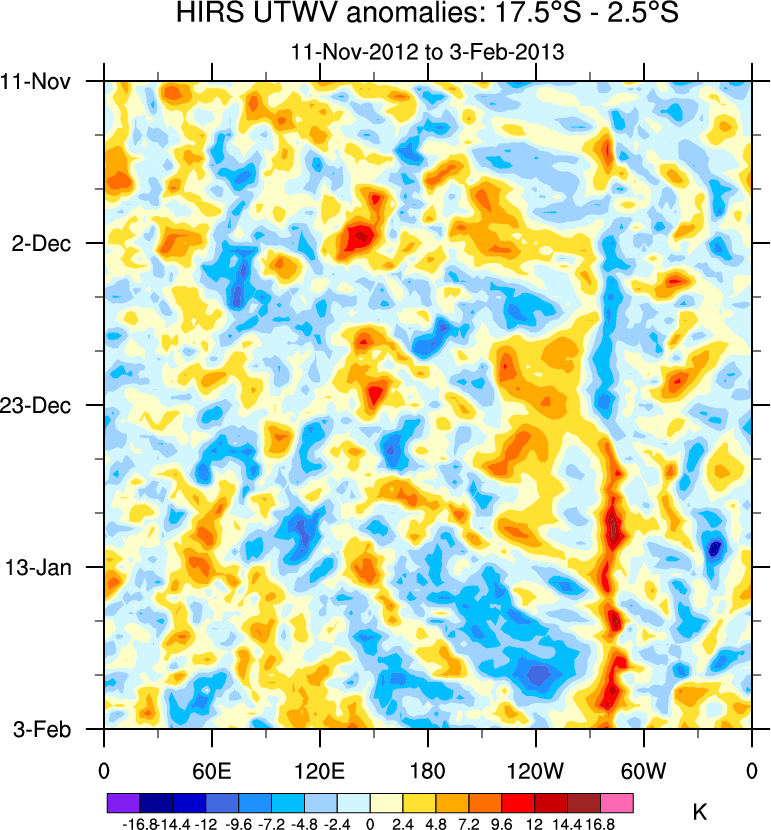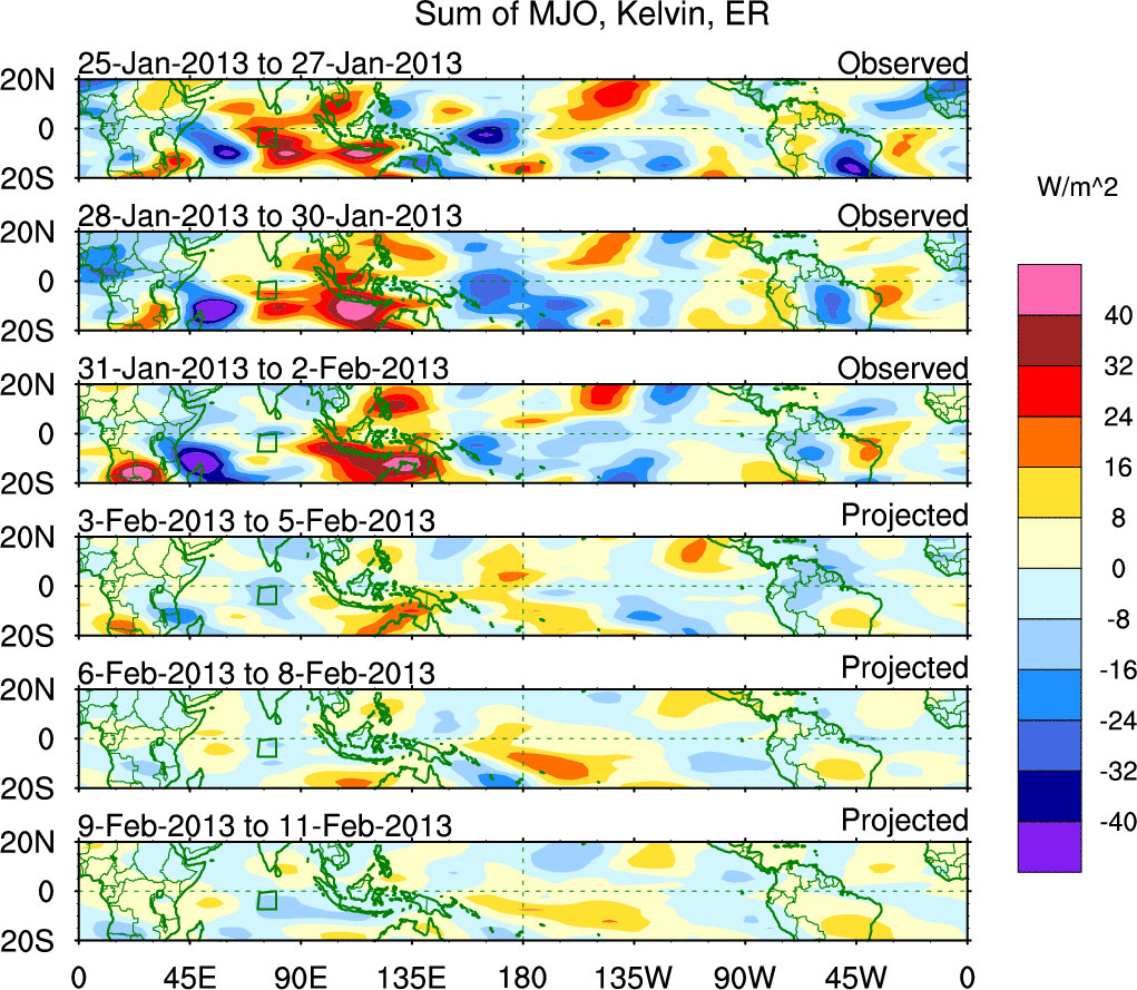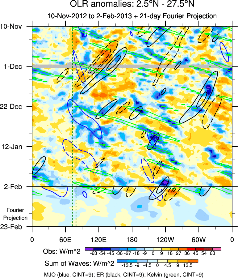 To identify tropical waves in near real-time, the OLR and UTWV data are filtered following Wheeler & Weickmann (2001 MWR). The daily anomalies are calculated using the first 3 harmonics of the seasonal cycle for 1979–2009. Missing values are then filled using linear interpolation in space and time. The most recent 365 days of anomalies are padded with 659 days of zeroes, and the result is filtered for each wave type.