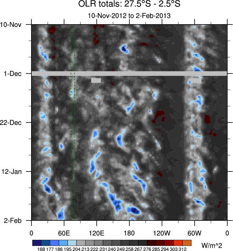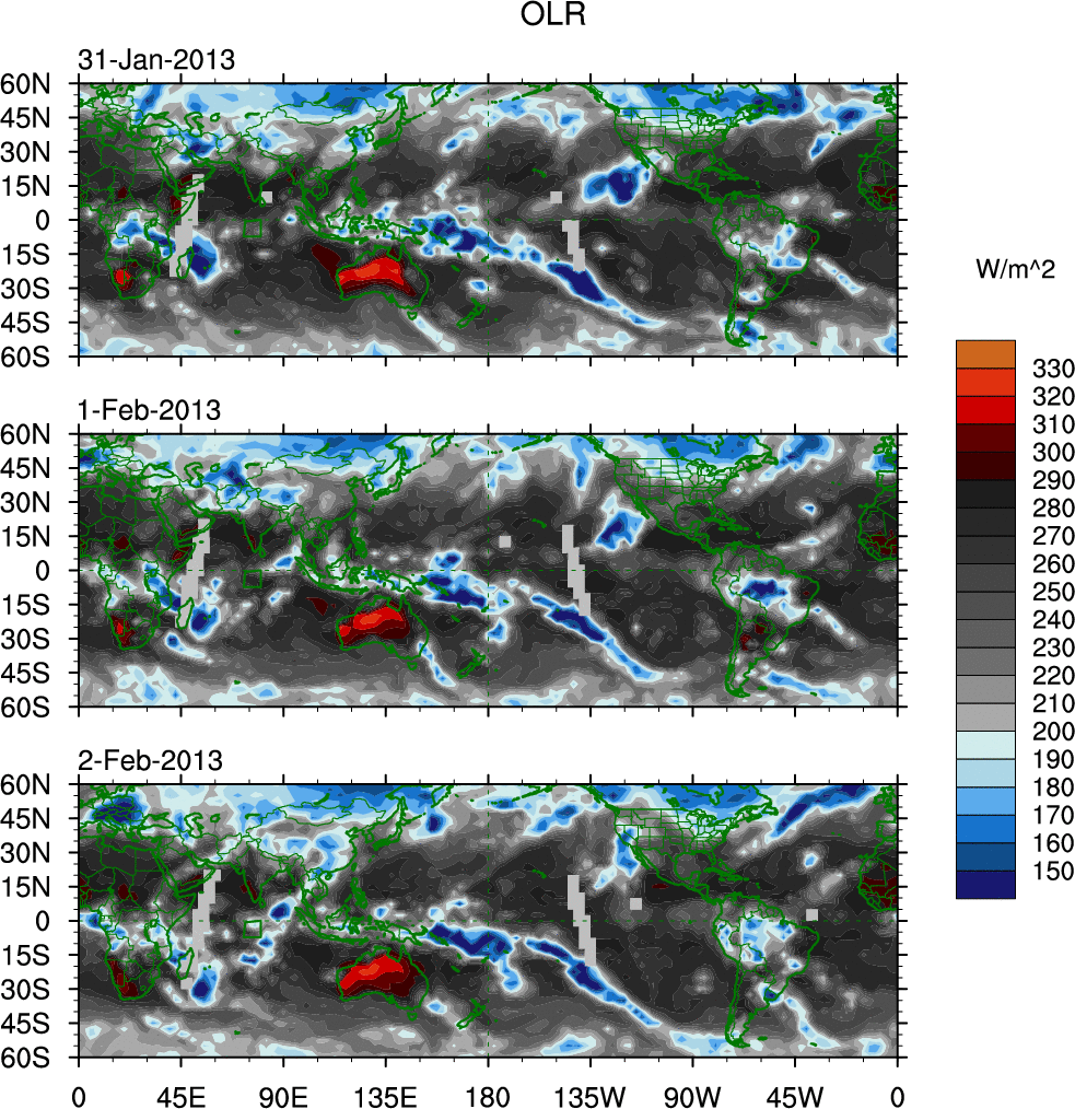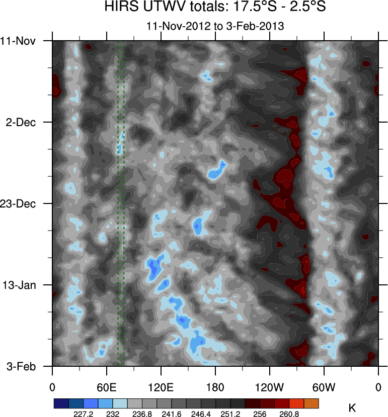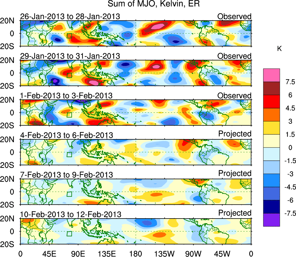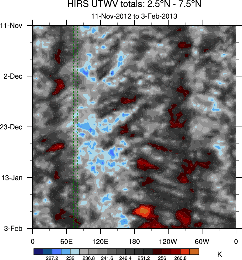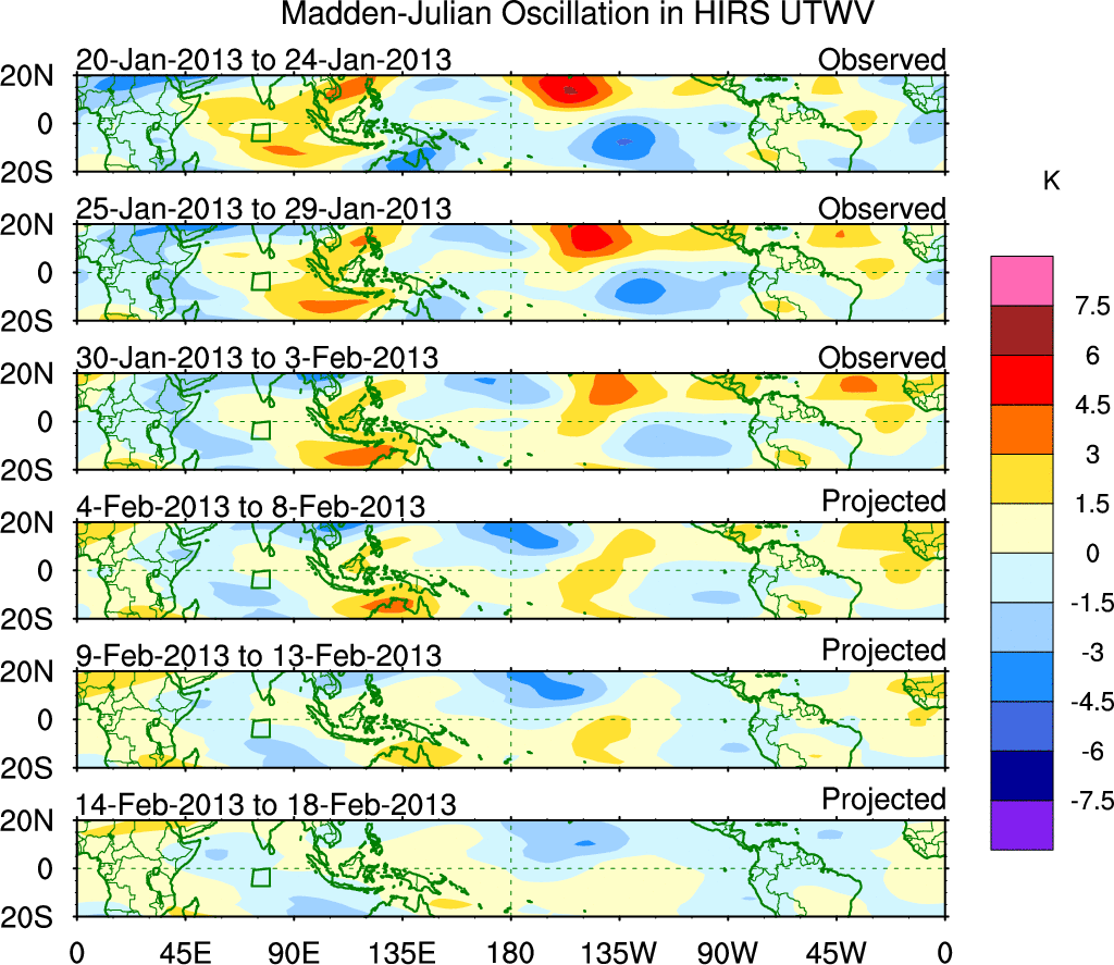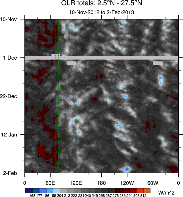 To identify tropical waves in near real-time, the OLR and UTWV data are filtered following Wheeler & Weickmann (2001 MWR). The daily anomalies are calculated using the first 3 harmonics of the seasonal cycle for 1979–2009. Missing values are then filled using linear interpolation in space and time. The most recent 365 days of anomalies are padded with 659 days of zeroes, and the result is filtered for each wave type.